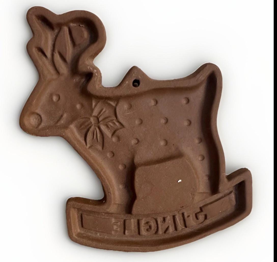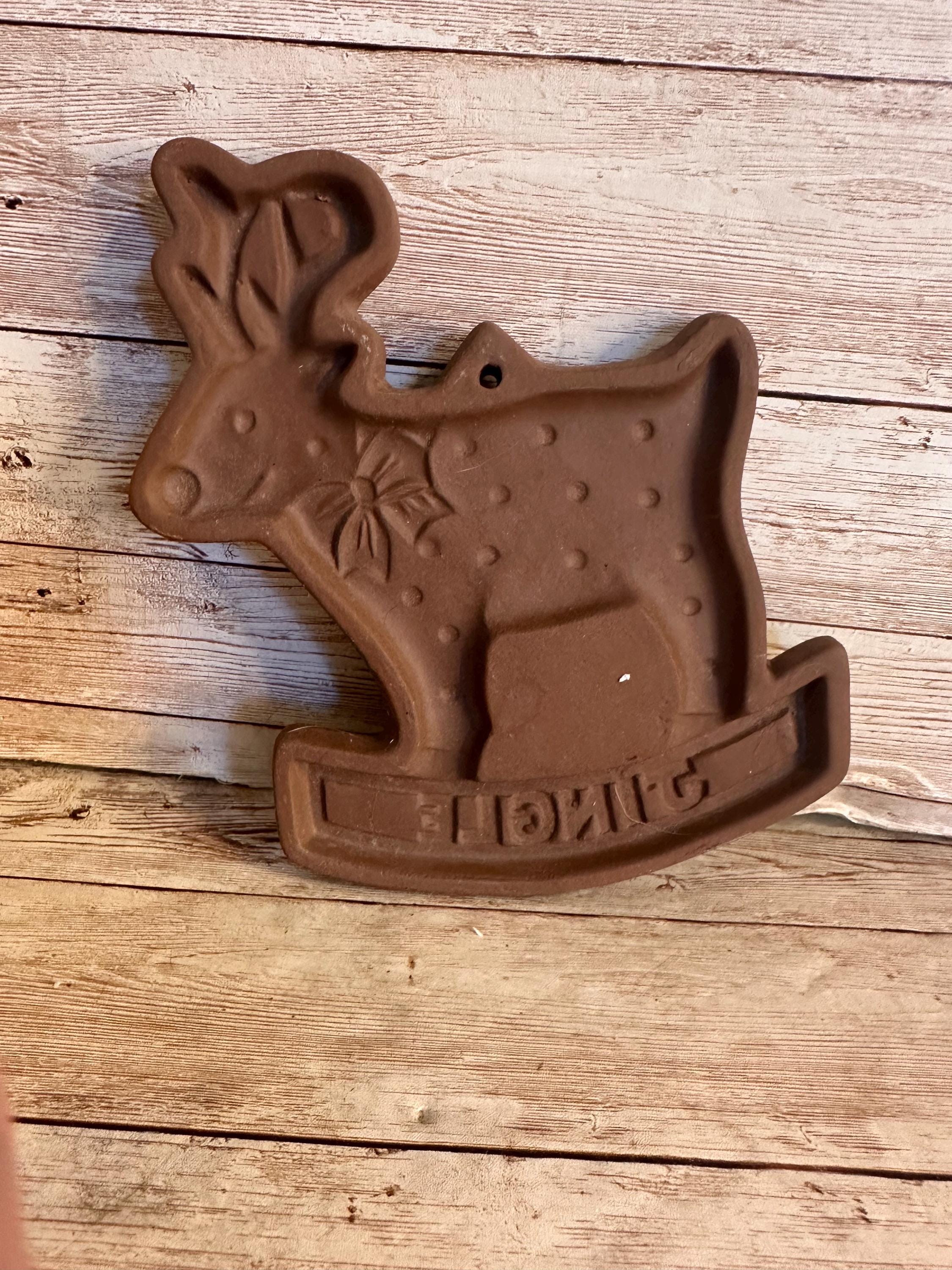Craft your own festive treats with the Vintage Cookie Mold from Hartstone Gear, featuring a charming reindeer design that adds a touch of Christmas cheer to your baking. This stoneware mold is heat resistant and designed for easy cleaning, making it a practical choice for holiday baking sessions. The rich brown color and durable construction reflect the quality of a product made in the United States during the 1980s.
