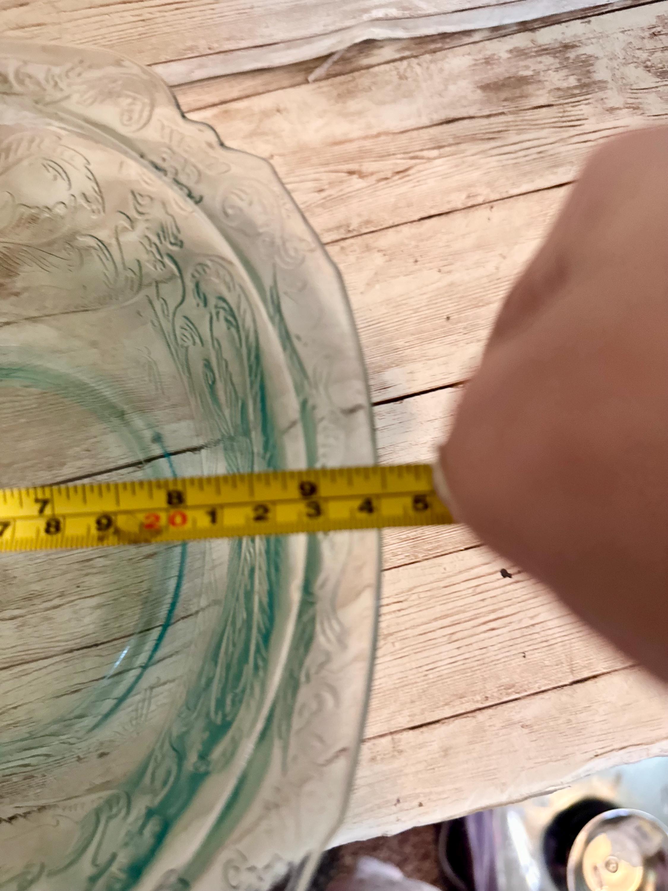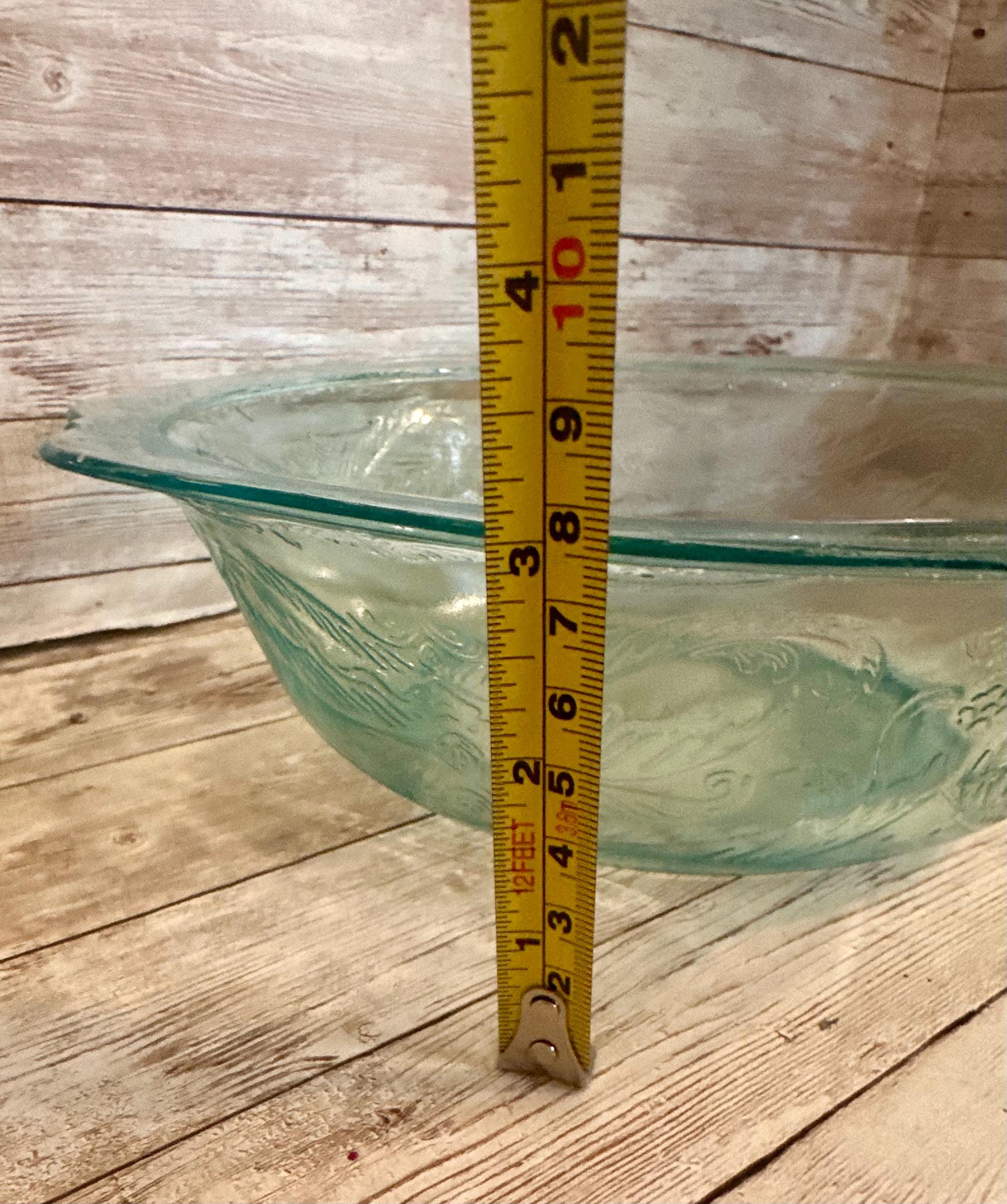 This stunning Vintage Federal Glass Madrid aqua etched serving bowl from the 1930s is a beautiful example of Depression-era glassware. Measuring 9.5" in diameter and 3" in height, it features exquisite etched designs that highlight its elegant contours and vibrant aqua color. Perfect for serving your favorite dishes or as a decorative piece, this bowl adds a touch of vintage charm to any table setting. An excellent addition for collectors and those who appreciate antique glassware.