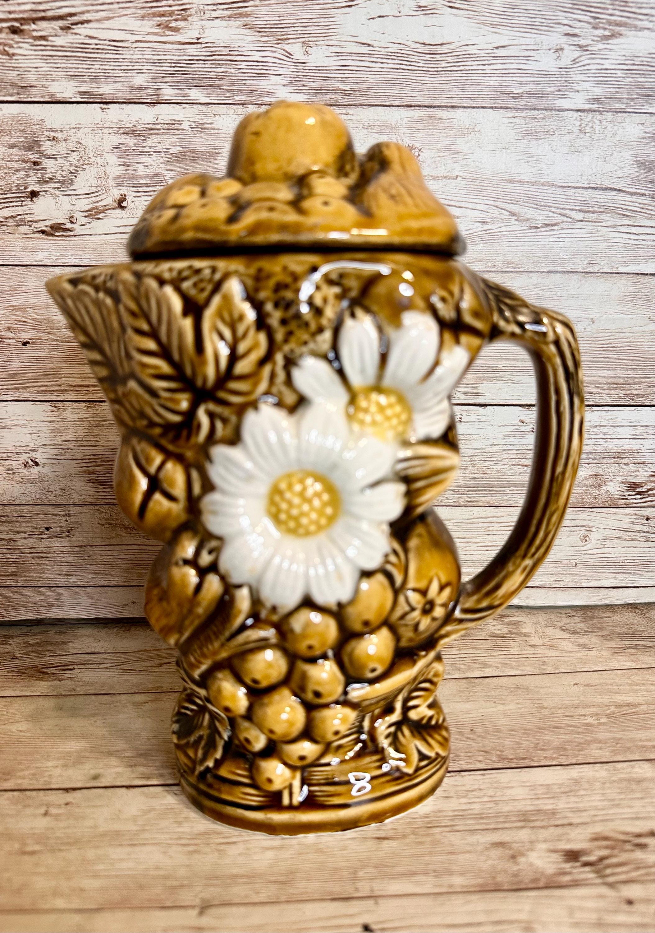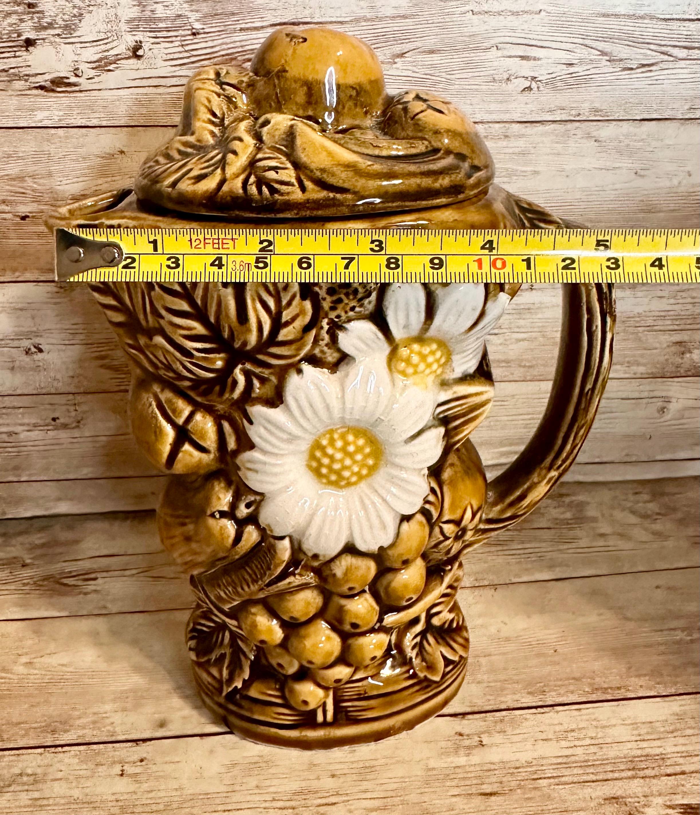 This vintage ceramic pitcher from Japan features a charming design with daisy flowers, fruits, and vegetables in a vibrant multicolor scheme on an olive green background. The mid-century modernism style adds a retro flair, while the medium size makes it suitable for serving beverages or as a decorative piece. The ceramic material and durable finish ensure lasting quality, making it a unique addition to any kitchen or home decor collection.
