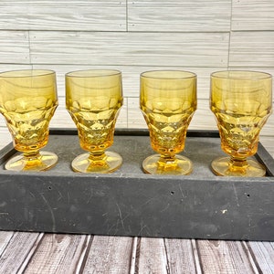 Crafted during the 1970s, this set of four Hoffman House thumbprint swirl yellow goblets exudes a timeless charm. Each heavy glass piece features a distinctive swirl pattern with a bright, cheery yellow hue that adds a warm touch to any table setting. The round shape and classic design make these goblets a versatile choice for both casual and formal occasions.