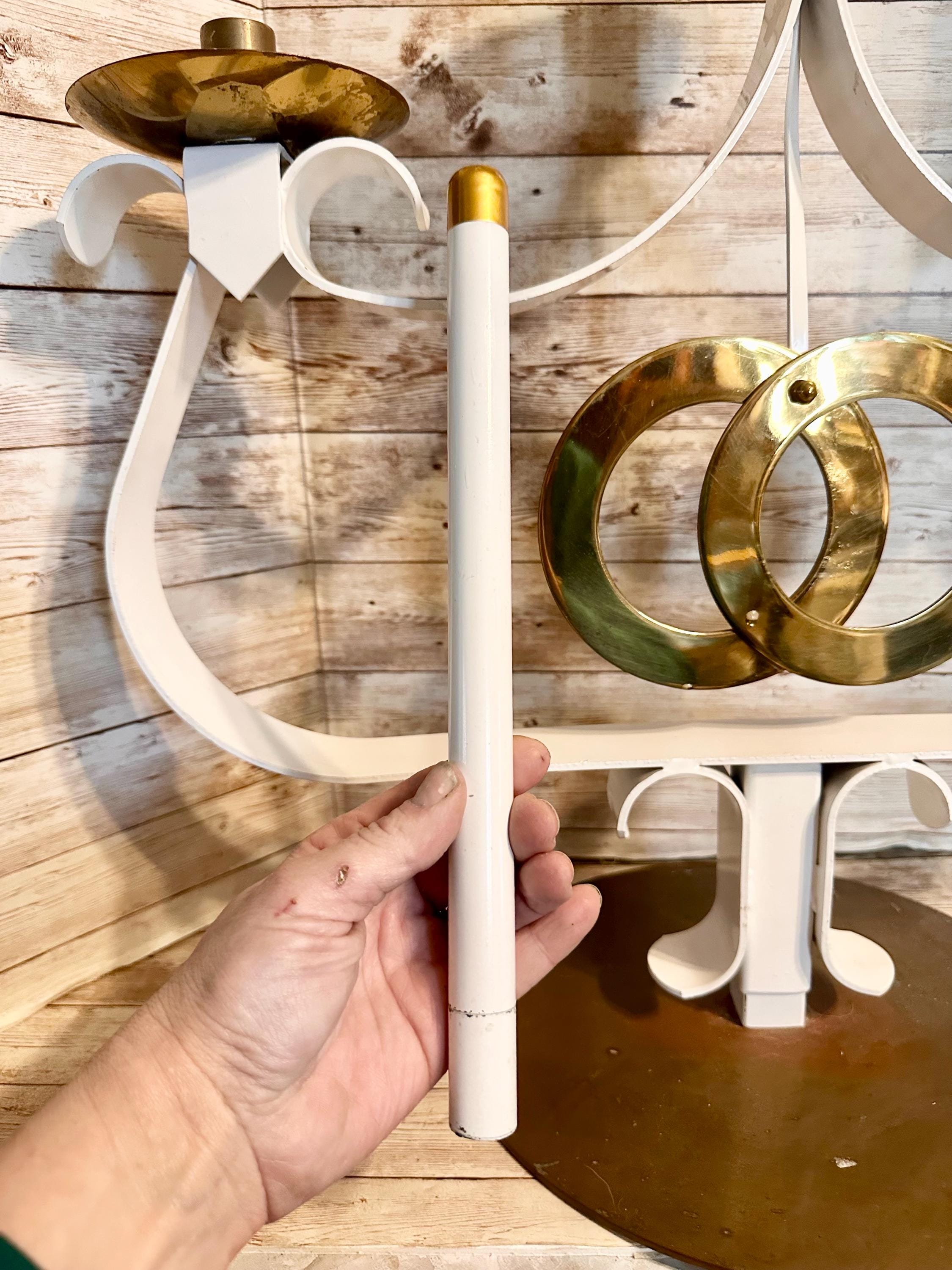 This beauty came from a church. Crafted for a single pillar candle and stick candles. 2 metal stick candles included. This unity candle holder is designed to hold a single pillar candle and 2 candlesticks, representing the union of your hearts as you begin your journey together. The heavy base is perfect for an out door wedding the heavy base will ensure it remains stable and centred throughout the event. With its timeless design, this piece will be a cherished keepsake from your unforgettable wedding day.