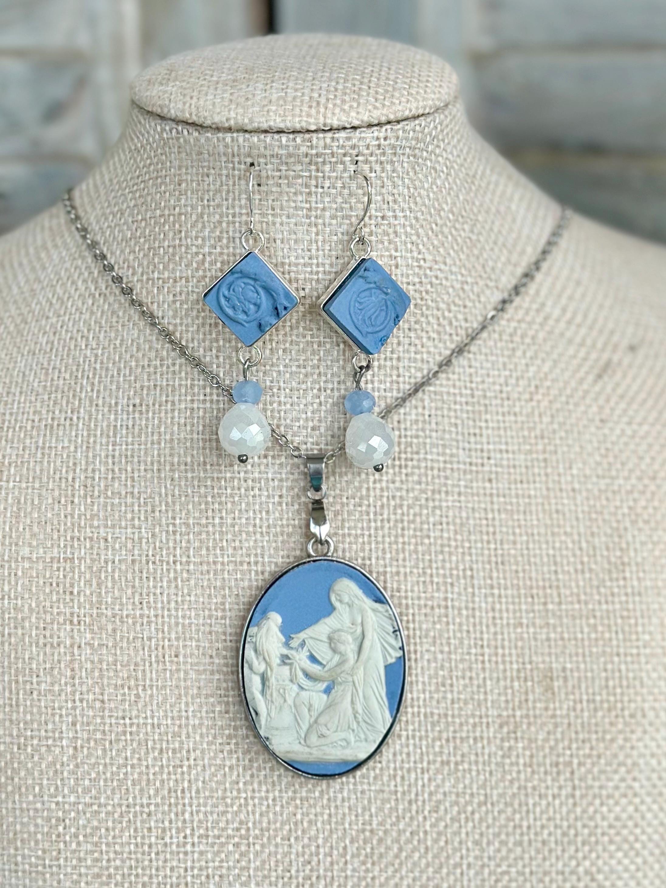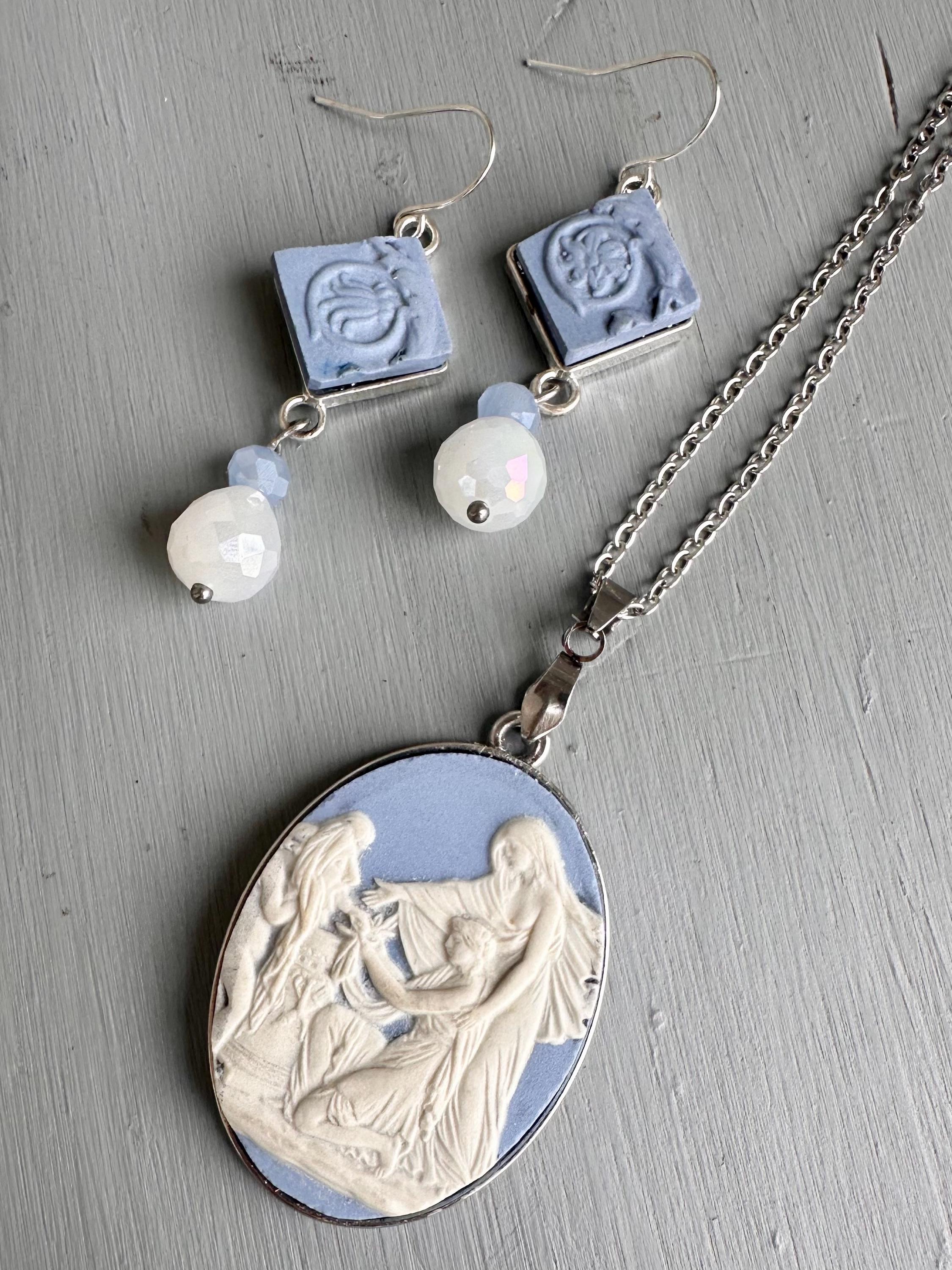 Discover our exquisite handmade broken china necklace crafted from a vintage blue Wedgwood Jasperware Cupid as Oracle plate. Necklace features a unique piece of beautiful china set within a 30mm by 40mm open back stainless steel bezel. I chose the open back design because you can see a little of the makers stamp that was on the back of the plate. 😊