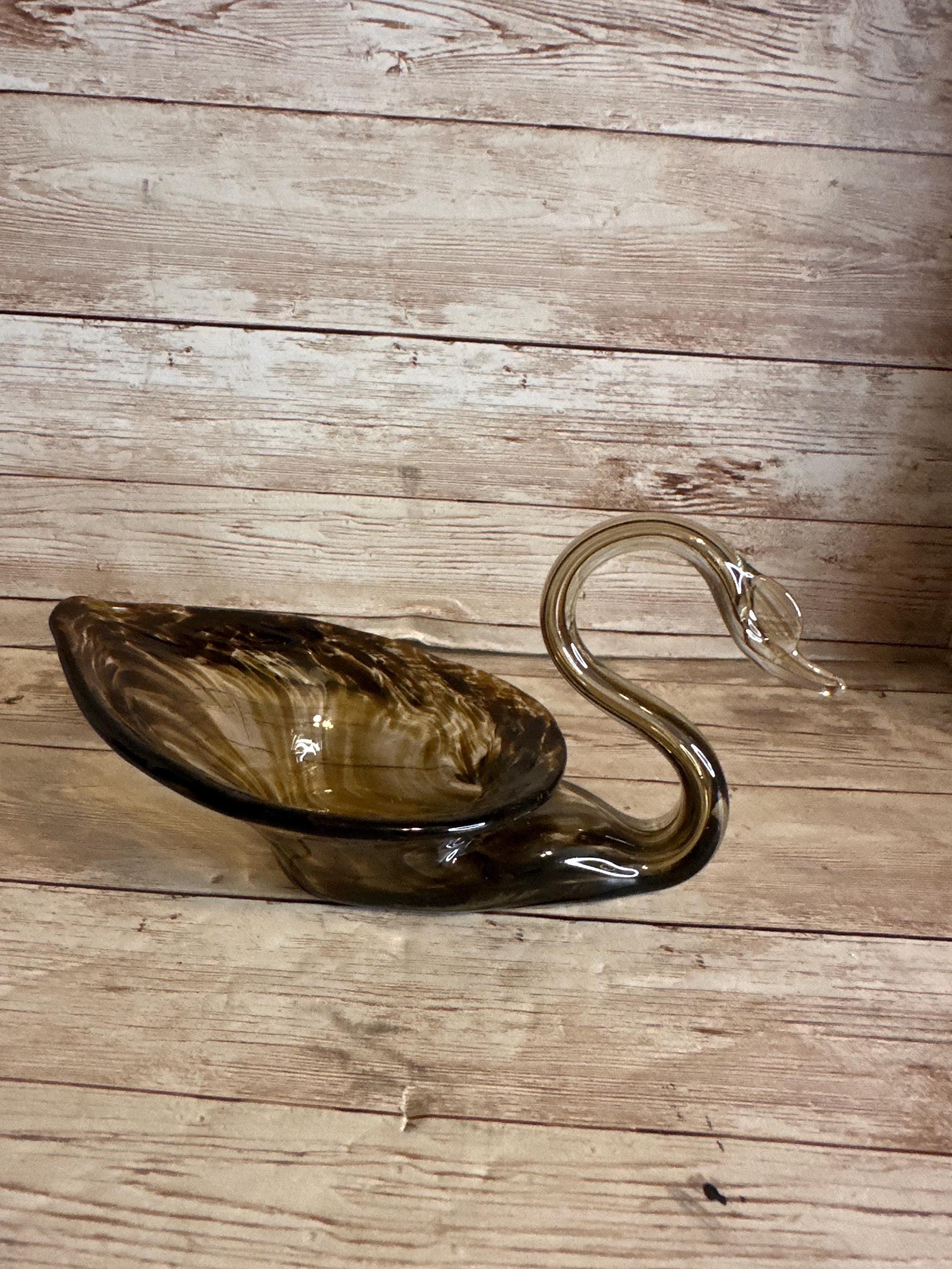 Exquisitely crafted, this vintage amber art glass swan dish embodies the elegance of Murano glassware. Its rich brown swirl pattern and mid-century modern style reflect a period of exquisite design and artistry, post-1940. The piece is a testament to the skilled craftsmanship that has been revered for generations.