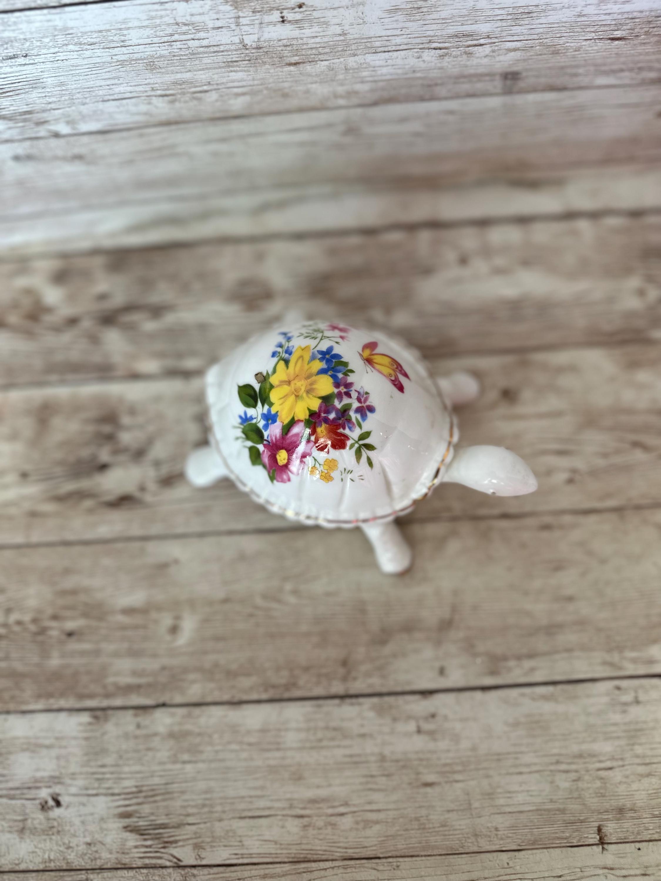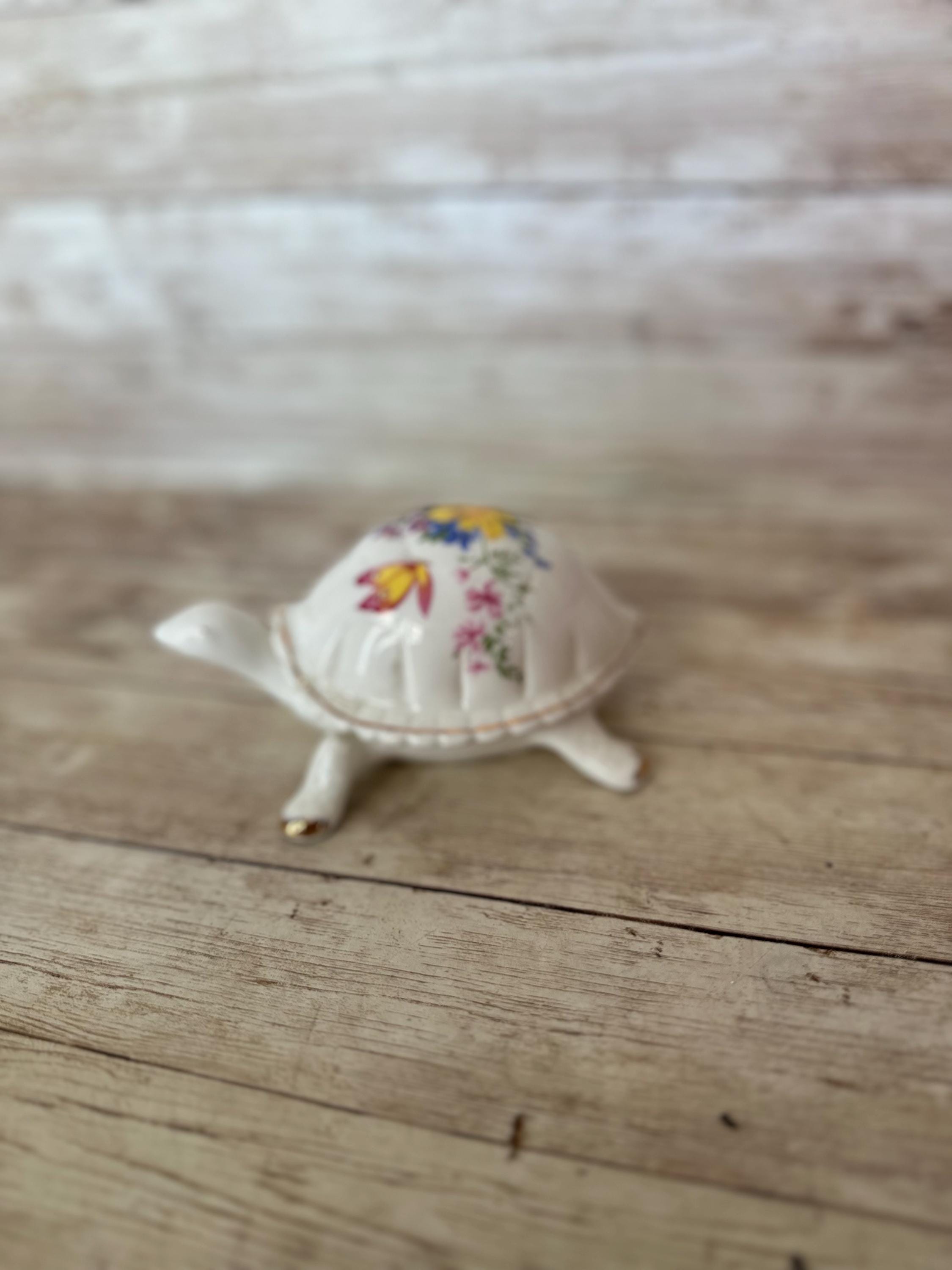 This vintage Lefton turtle trinket box is a charming piece of decorative pottery, featuring a bone china design with intricate floral details and original stickers. The turtle model and theme add a unique touch to the box, making it a delightful addition to any collection of figurines or decorative pottery. The packaging in a box further enhances the appeal of this original piece from Lefton.
