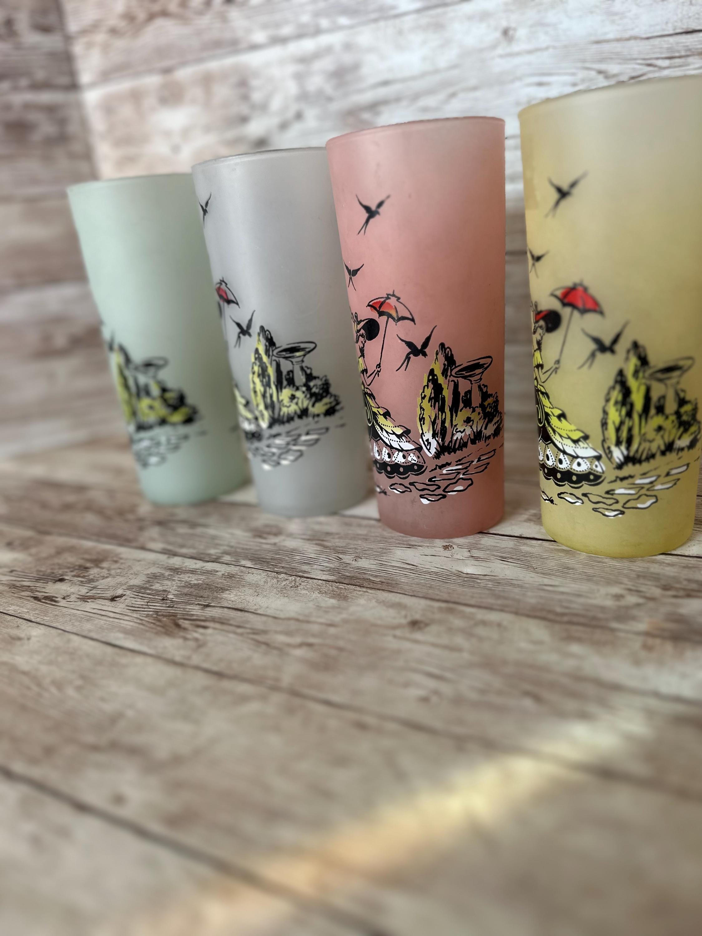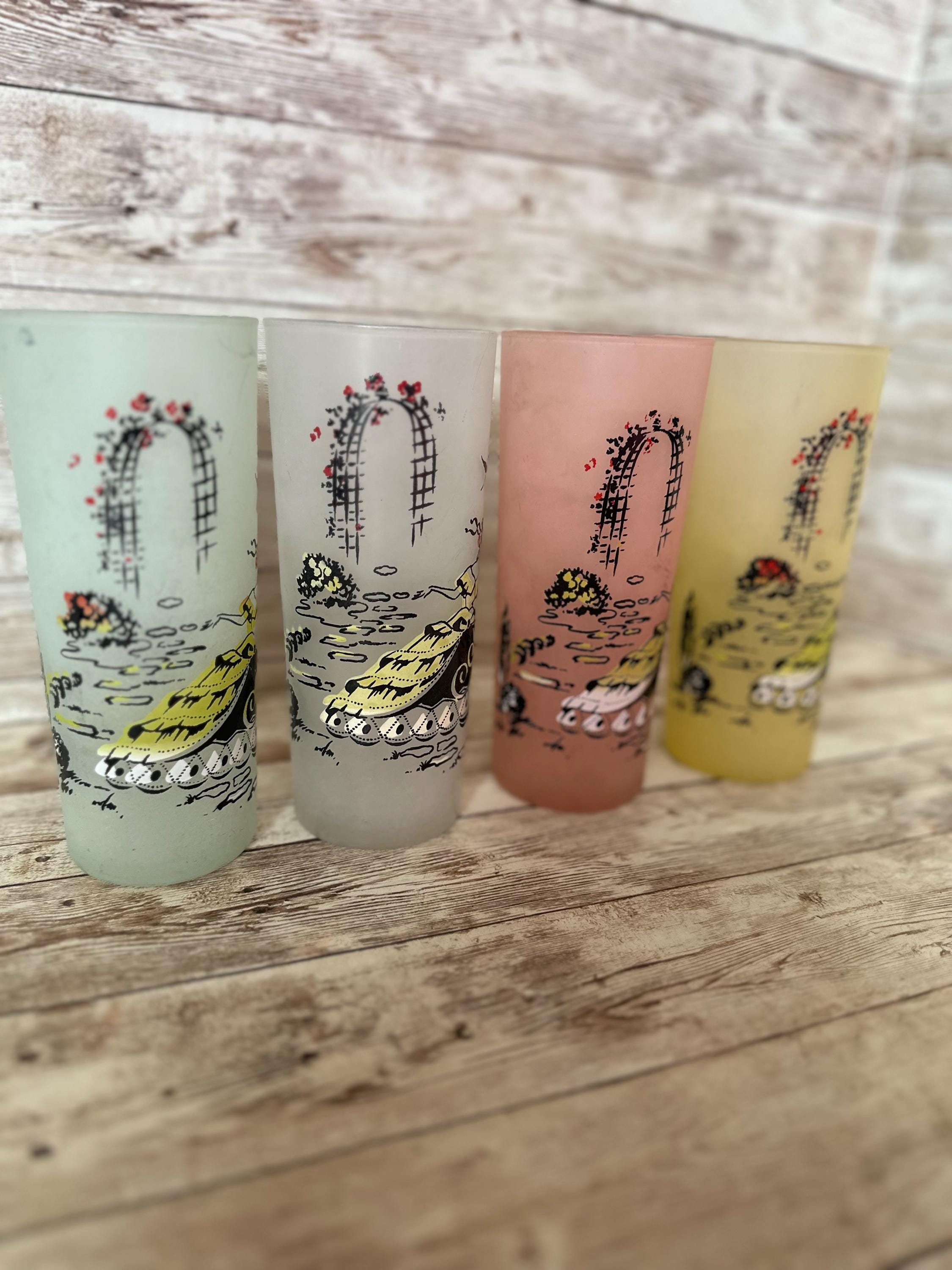 The product is a set of 4 vintage Libbey cocktail frosted Southern Belle glass collins, measuring 6.5" in height. These multicolored Victorian-style glasses are made of glass and are perfect for serving cocktails in a stylish and elegant way. With their unique design and collectible appeal, these collins glasses would make a charming addition to any kitchen or home decor, adding a touch of retro charm to any drinkware collection.