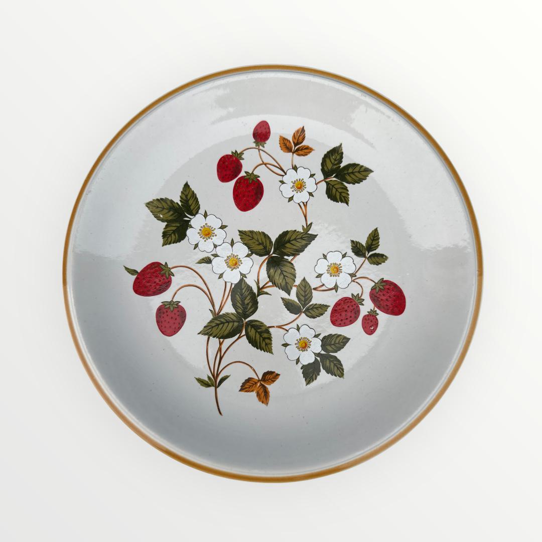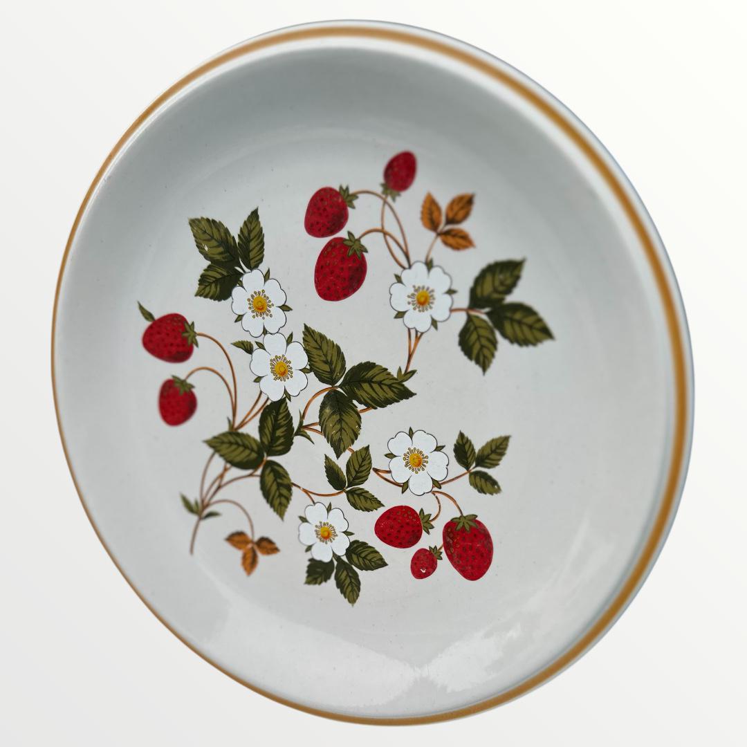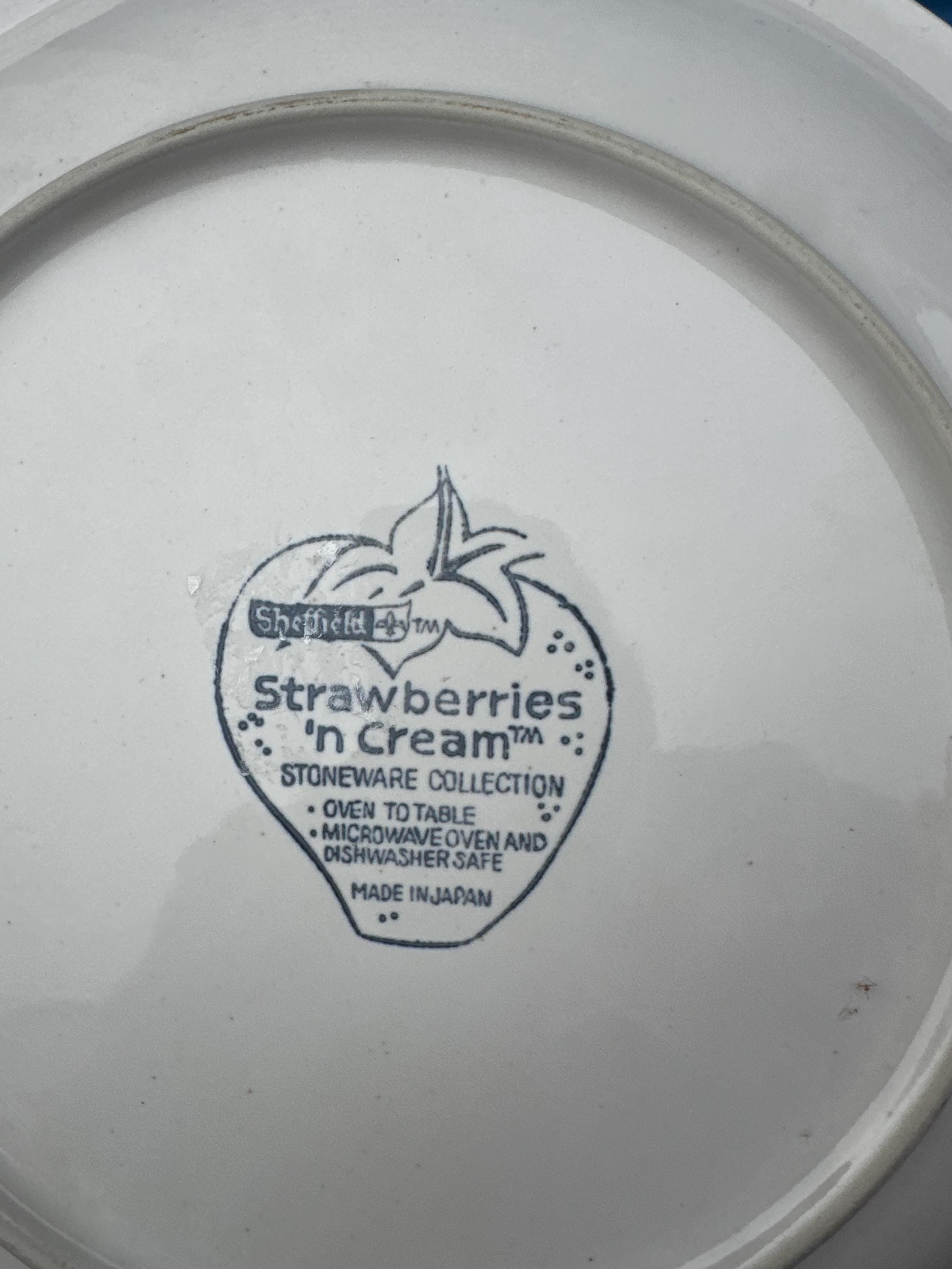 This set of 4 Vintage Sheffield Strawberries N Cream Stoneware Dinner Plates features a charming vintage design with a round shape and a multicolor strawberry theme. Made of stoneware and manufactured in 1975, these 10 1/2" plates are a perfect addition to any mid-century modern dining collection. The set includes six pieces, with each plate bearing the original Sheffield brand and a printed backstamp. With an antique vintage flair and a production style of art pottery, these dinner plates are sure to add a touch of nostalgia to your table setting.