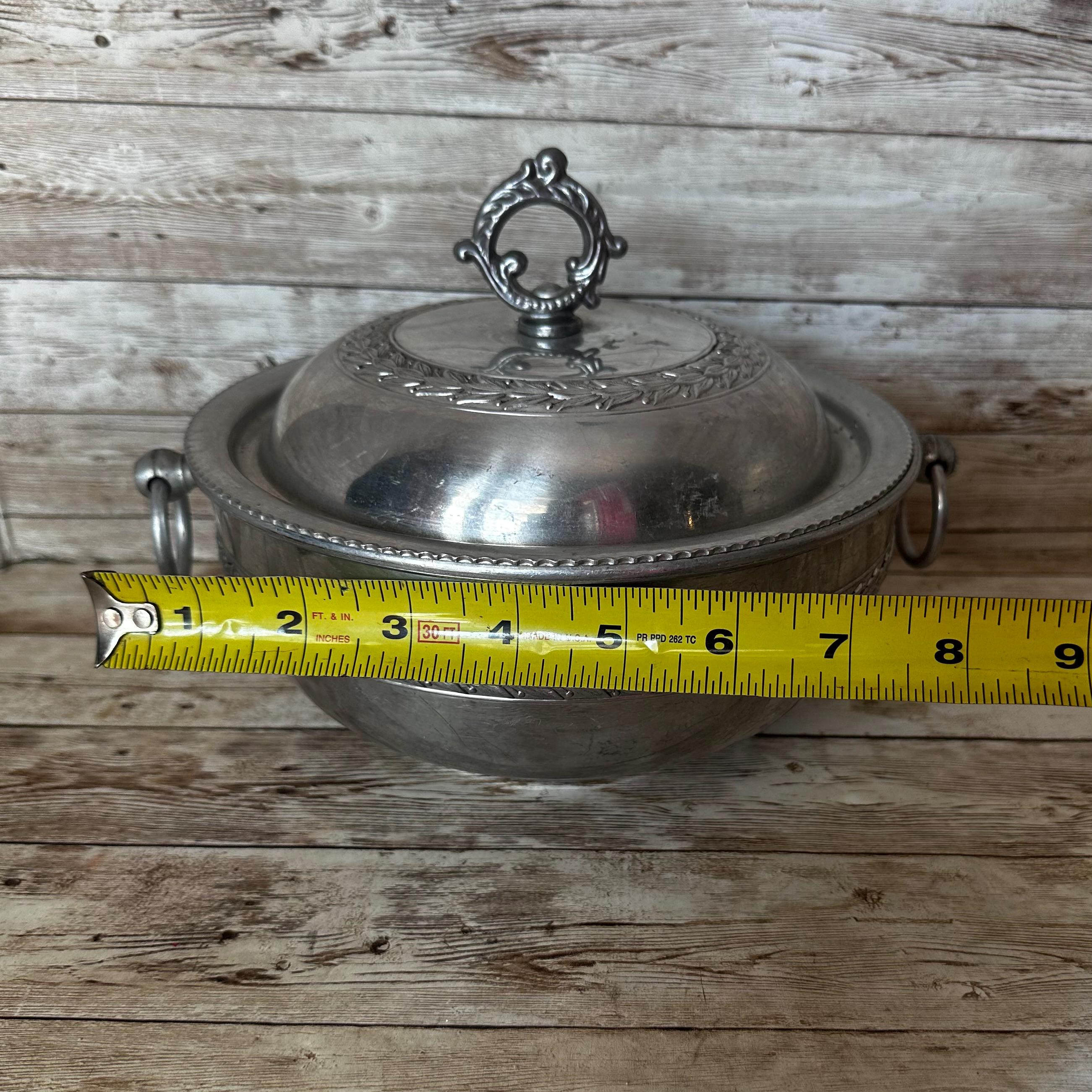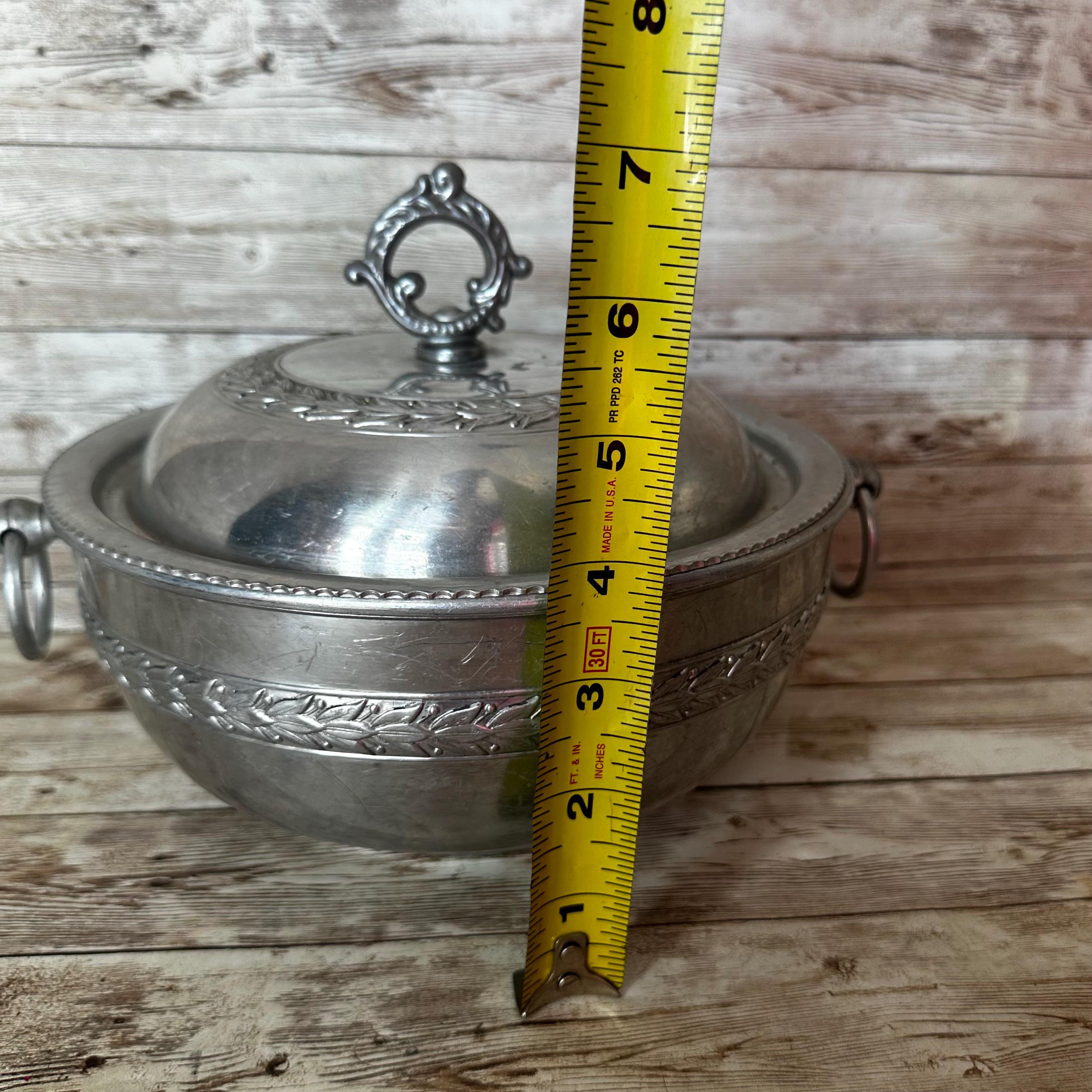 The Vintage Wilson Ware Aluminum 8 1/2 Chafing Dish with a leaf design and lid ring handle is a unique and stylish serving bowl perfect for all occasions. Made of lightweight yet durable aluminum, this two-piece set includes a round bowl with a diameter of 8 inches and a matching decorated lid handle. The mid-century modern design features an embossed leaf pattern, giving it a decorative and vintage appeal. Hand wash only to maintain its metallic silver finish and break-resistant feature, this original piece from the 1950s is a charming addition to any kitchen or dining collection. **No Return Policy**