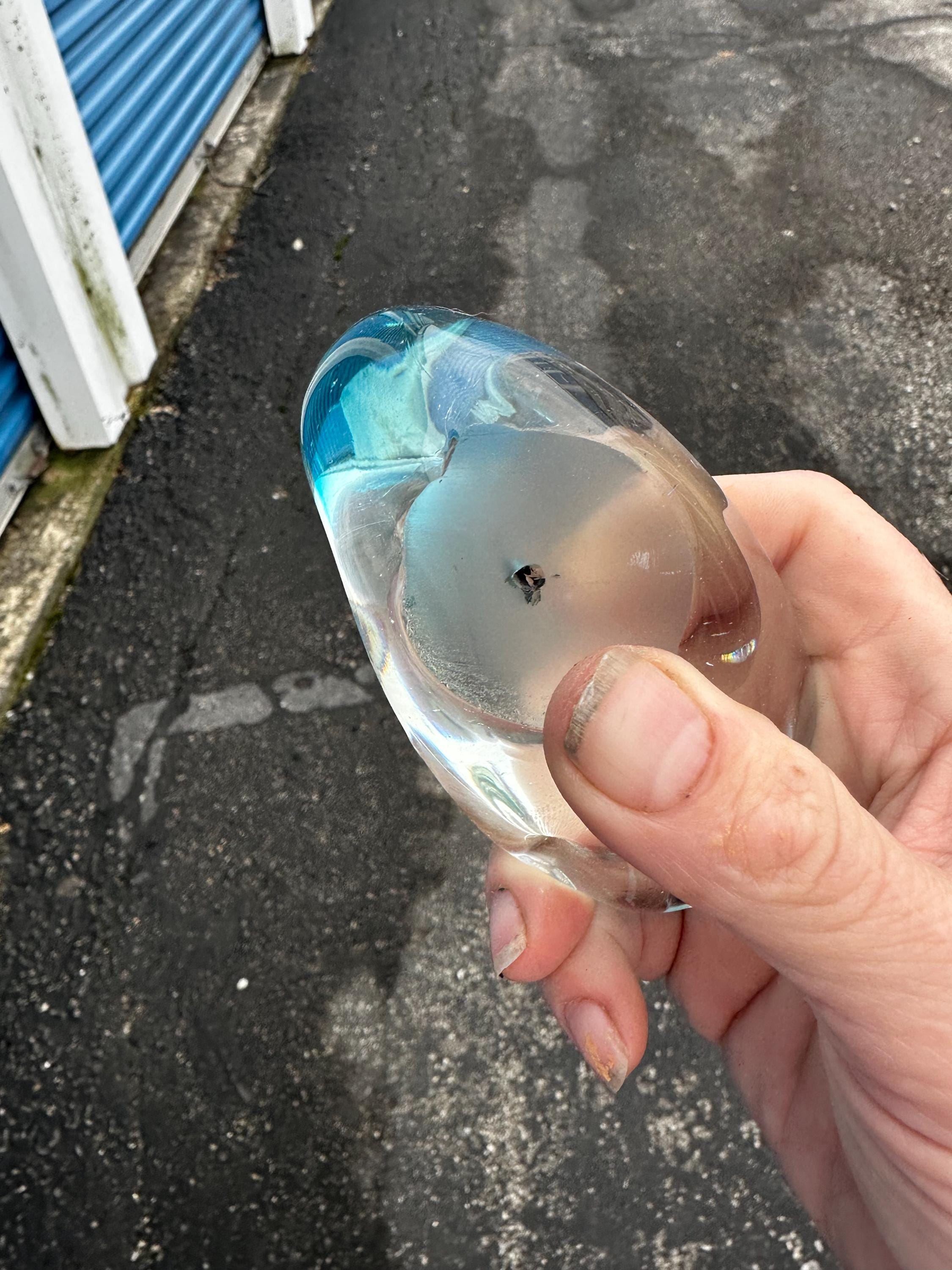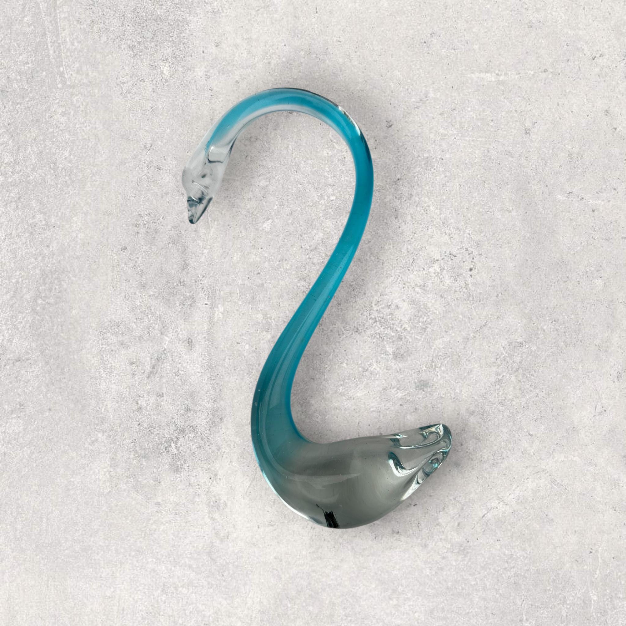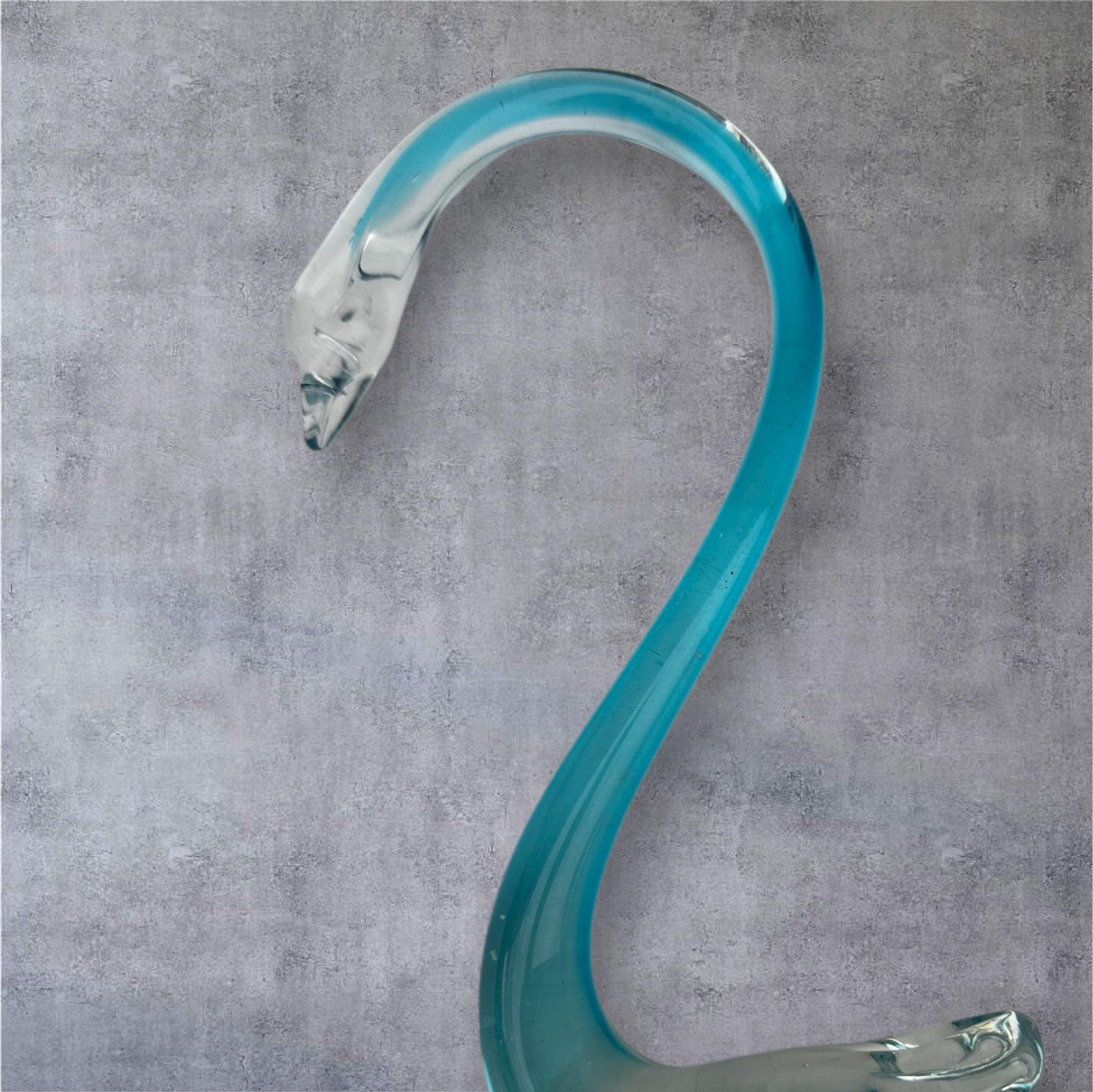 This product is a hand-blown art glass swan figurine in a clear aqua light blue color. It features an Art Deco style and is made of glass. The swan is a popular subject in decorative pottery and glassware, representing elegance and grace. This unmarked brand piece is sure to add a touch of sophistication to any collection or decor with its unique and intricate design.