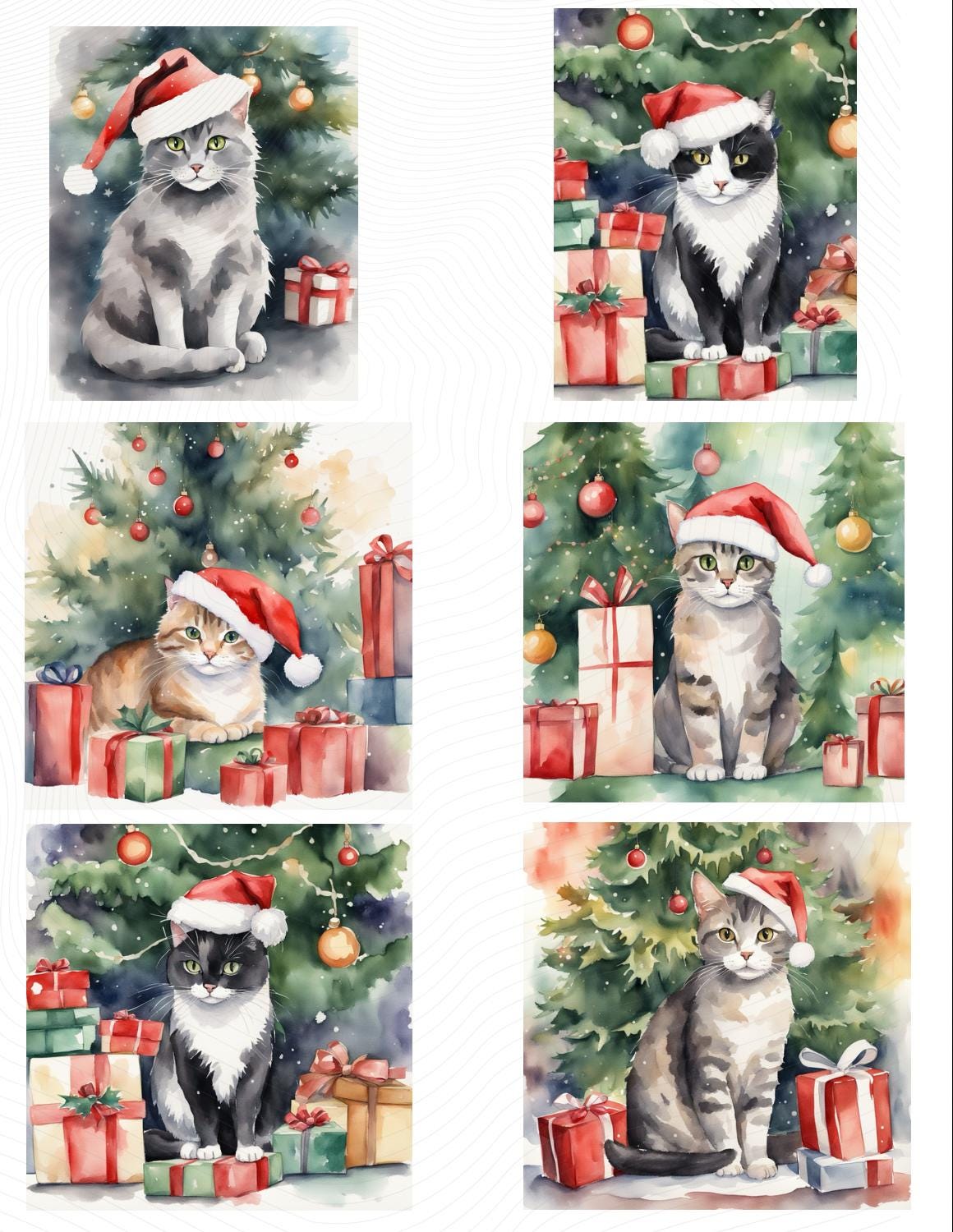 Perfect for cat lovers, this collection features charming kitties in their little Santa hats, gathered happily under a beautifully decorated Christmas tree. The soft, watercolor style gives each design a warm and artistic feel, making your creations truly special.