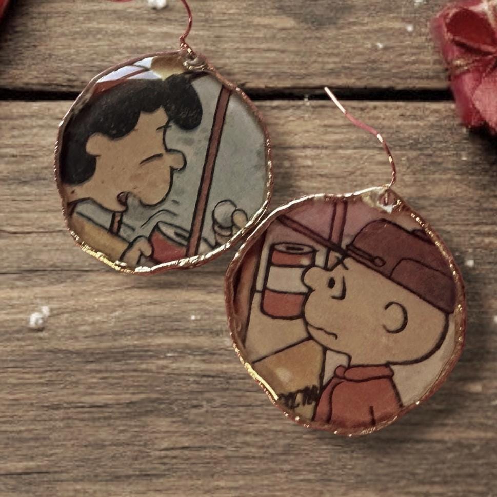 These charming, lightweight earrings feature an exclusive images of A Charlie Brown Christmas. Image is set in a gold alloy bezel and covered in resin for durability, These one-of-a-kind earrings feature gold stainless ateel fish hook findings. - sure to get the conversation started this holiday season!