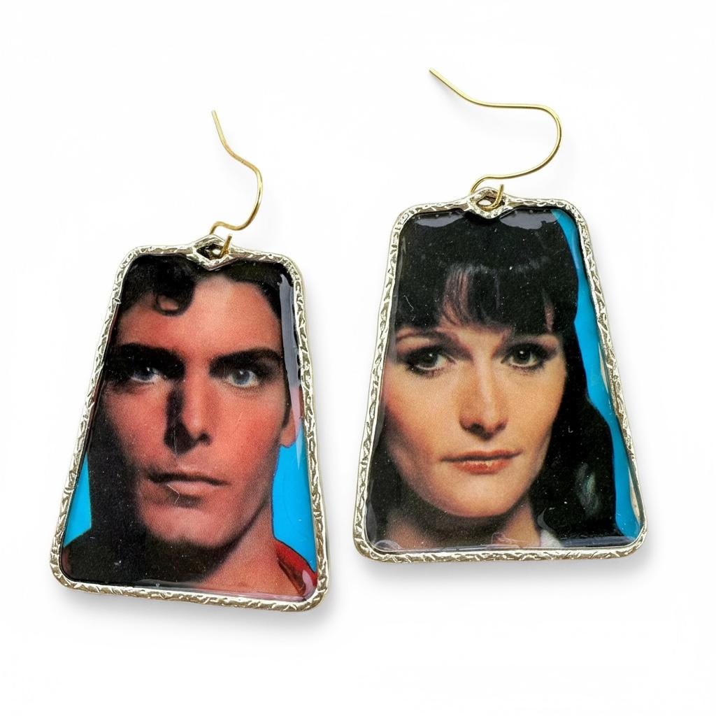 Elevate your accessory game with these unique earrings featuring a 1978 Vintage Superman and Lois Lane sticker card . Each earring is meticulously upcycled and set in shimmering resin, secured in a stunning gold bezel. Finished with stainless steel fish hook findings, these earrings are perfect for superhero fans and vintage collectors alike. Stand out with this one-of-a-kind statement piece!