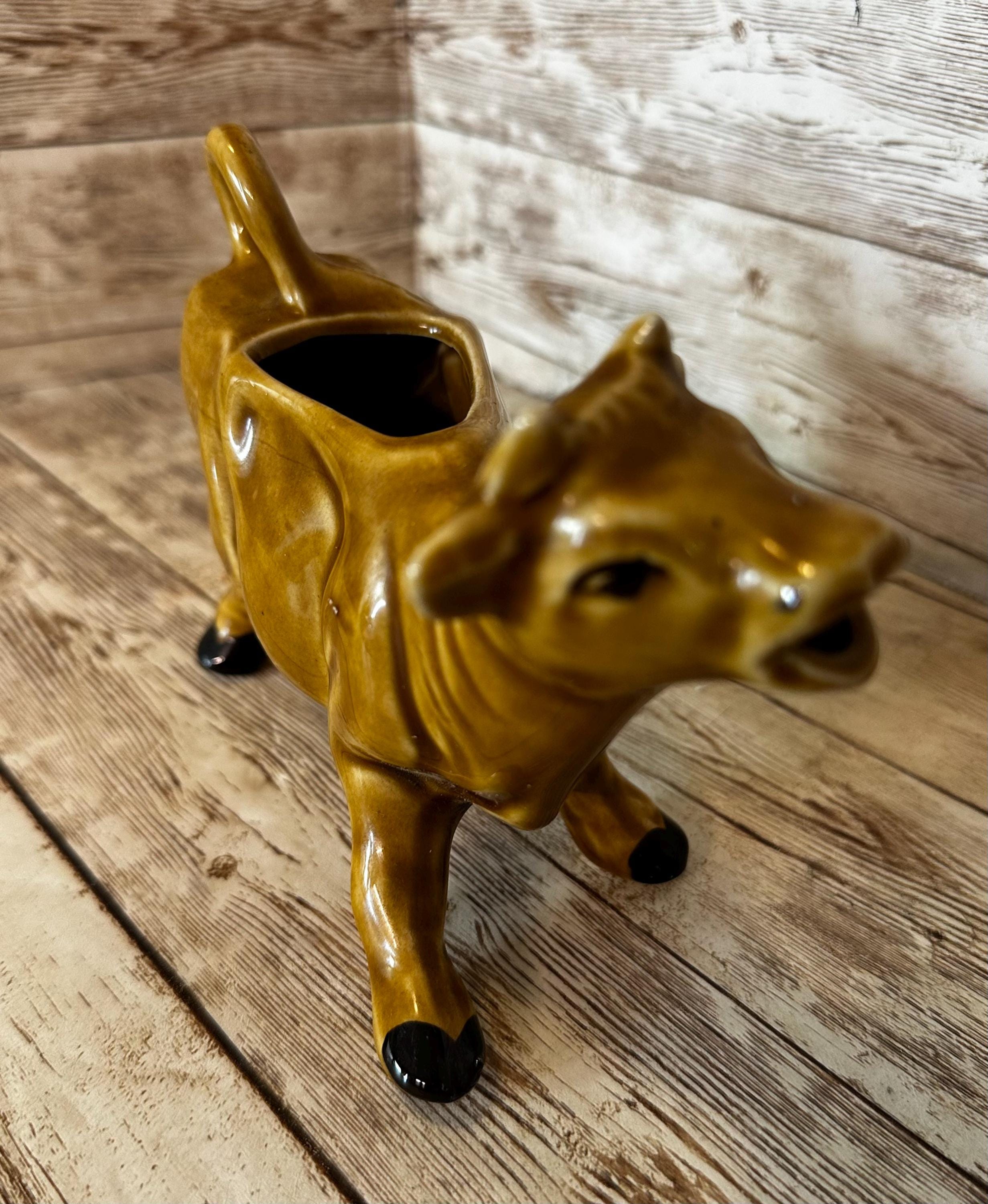 This vintage collectible brown ceramic cow dairy creamer is a charming small pitcher made in Japan. Crafted from ceramic with a cow design, this creamer is both functional and decorative. A unique addition to any farm or countryside-themed collection, this piece captures the essence of dairy farming with its cow motif. Perfect for serving cream or milk, this small pitcher is a delightful way to add a touch of nostalgia to your kitchen or dining room. **No Return Policy**