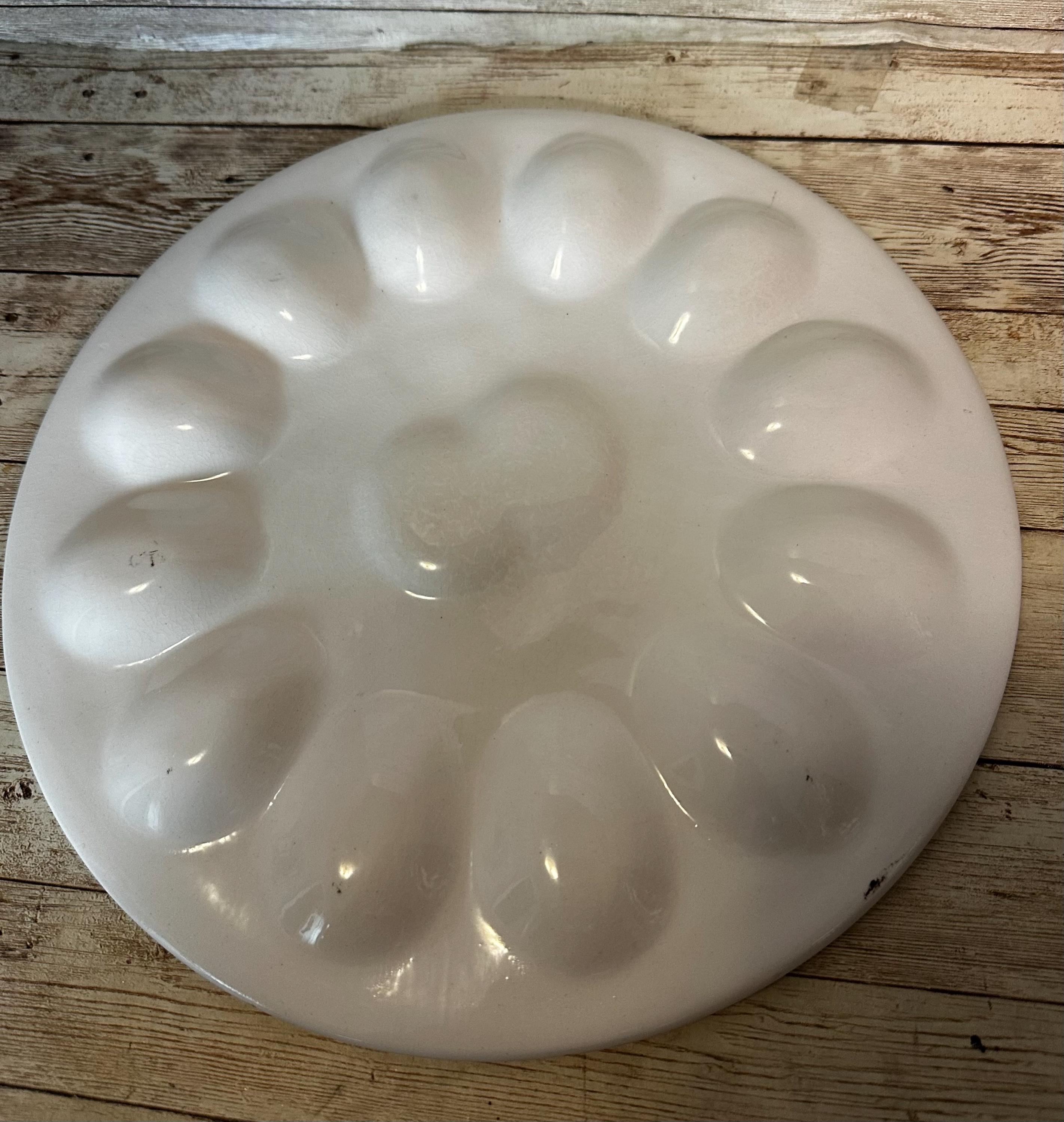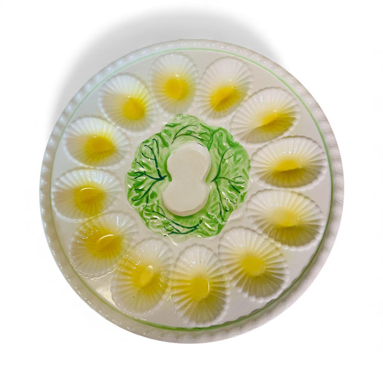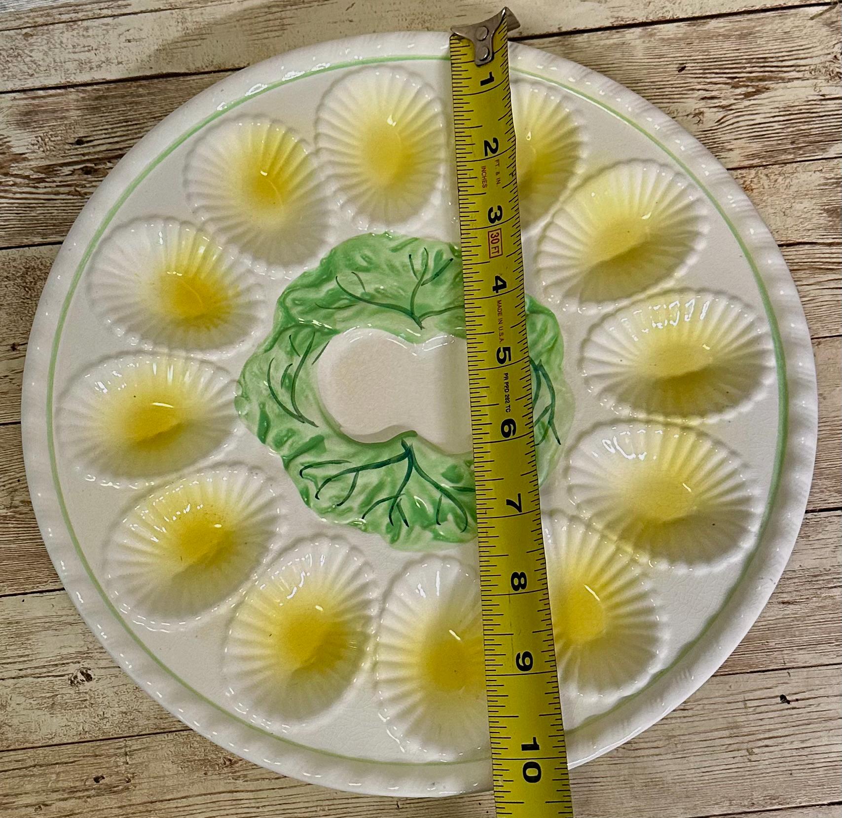 The VTG Ucagco Deviled Egg Plate Tray is a vintage ceramic serving tray with a round shape and a glossy multicolor finish. Hand-painted with a theme of eggs, garden, lettuce, and Easter, this tray is perfect for serving deviled eggs or collectible items in a cottage Granny Core mid-century modern style. This original piece from Ucagco adds a touch of nostalgia and charm to any table setting or display.