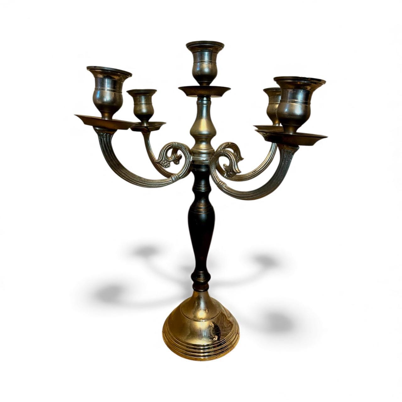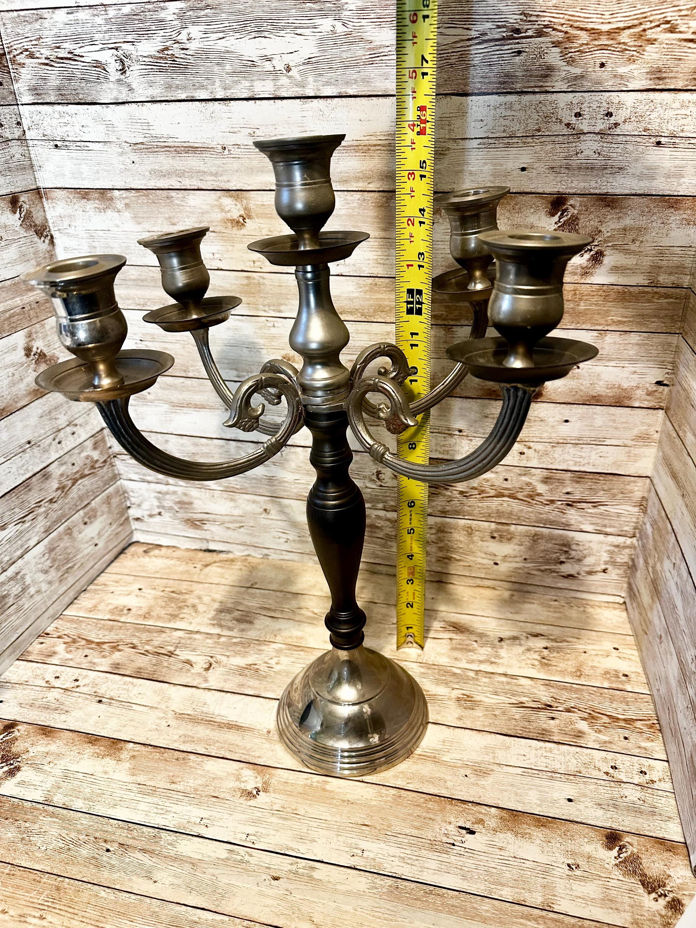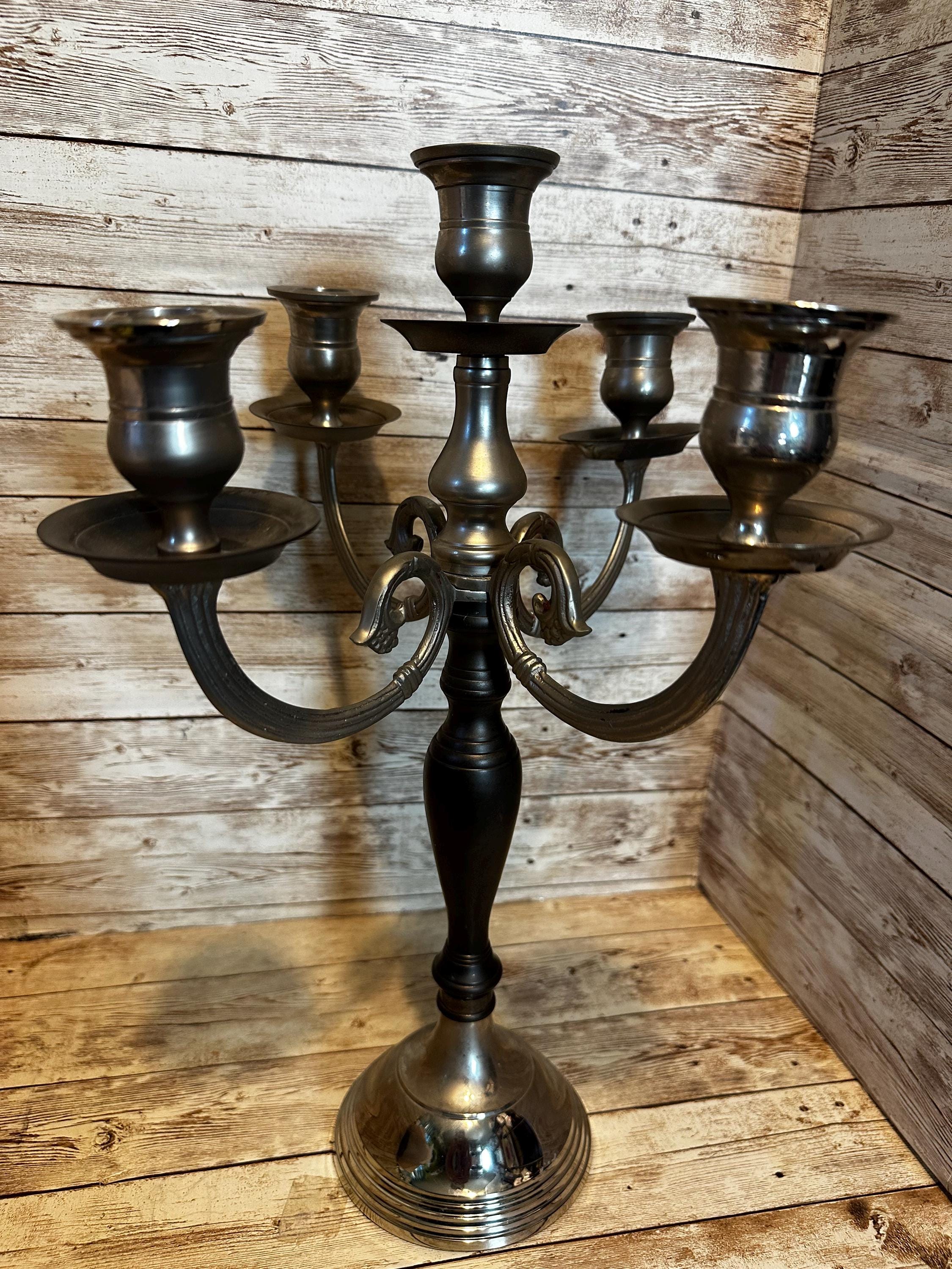 This Metal and Black Candelabra Candlestick Holder is a traditional style candle holder made of metal, with a metallic silver finish. Standing at 16 inches tall and weighing 6 pounds, it is a large and heavy piece perfect for adding a touch of elegance to any home decor. Designed in India, this candelabra adds a touch of sophistication to any interior with its classic design and sturdy construction. Ideal for display in a living room, dining room, or bedroom, this candlestick holder is a stylish and practical addition to any home. **No Return Policy**