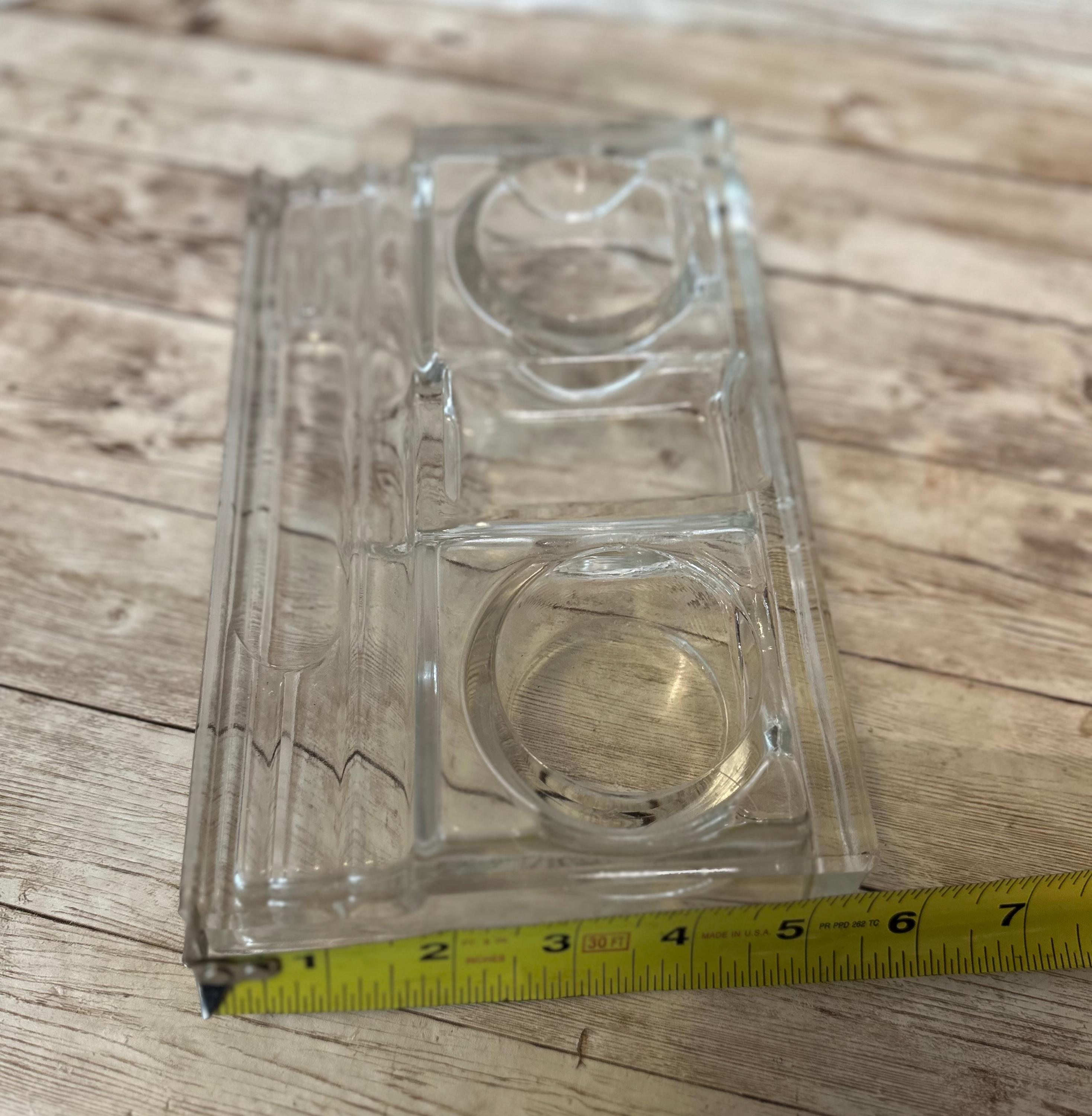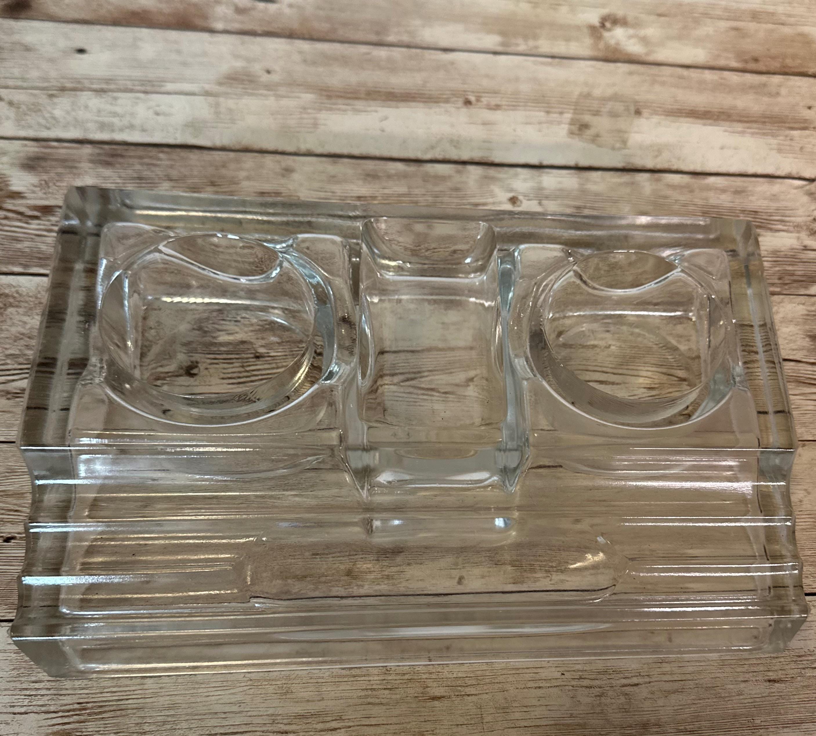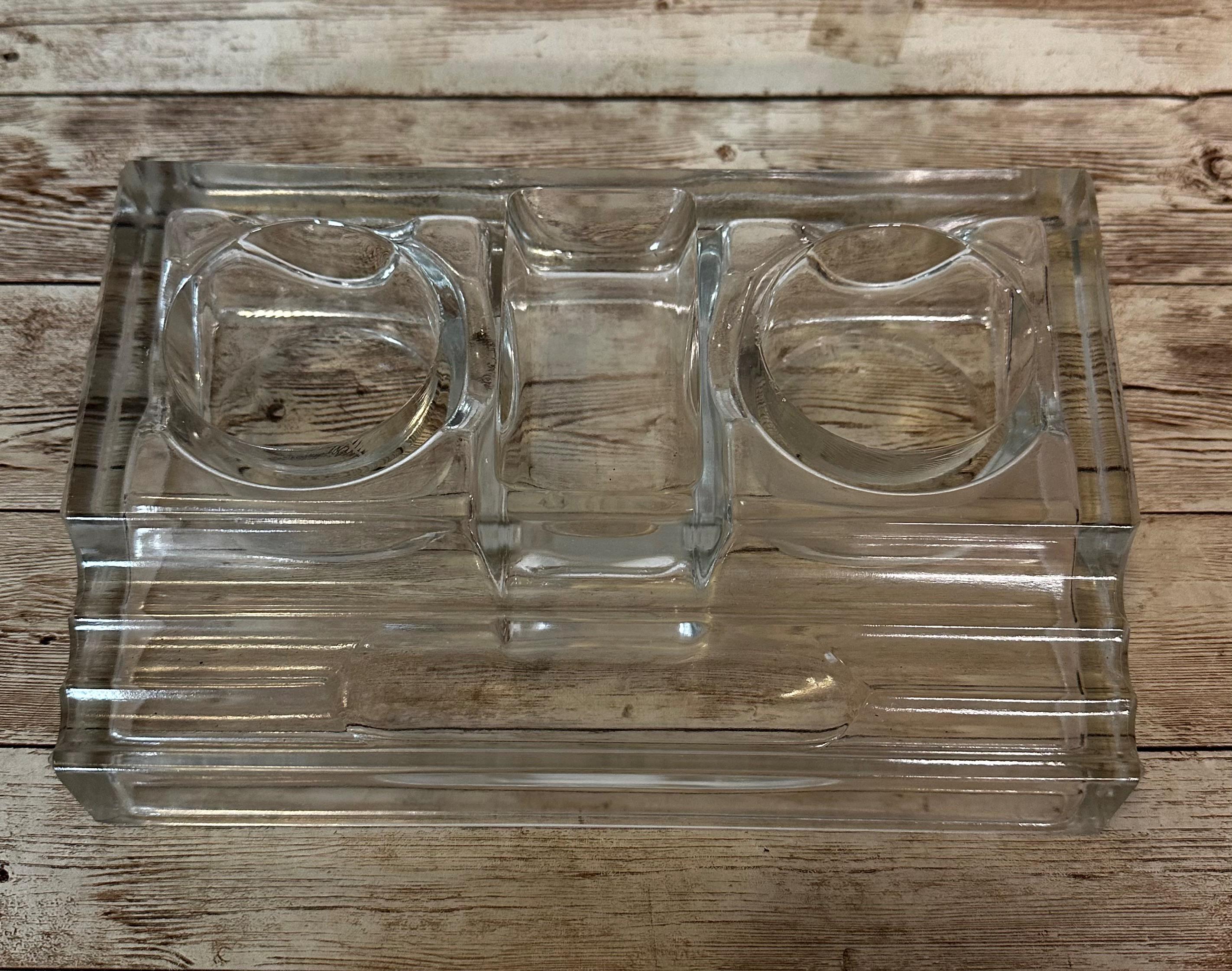 The Art Deco 1920's Sengbusch #320 Clear Glass Dual Inkwell Pen Holder is a vintage collectible piece originating from the United States. Made of heavy glass, this unique item features two inkwells in clear glass, adding a touch of elegance and nostalgia to any pen and writing instrument collection. With its timeless design and craftsmanship, this piece is sure to be a standout display item for any collector interested in vintage inkwells and pen holders. **No Return Policy**