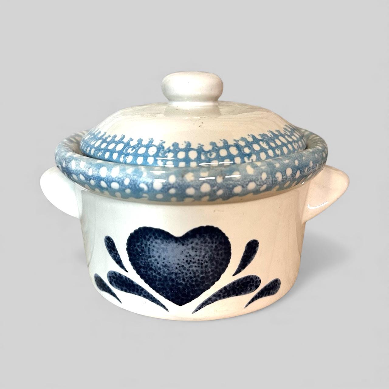 The product is a set of three vintage Corelle stoneware Blue Hearts 16-oz ceramic onion soup bowls with a crock and lid. The bowls feature a blue and white heart-shaped pattern, making them ideal for all occasions. Made with stoneware and ceramic materials, these glossy finished bowls have a retro charm and are perfect for serving soup or stew in style. With a production style of blue and white pottery, these bowls are a unique addition to any kitchen or dining table.