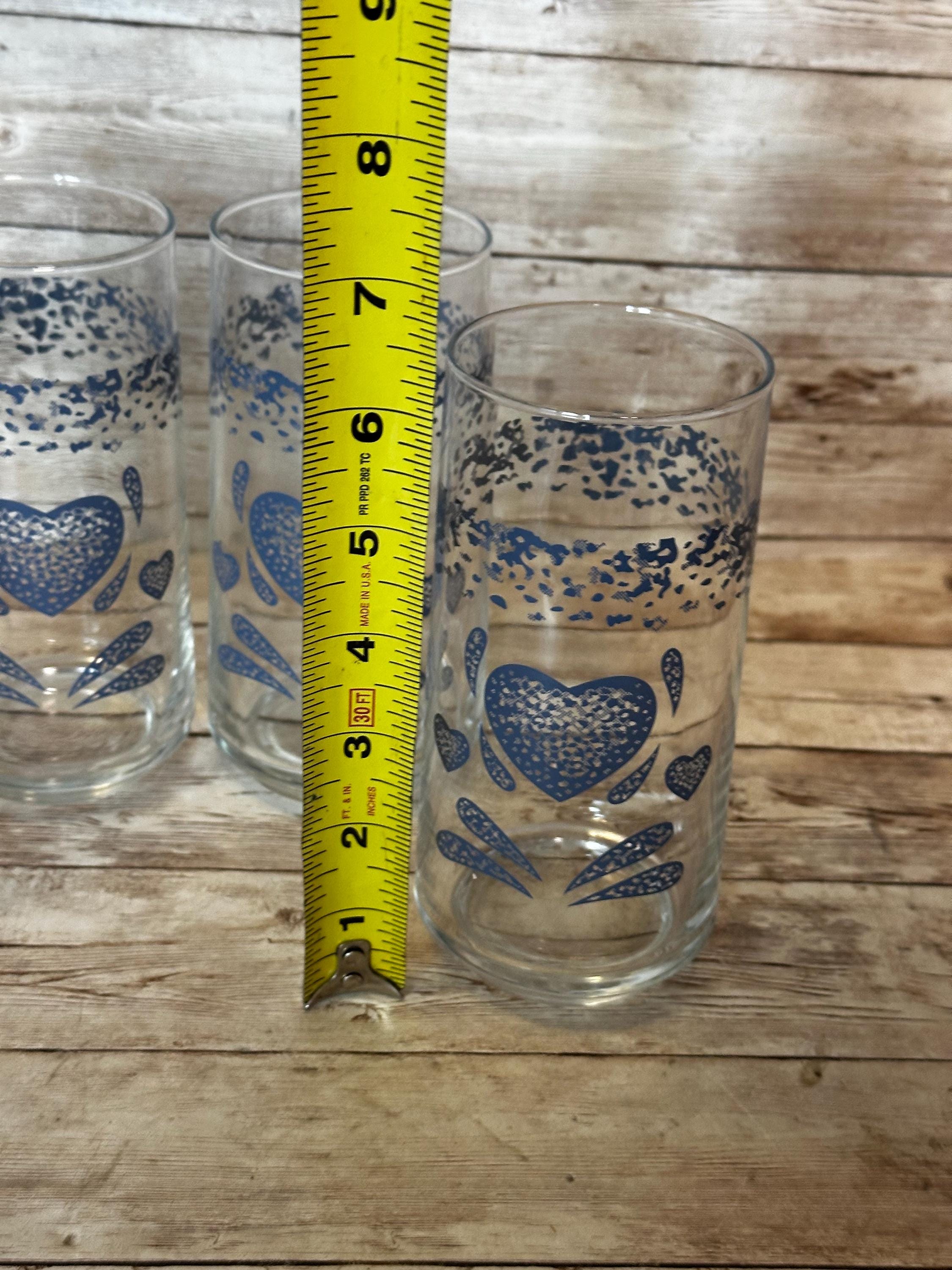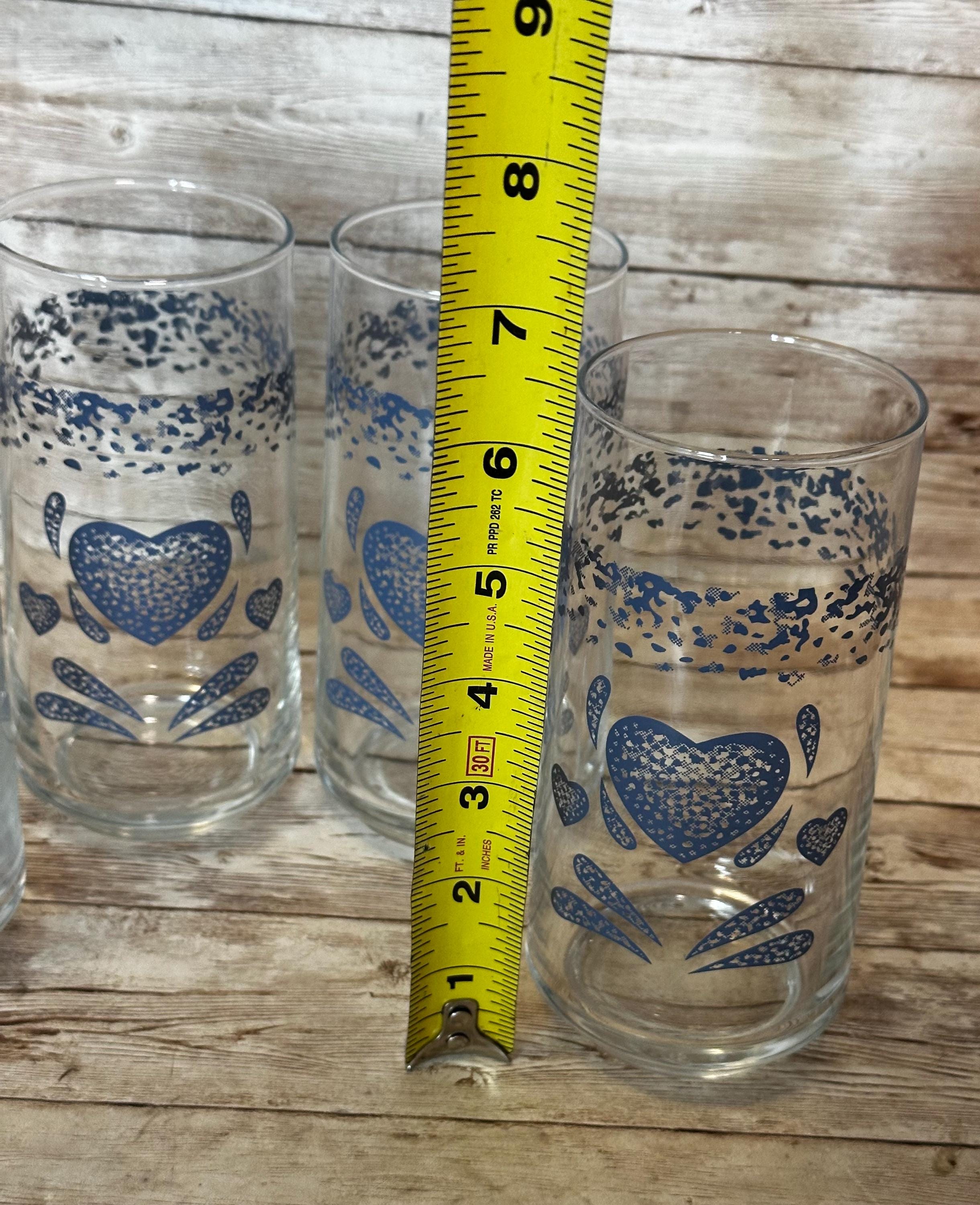This set of 4 Corelle Corning Ware Blue Sponge Country Hearts Drink Glass Tumblers features a charming blue heart pattern on glass tumblers with a capacity of 16oz. The vintage design, manufactured in 2011, adds a touch of Americana to your table setting. These decorative water glasses are perfect for serving drinks in style, standing at a height of 6 inches. Made by the trusted brand Corelle, these tumblers are a lovely addition to any dining collection. **No Return Policy**