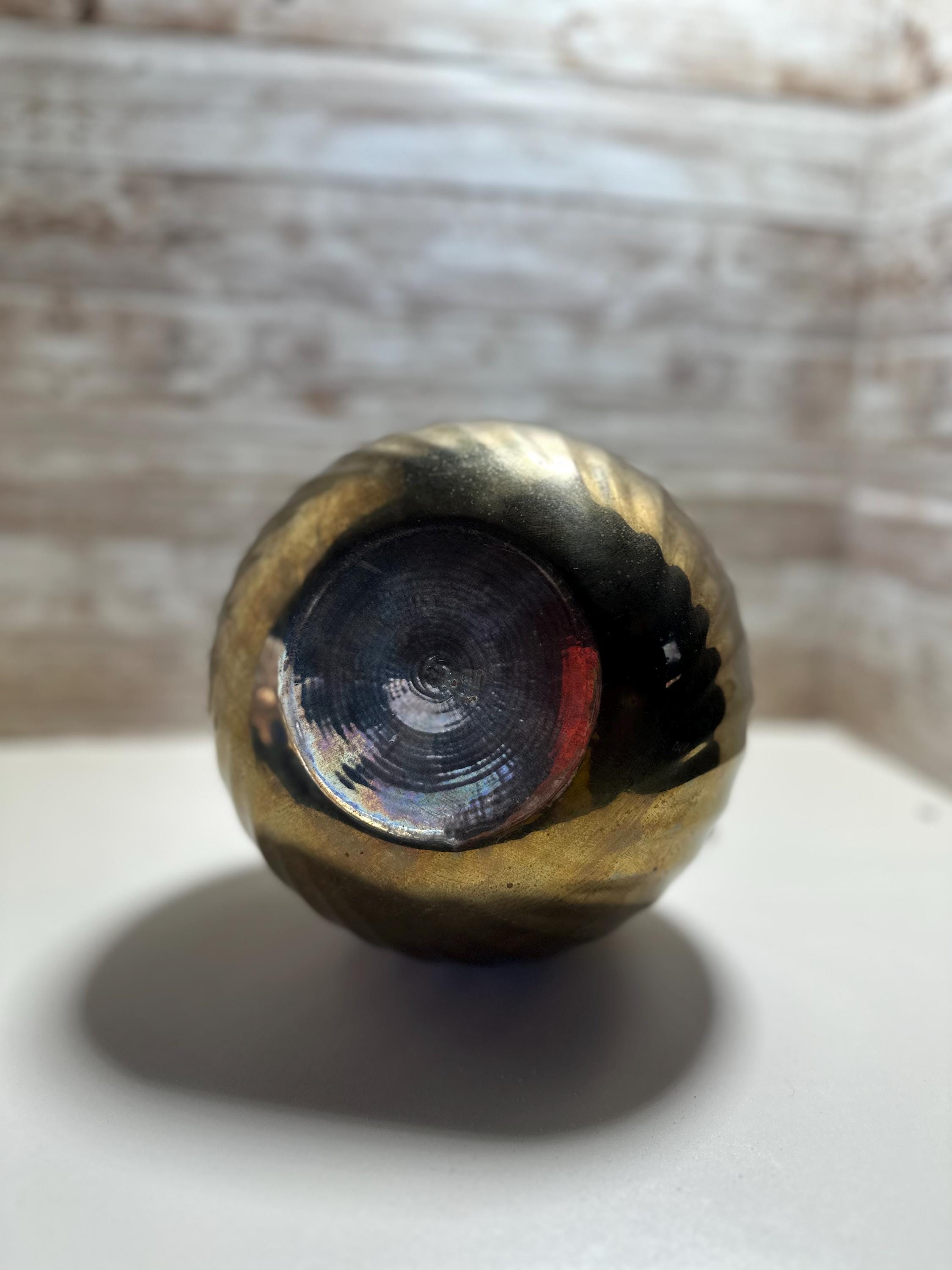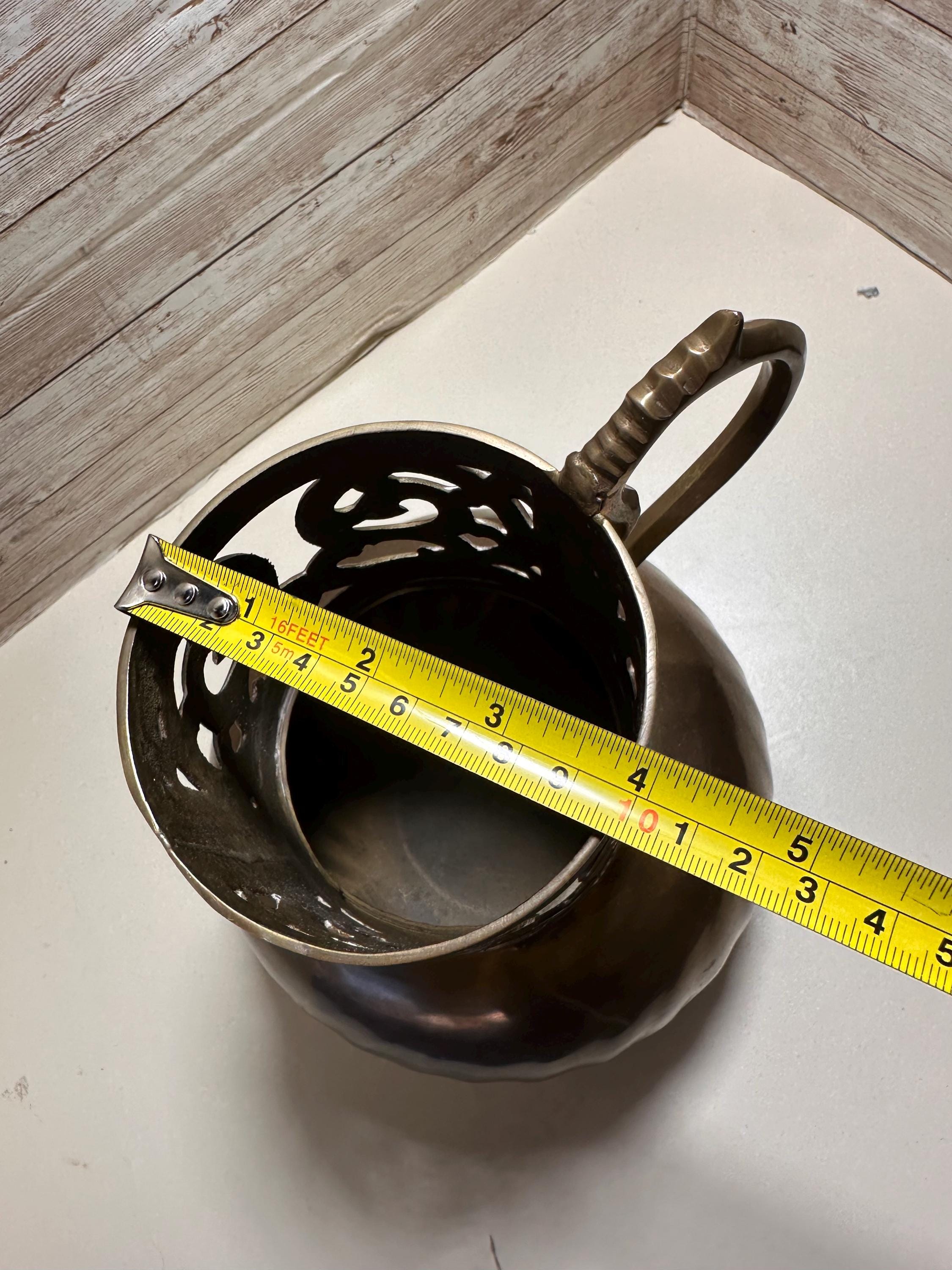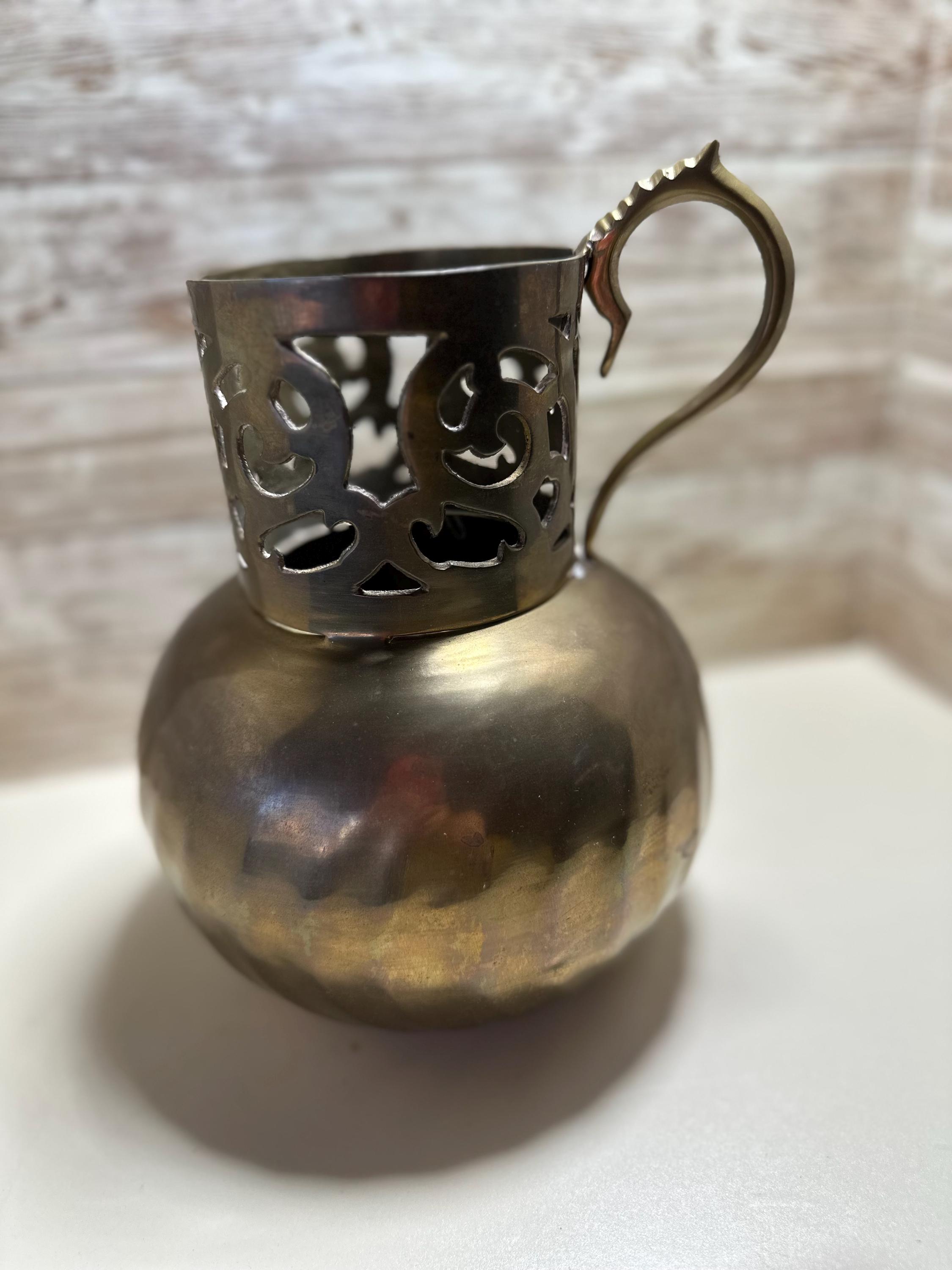 This product is a vintage heavy solid brass pitcher, standing at 8 inches tall with ornate details. The pitcher is crafted from brass, giving it a classic and timeless appearance. Perfect for use in the kitchen or as a decorative piece, this pitcher adds a touch of vintage charm to any space. **No Return Policy**