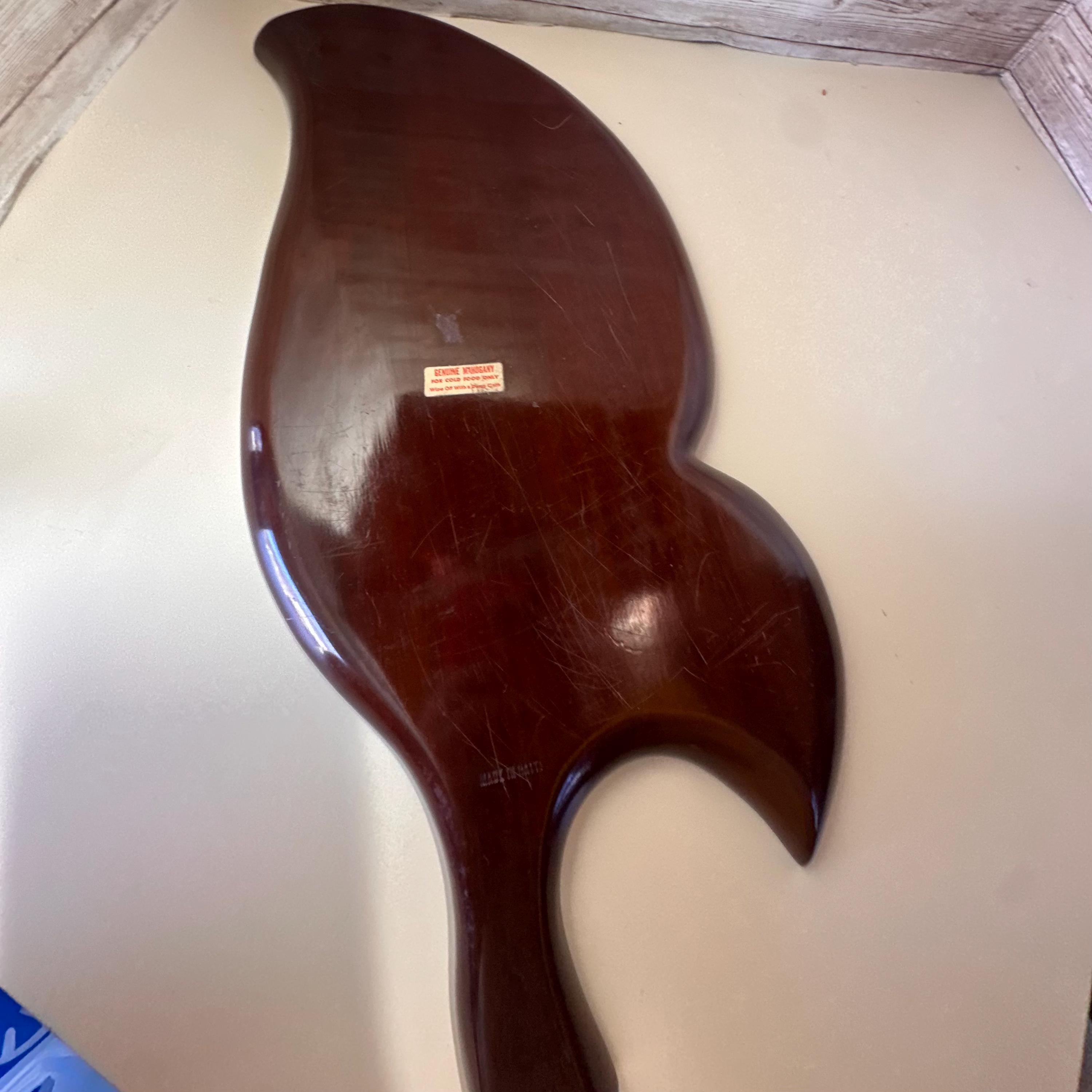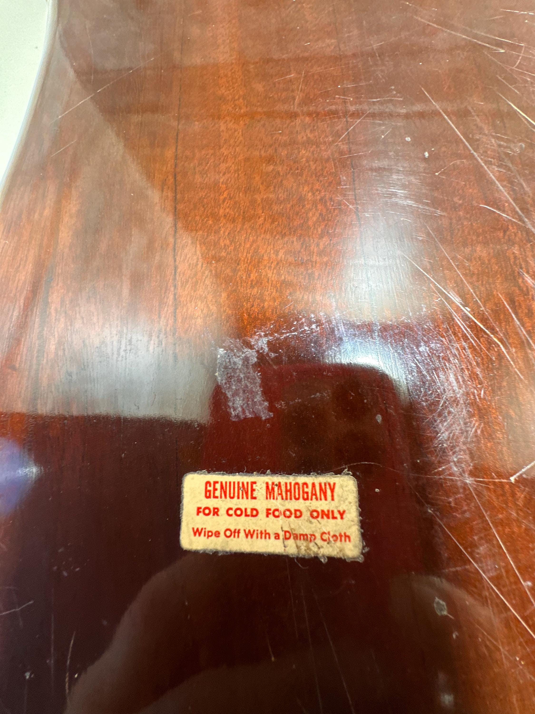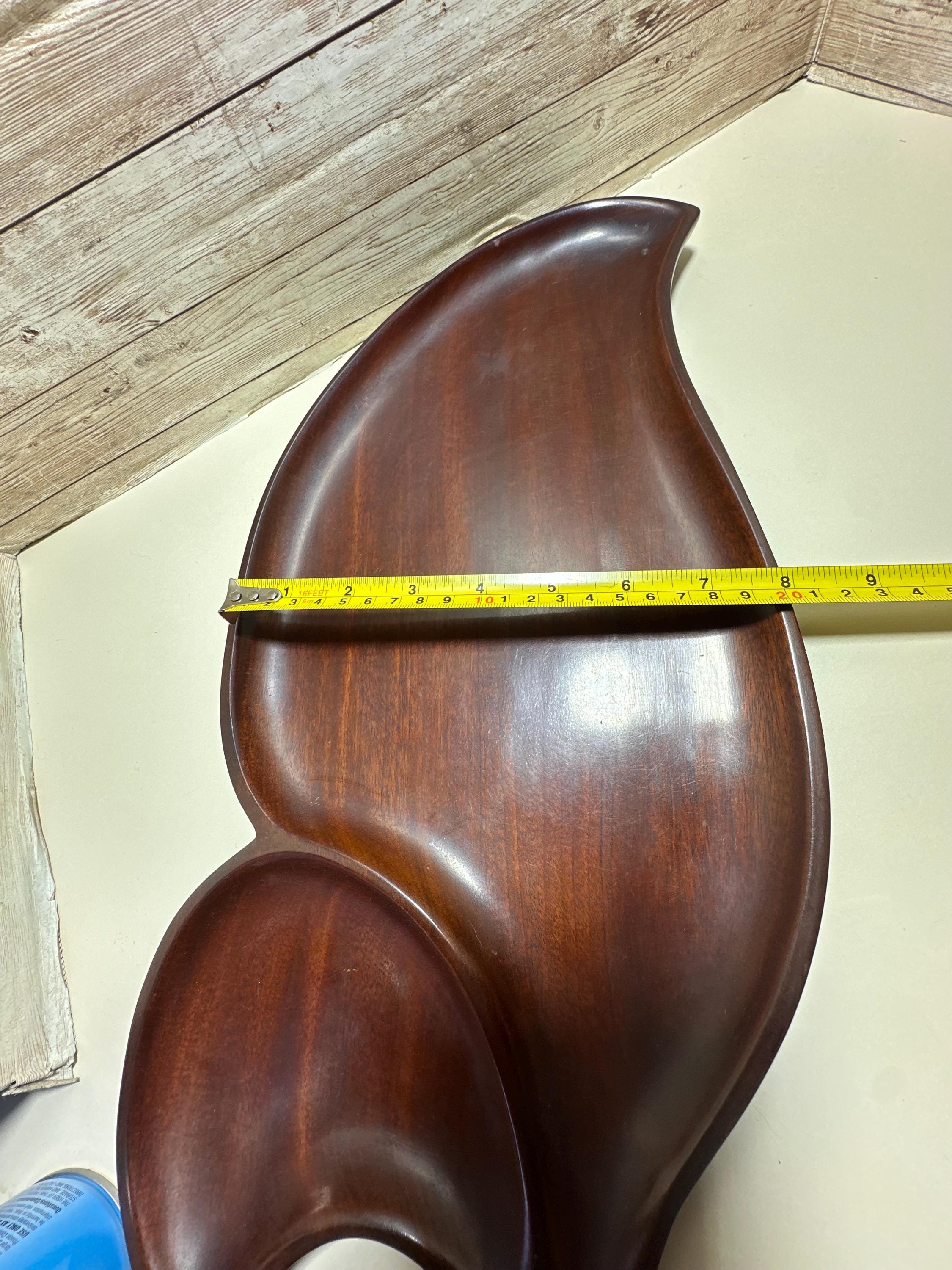 This vintage Mahogany Leaf Divided Wood Serving Tray exudes mid-century style perfect for entertaining. Crafted from mahogany wood with a beautiful Hawaiian-inspired pattern, this large tray features two compartments in the shape of a leaf. The brown color and botanical theme add a touch of elegance to any occasion. Made in the United States, this serving tray includes a handle for easy transportation, making it a practical and stylish addition to your kitchen or dining room.