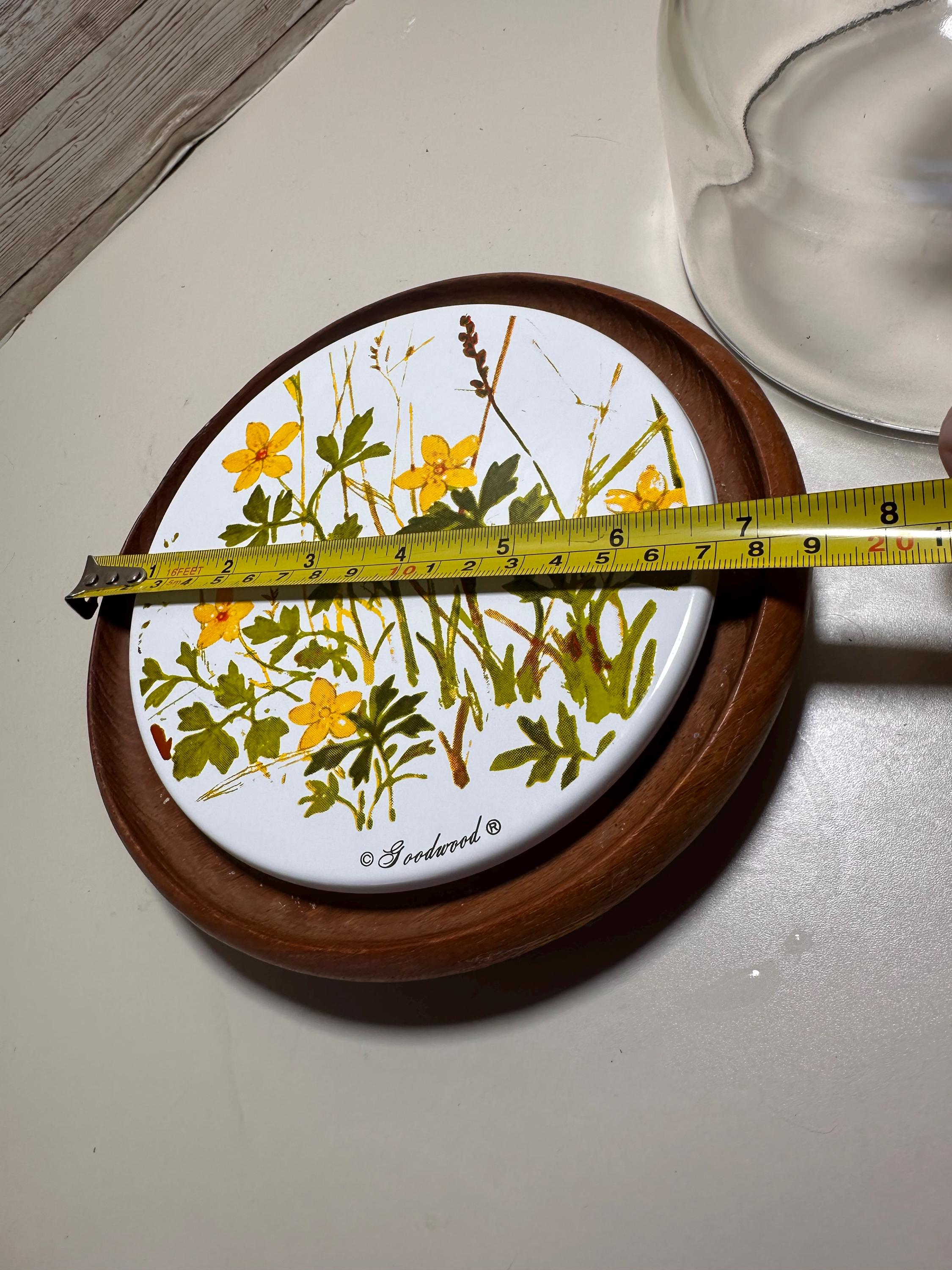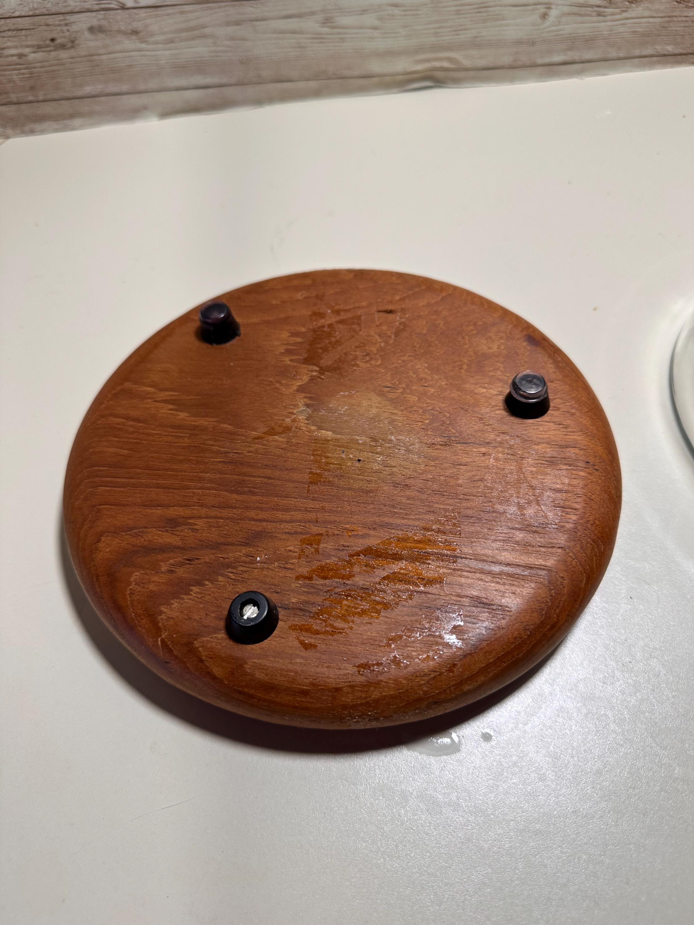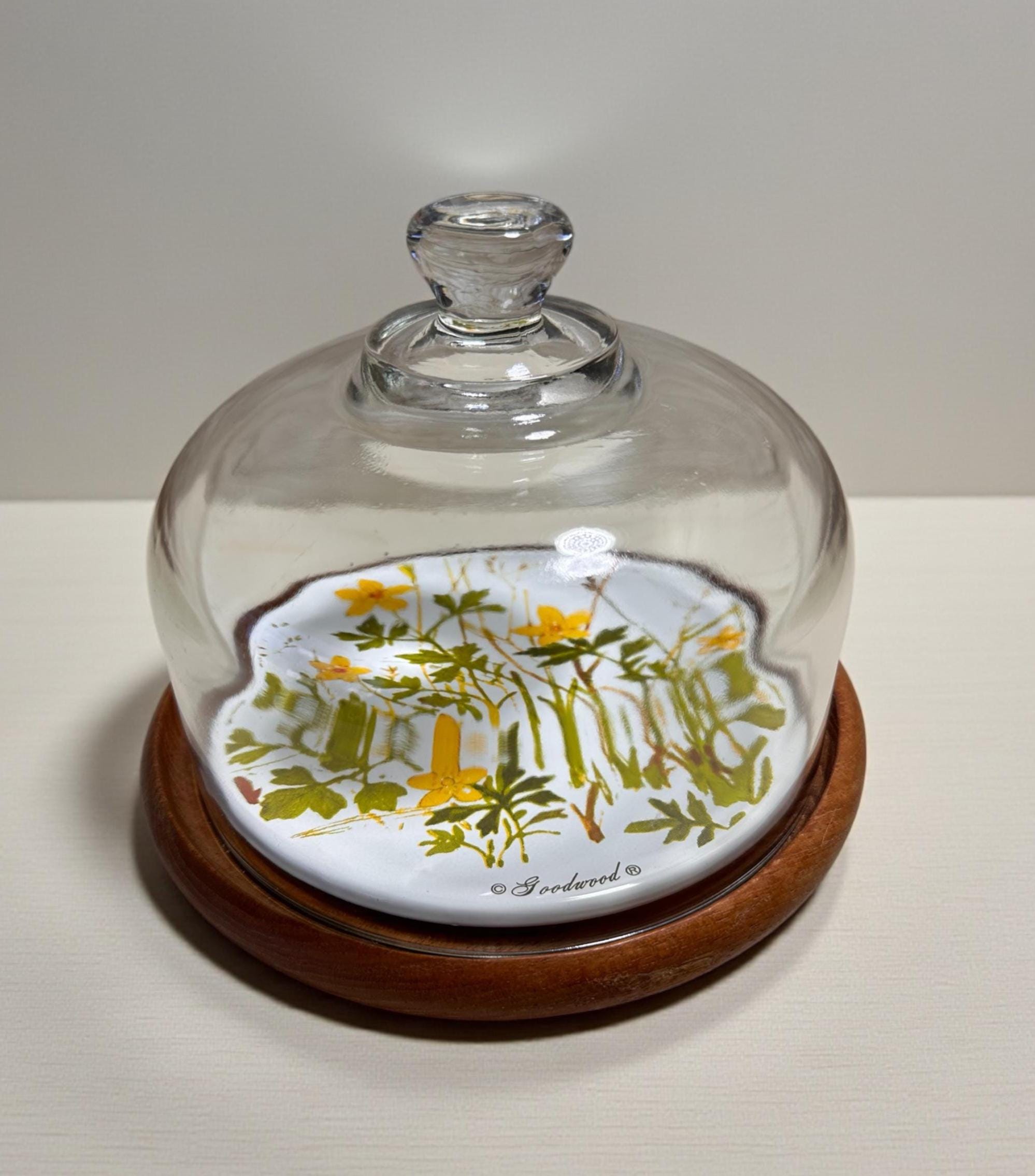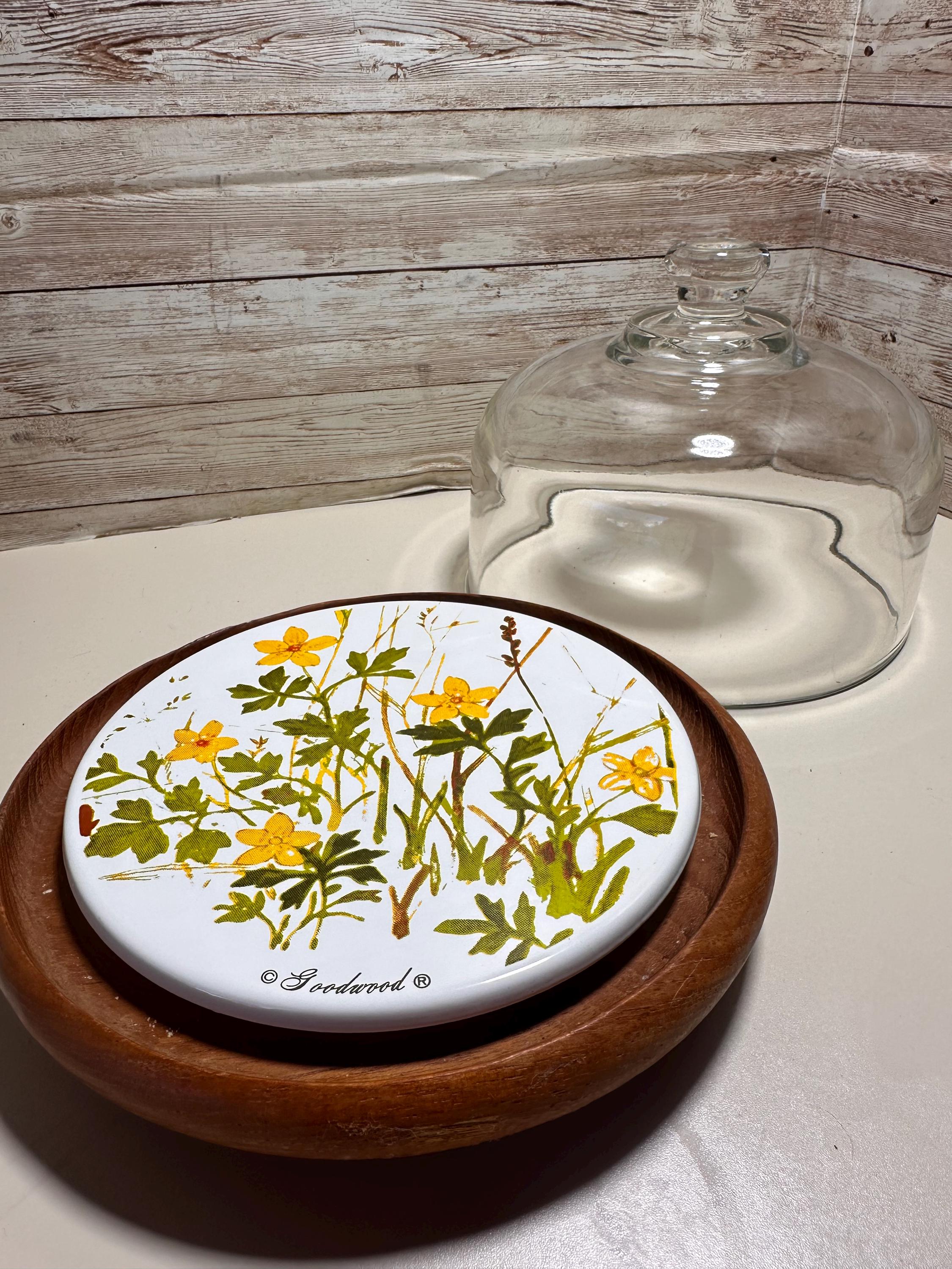 The Vintage Goodwood Genuine Teak Wood Cheese Board Tray with Glass Dome Cloche Lid is a charming piece of 1970s style serveware. Made from medium brown teak wood with a glass dome lid, this round serving tray features a single compartment and a unique all-over pattern. Perfect for all occasions, this original vintage piece adds a touch of nostalgia to any table setting. Crafted in Thailand, this collectible item includes a teak cutting board and a cloche, making it a versatile and stylish addition to any kitchen or dining room.