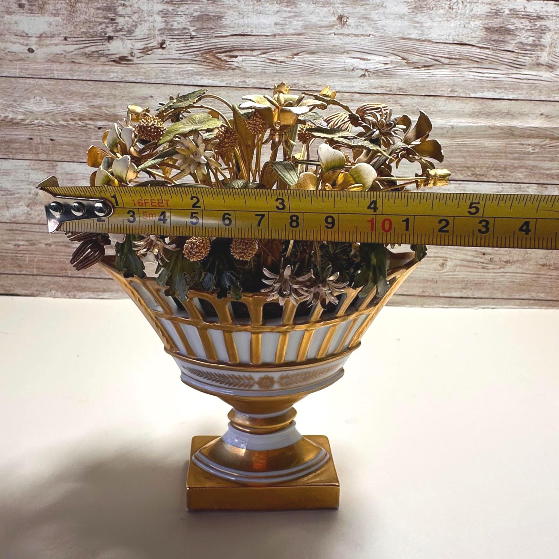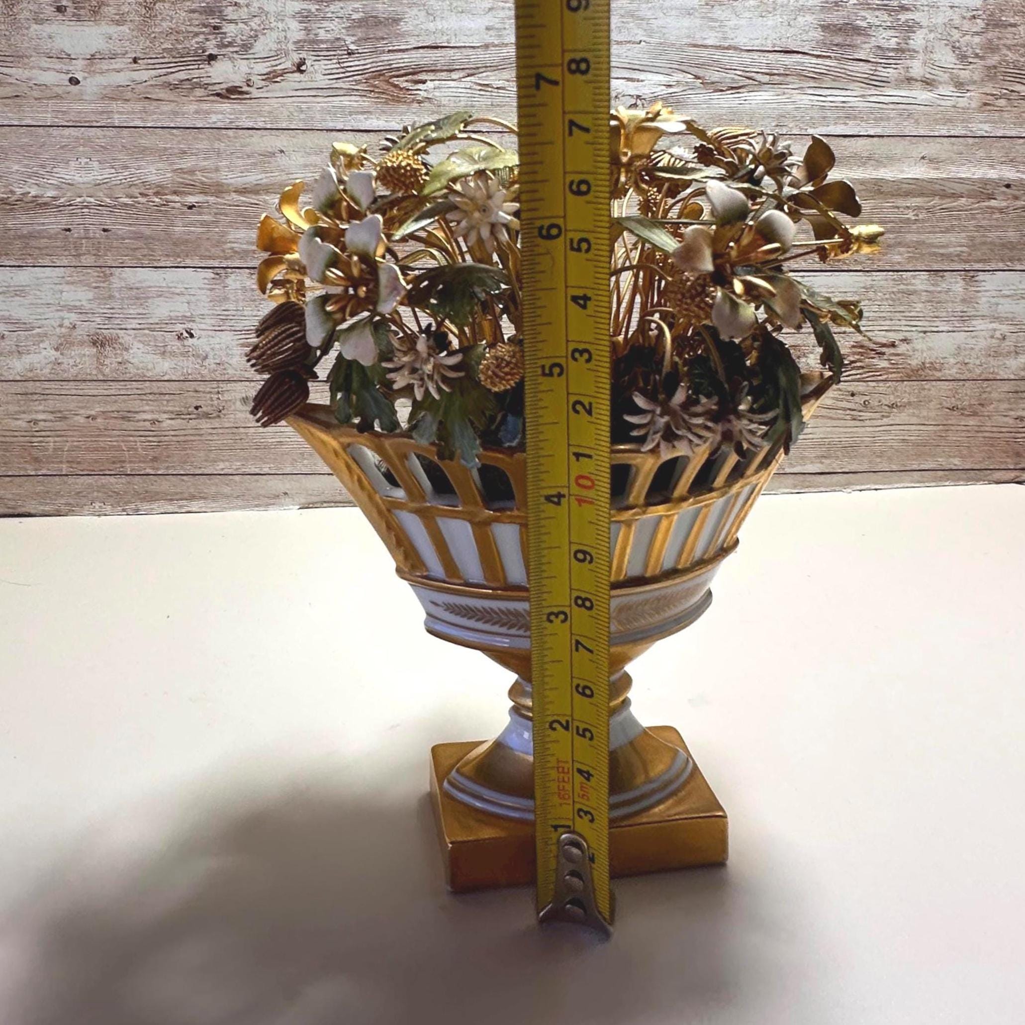 The Jane Hutcheson for Gorham Flowers Fleurs Des Siecles enamel porcelain in gold and white is a beautiful antique decorative collectible from the 1950s. Made with a mix of materials, this piece combines metal and porcelain to create a stunning floral design. The intricate details and elegant color scheme make it a unique and charming addition to any collection or home decor.