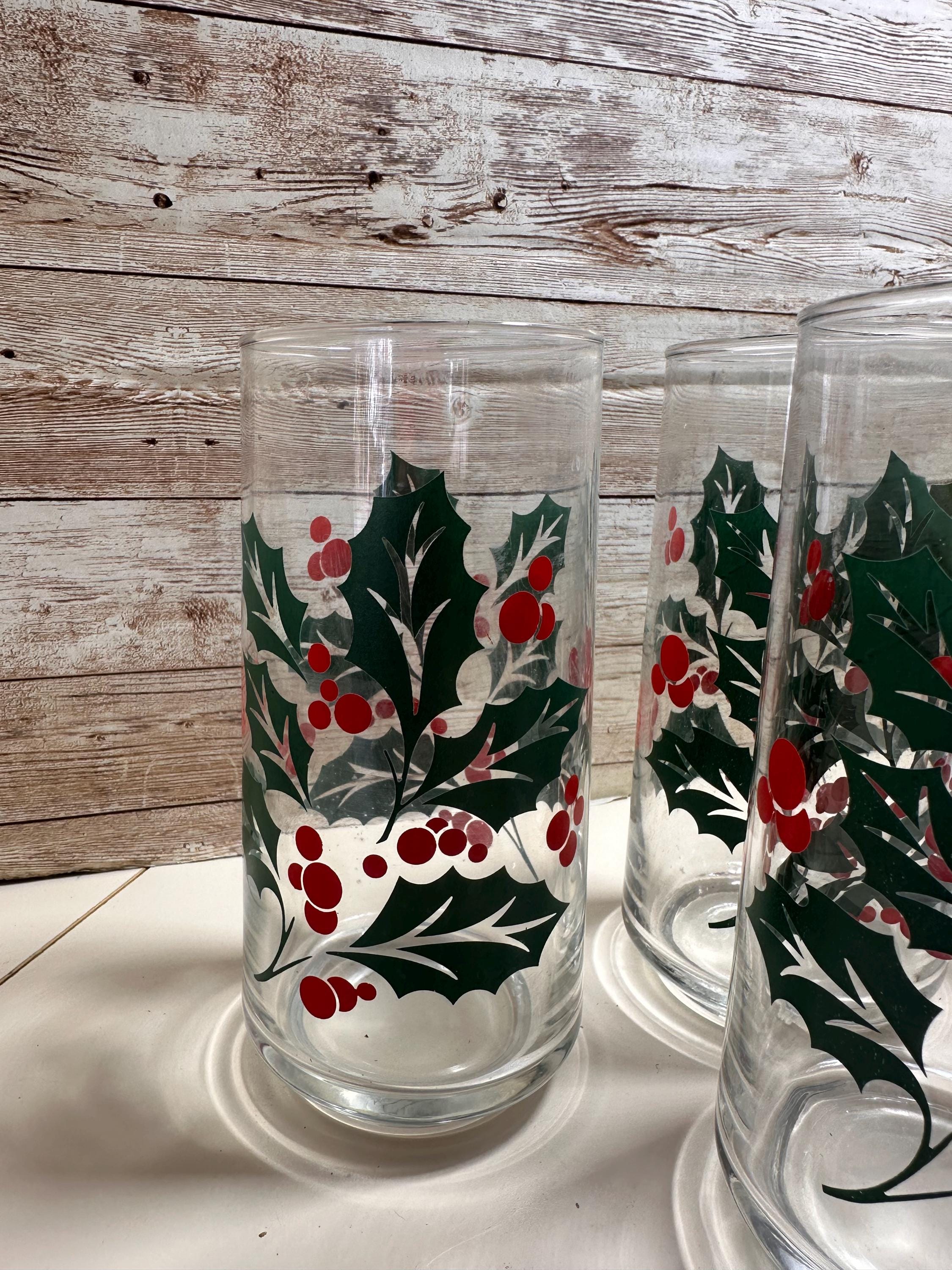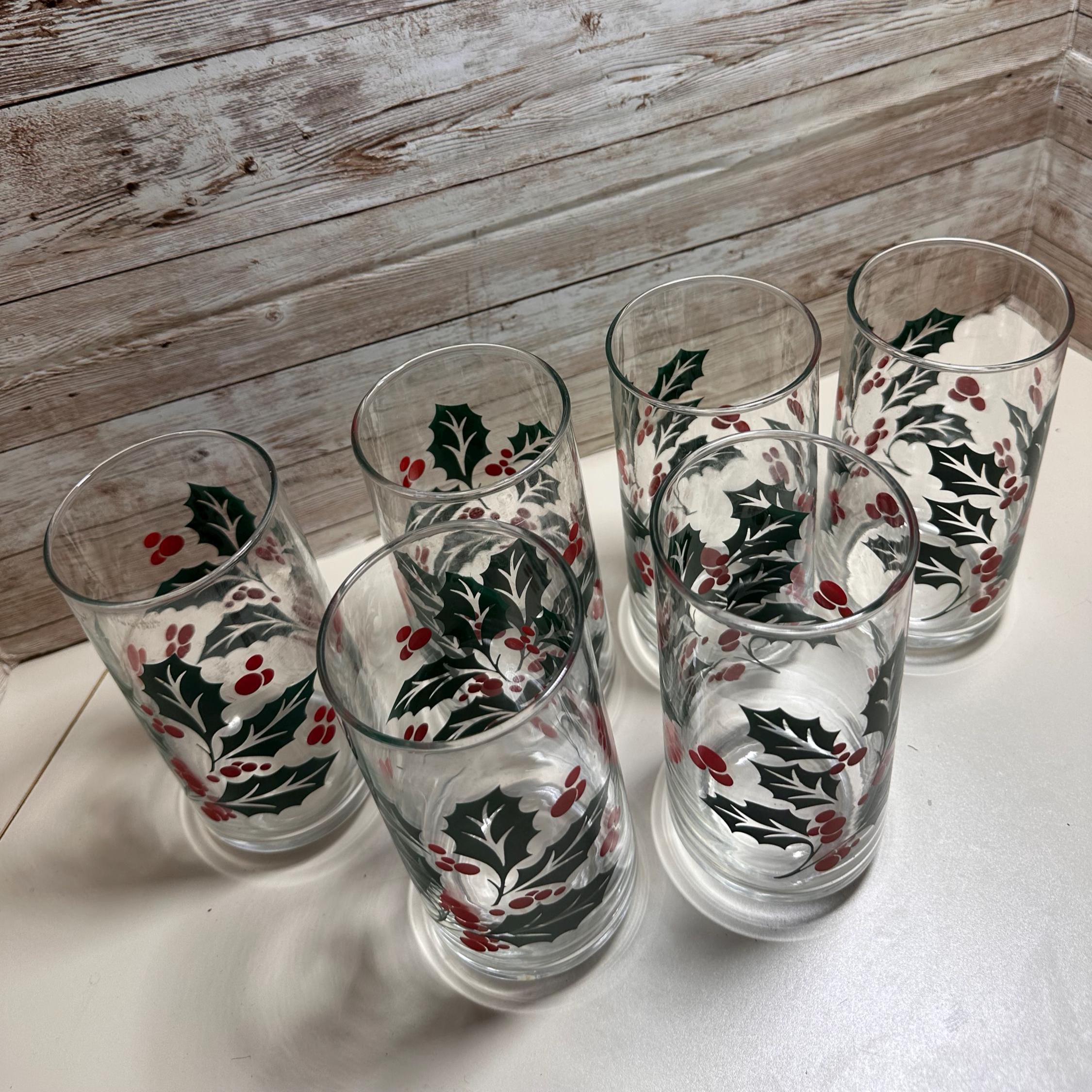 This product is a set of 6 vintage Indiana Glass Holly Berry Christmas glass tumblers, each with a capacity of 10 oz. The tumblers are round in shape and decorated with a multicolor Holly Berry pattern, making them perfect for adult use during the Christmas season. Made in the United States, these drinking glasses are hand wash only and feature a vintage/retro style. The tumblers are a festive addition to any home decor and add a touch of Christmas charm to dining and gatherings.