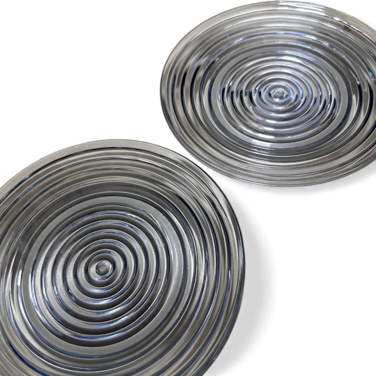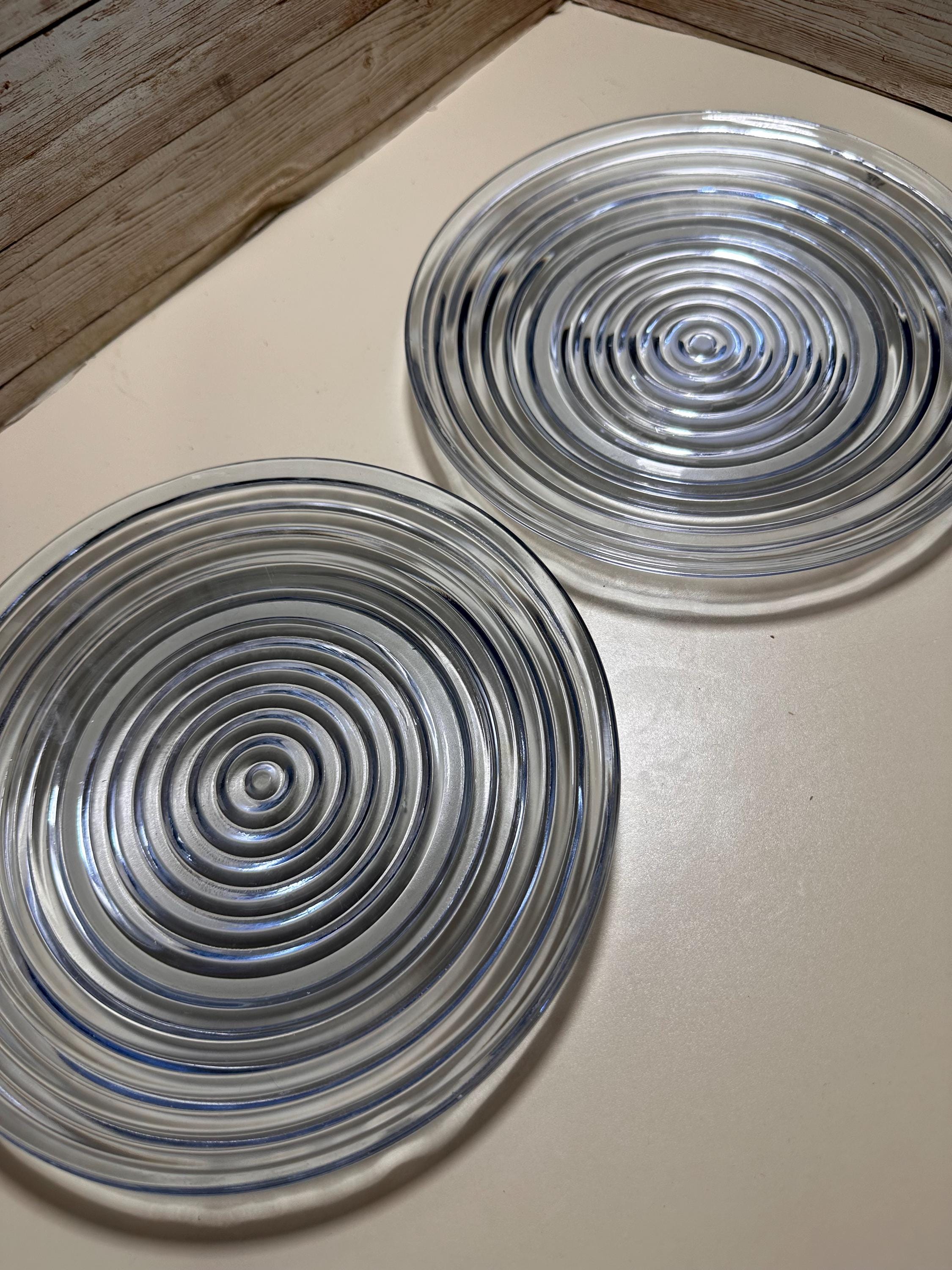 The product is a set of two vintage Anchor Hocking Park Avenue Manhattan lunch plates in ice blue rib ring design, measuring 8 inches in width. These plates are made of clear glass and showcase a city life theme, specifically related to Manhattan. Produced in the 1950s in the United States, these hand-blown glass plates are a part of the Manhattan product line by Anchor Hocking, known for its art glass production style. Perfect for collectors or those looking to add a touch of vintage charm to their dinnerware collection.