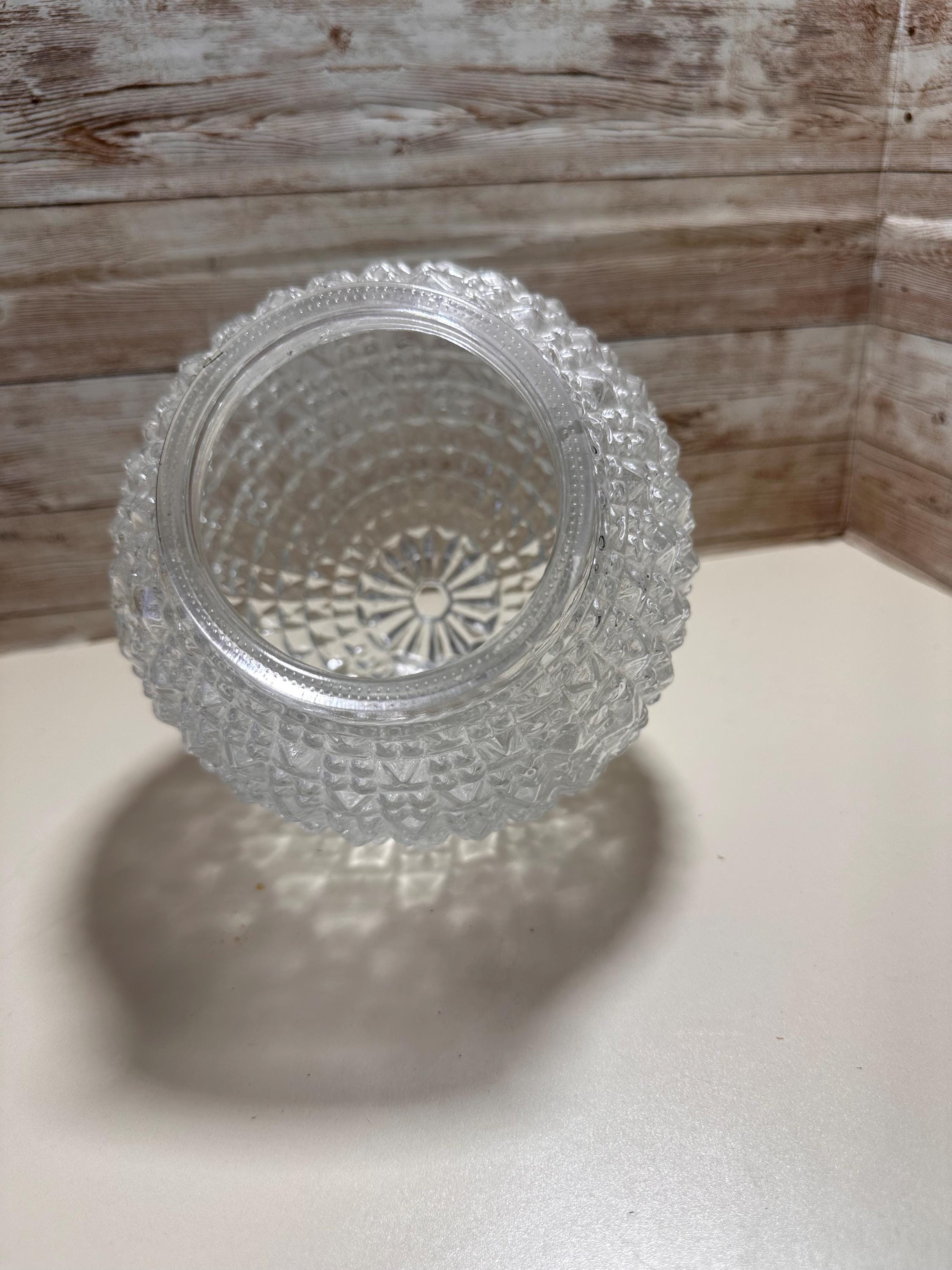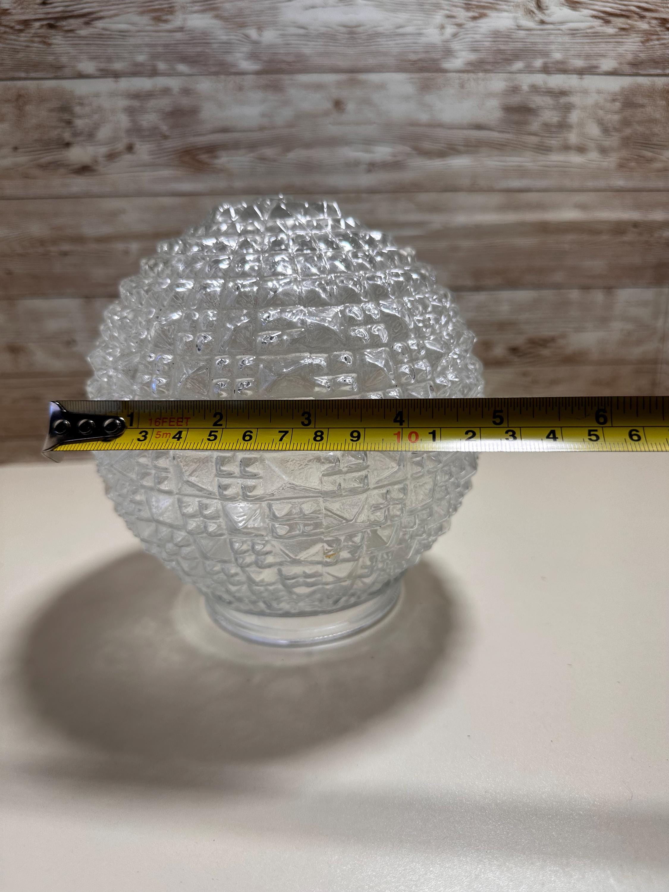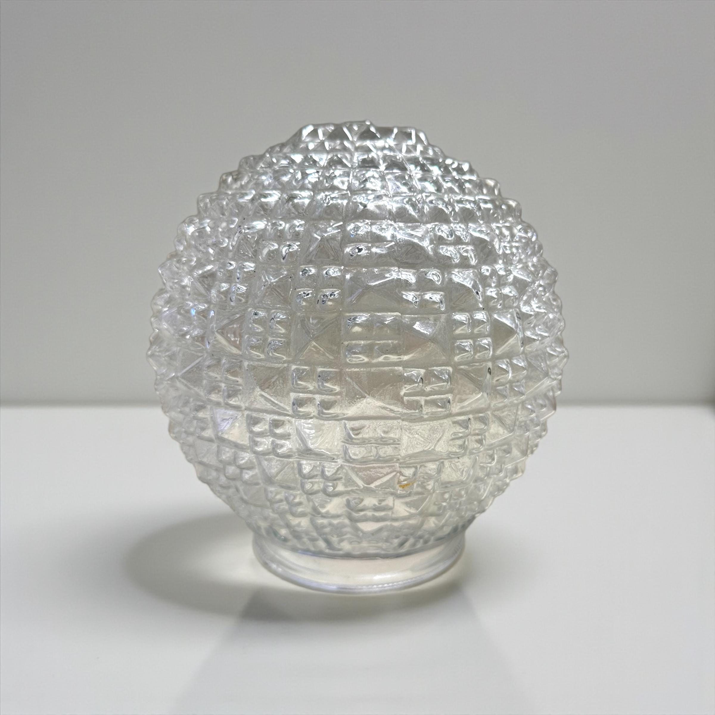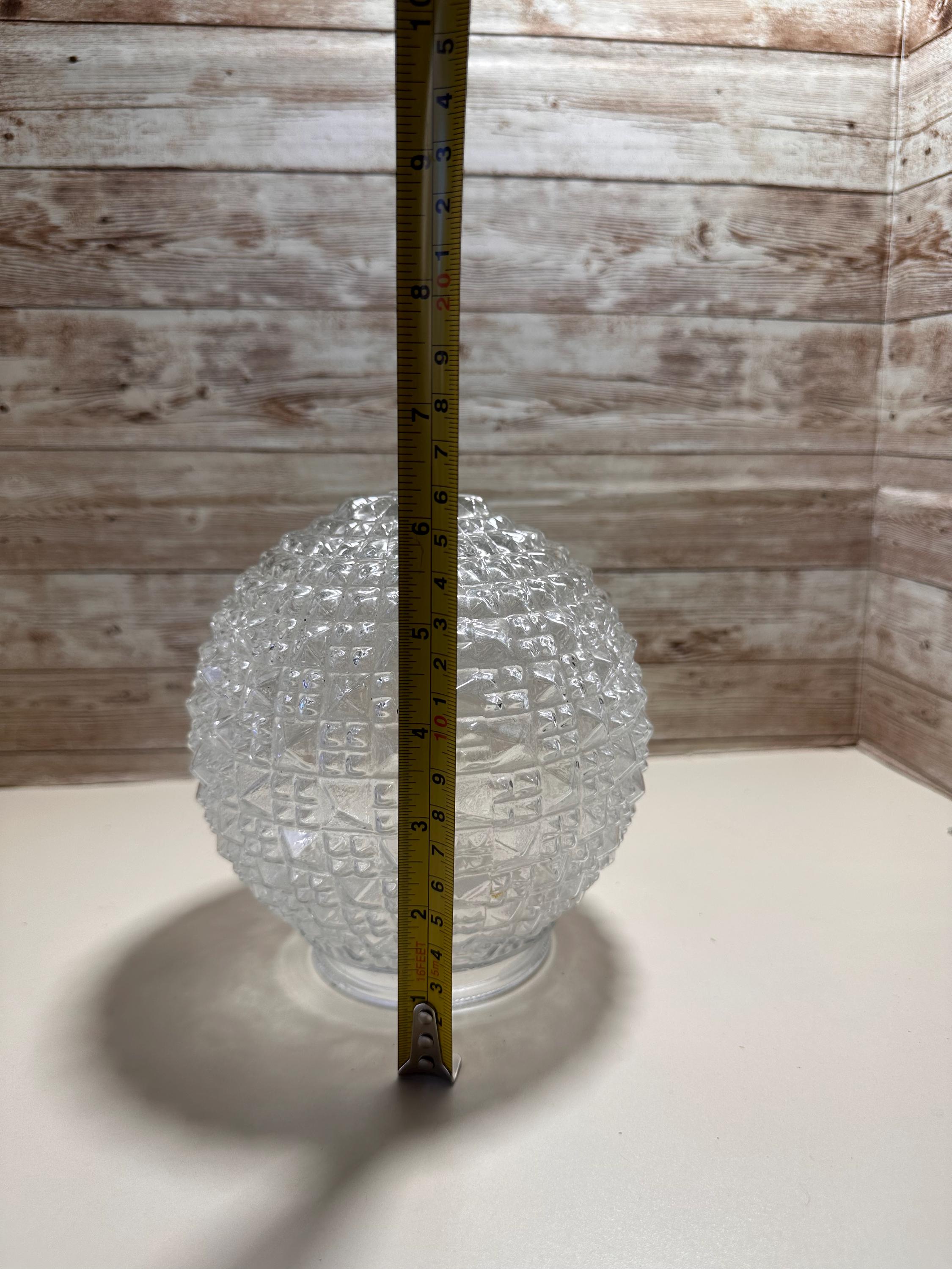 The product is a vintage MCM glass light shade with a dome cut diamond quilt pattern. This orb-shaped lamp shade has a geometric square design and is made of white glass, giving it a unique and retro appeal. It is specifically designed for a ceiling lamp and has a diameter of 3 inches, making it a stylish and eye-catching addition to any lighting fixture. The vintage nature of the shade adds a touch of nostalgia to any space it is used in, making it a desirable collectible for those who appreciate mid-century modern design.