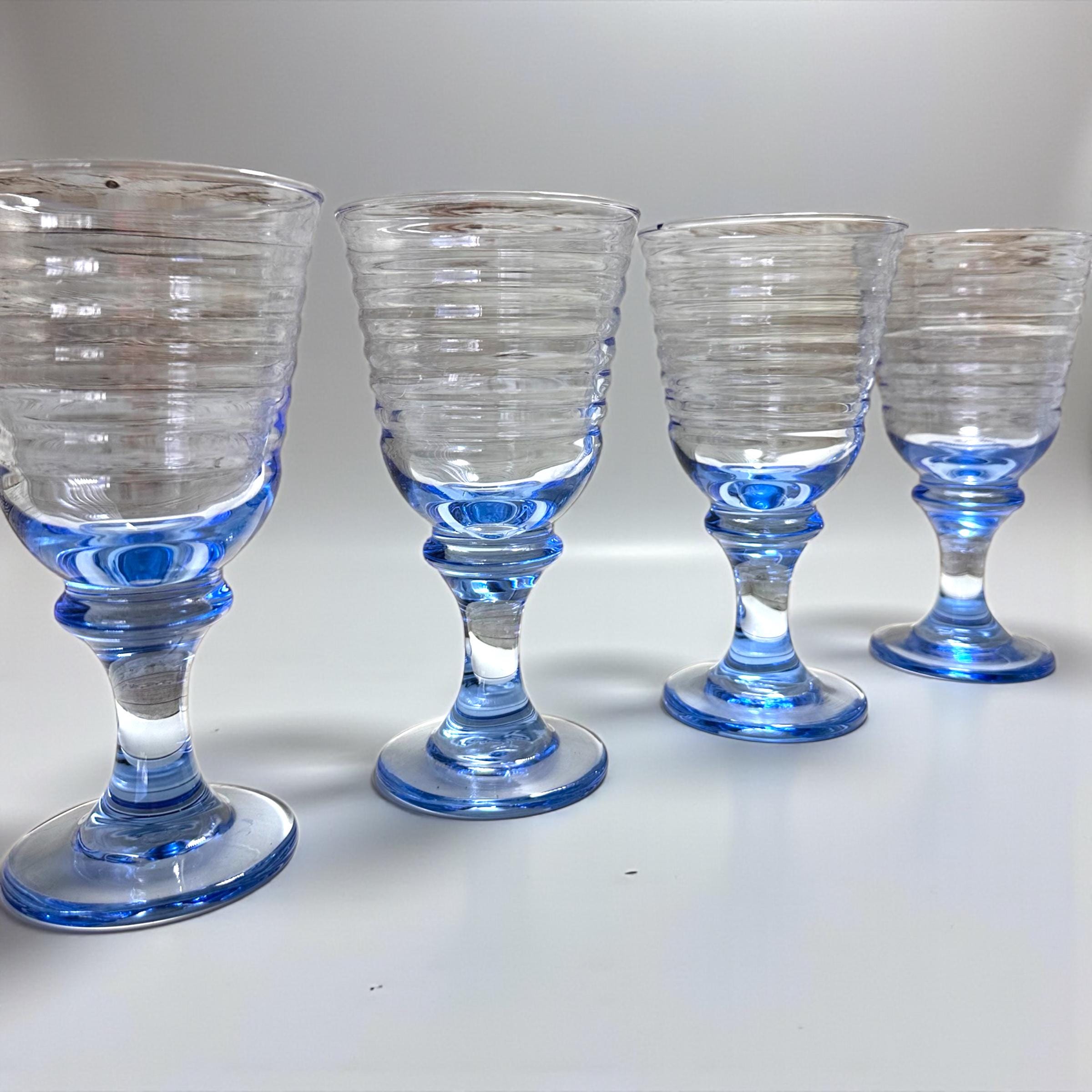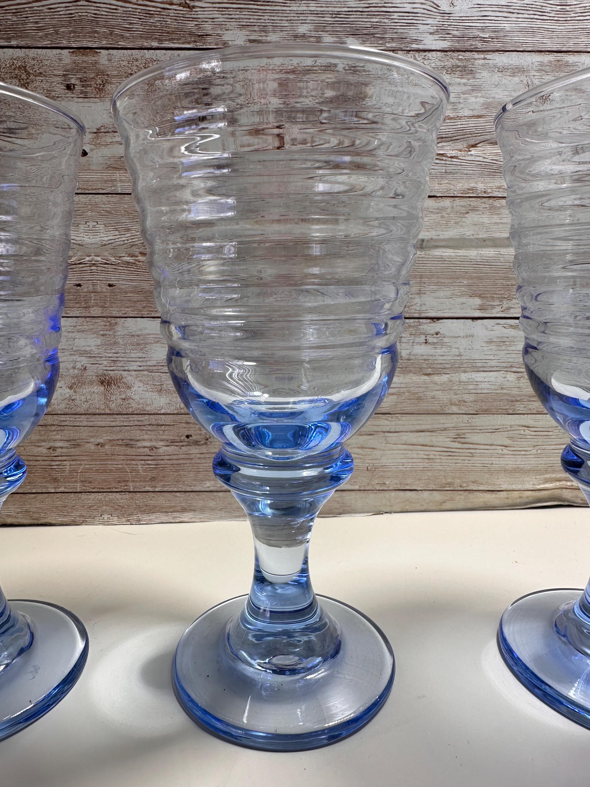 The LIBBEY Sirrus Blue Water Tea Goblets are a set of four vintage stemmed wine glasses made of glass in a light blue color. With a capacity of 12 oz and a height of 7 inches, these goblets are perfect for all occasions and feature a round shape and glossy finish. Manufactured in 1997 in the United States under the LIBBEY Sirrus product line, these mid-century modern glasses have an impressed backstamp and are a stylish addition to any drinkware collection. Ideal for both men and women, these goblets offer a unique and elegant touch to your table setting. **No Return Policy**