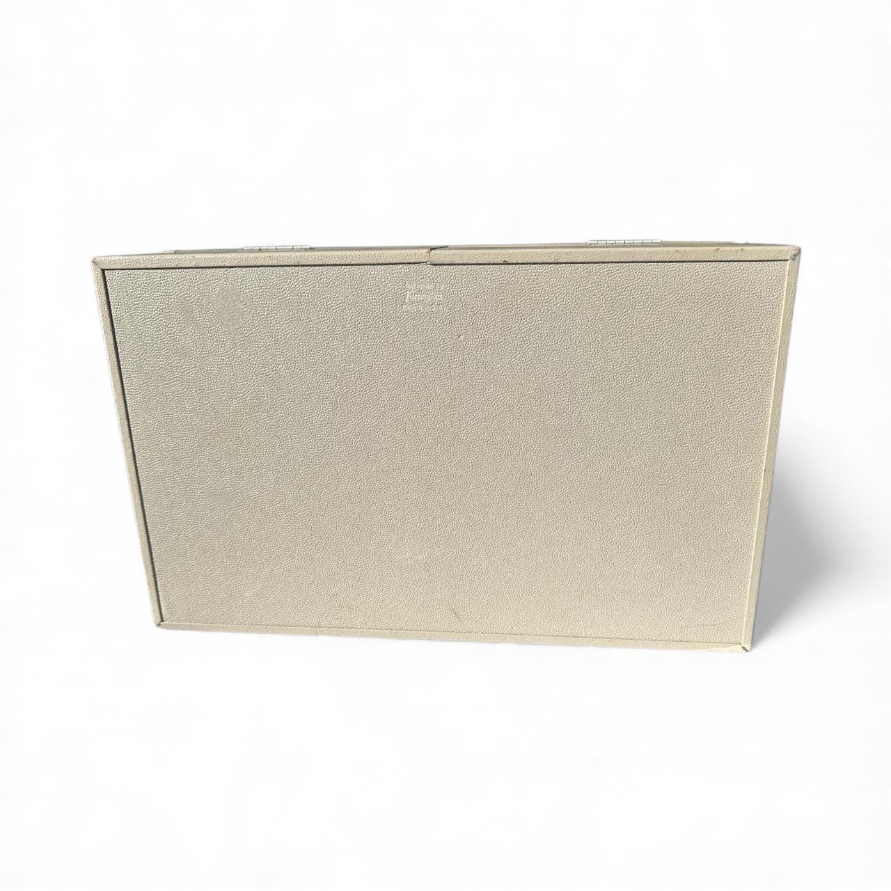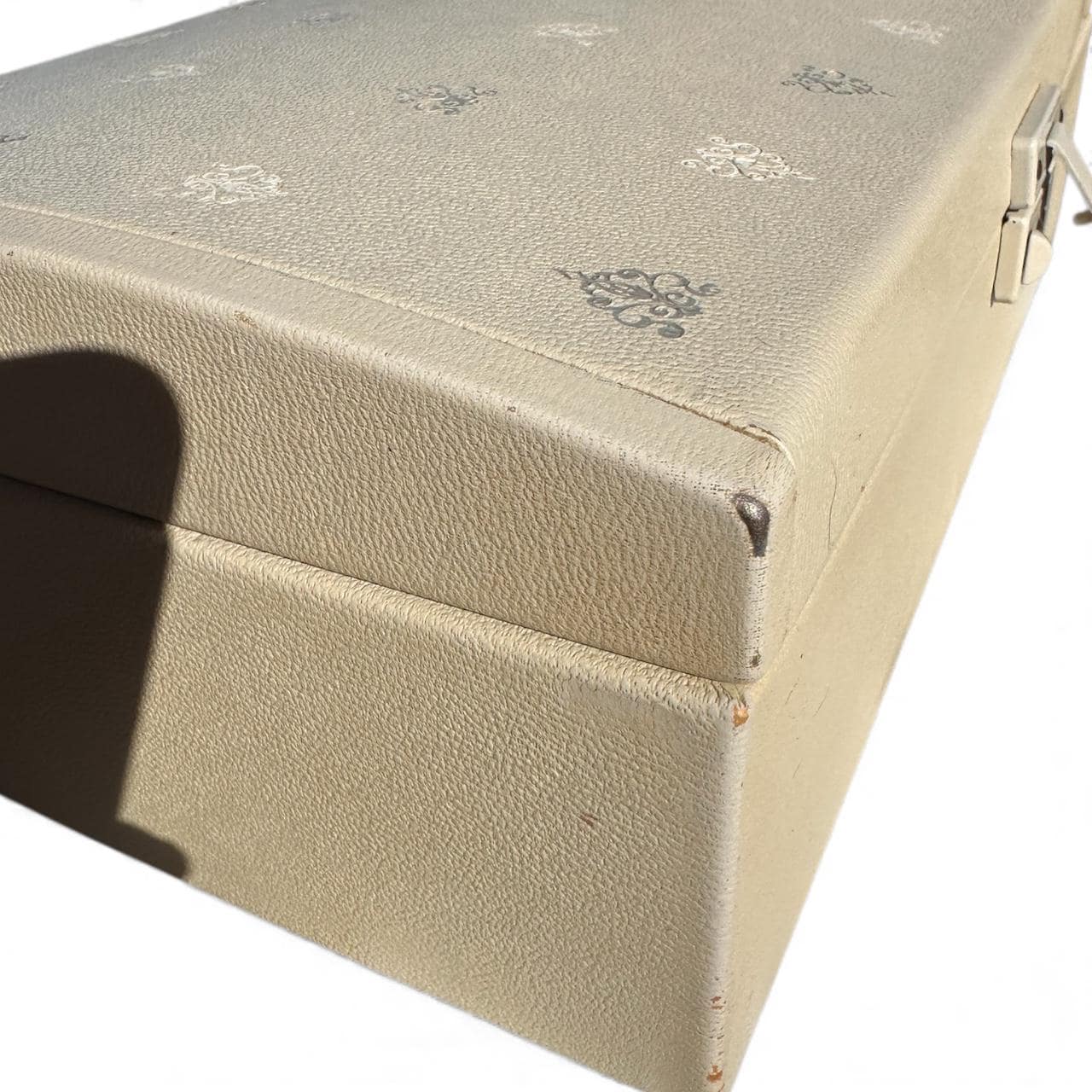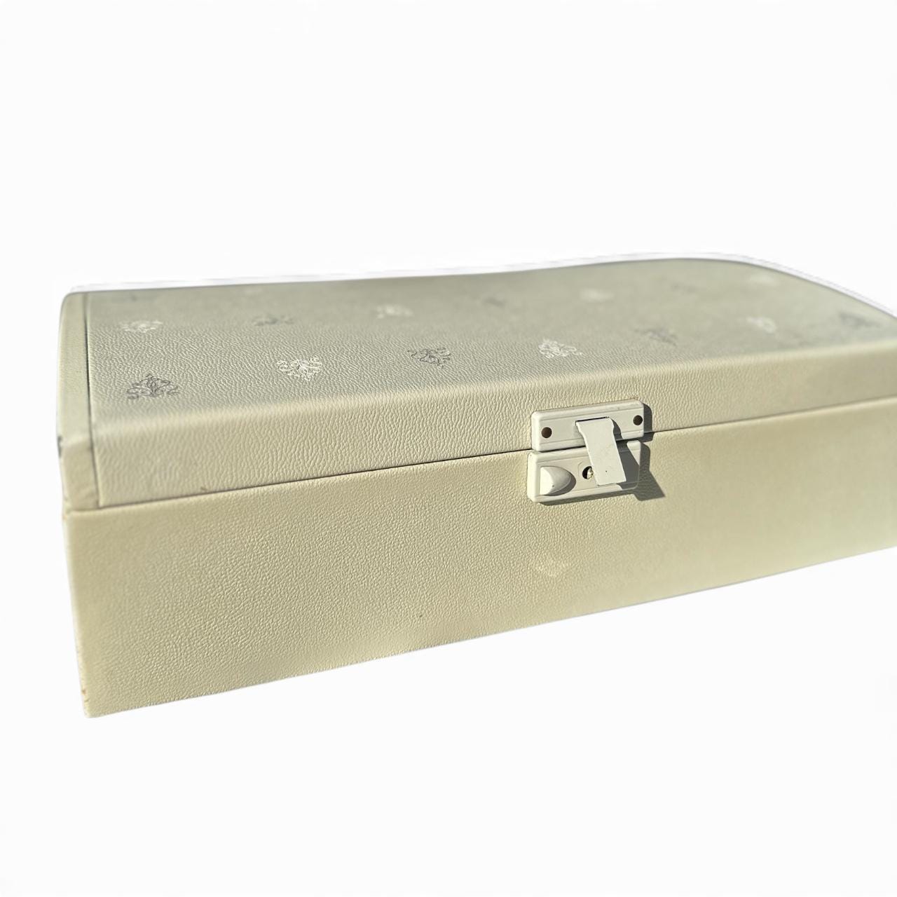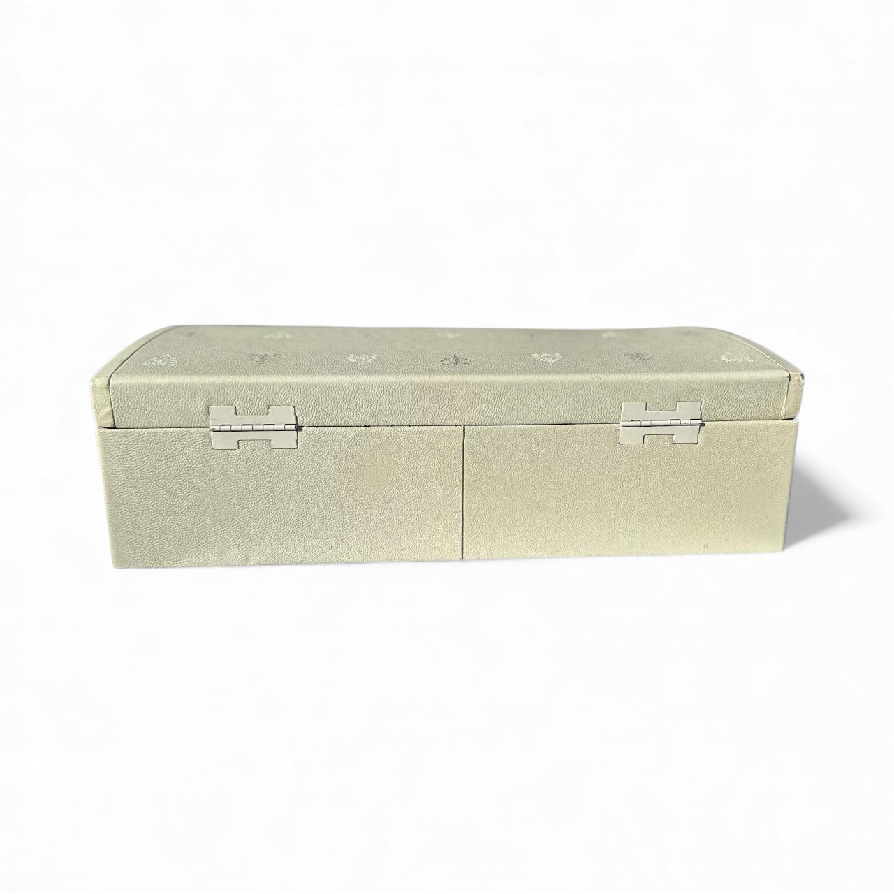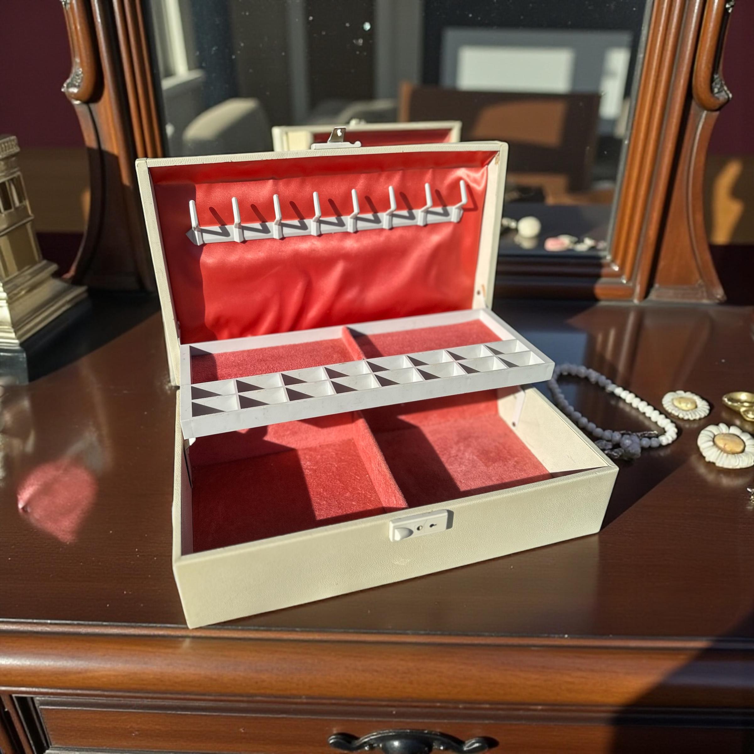 The Vintage Farrington Jewelry Box is a large, cream hinged box from the mid-century era. It is lined with pink velvet and exudes a vintage charm, making it a stylish and practical storage solution for jewelry. The cream color and luxurious velvet material add a touch of elegance to any room, while the hinged design allows for easy access to the contents inside. Perfect for organizing and showcasing your treasured jewelry pieces in a timeless and classic way.