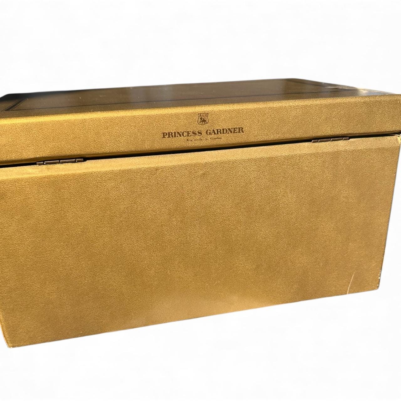 VTG Large Gold Princess Gardner Jewelry Box is a vintage-inspired piece with a luxurious feel. Made of satin and lined with velvet, this 3-tiered box features a rectangular shape and comes with a key for safekeeping. The gold color adds a touch of glamour, making it a perfect organizer for your jewelry collection. Designed by Princess Gardner and originating from Sweden, this jewelry box is a stylish and practical addition to any vanity or dresser.