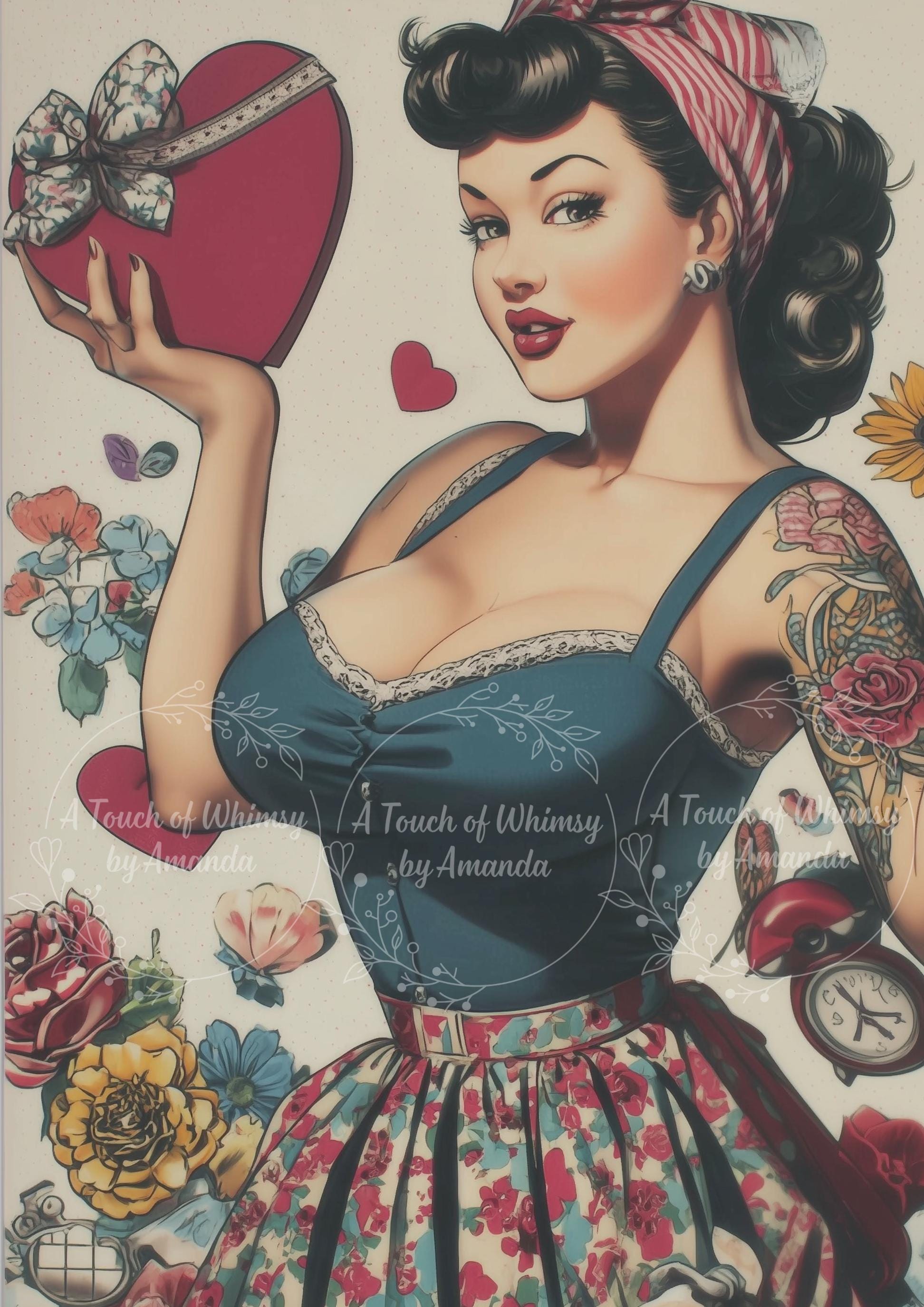 A sassy pin-up girl with vintage vibe. Styled with retro glamour and perfect for valentines day this design is perfect for adding a feminine yet rebellious flair to decoupage, junk journals, and mixed media projects