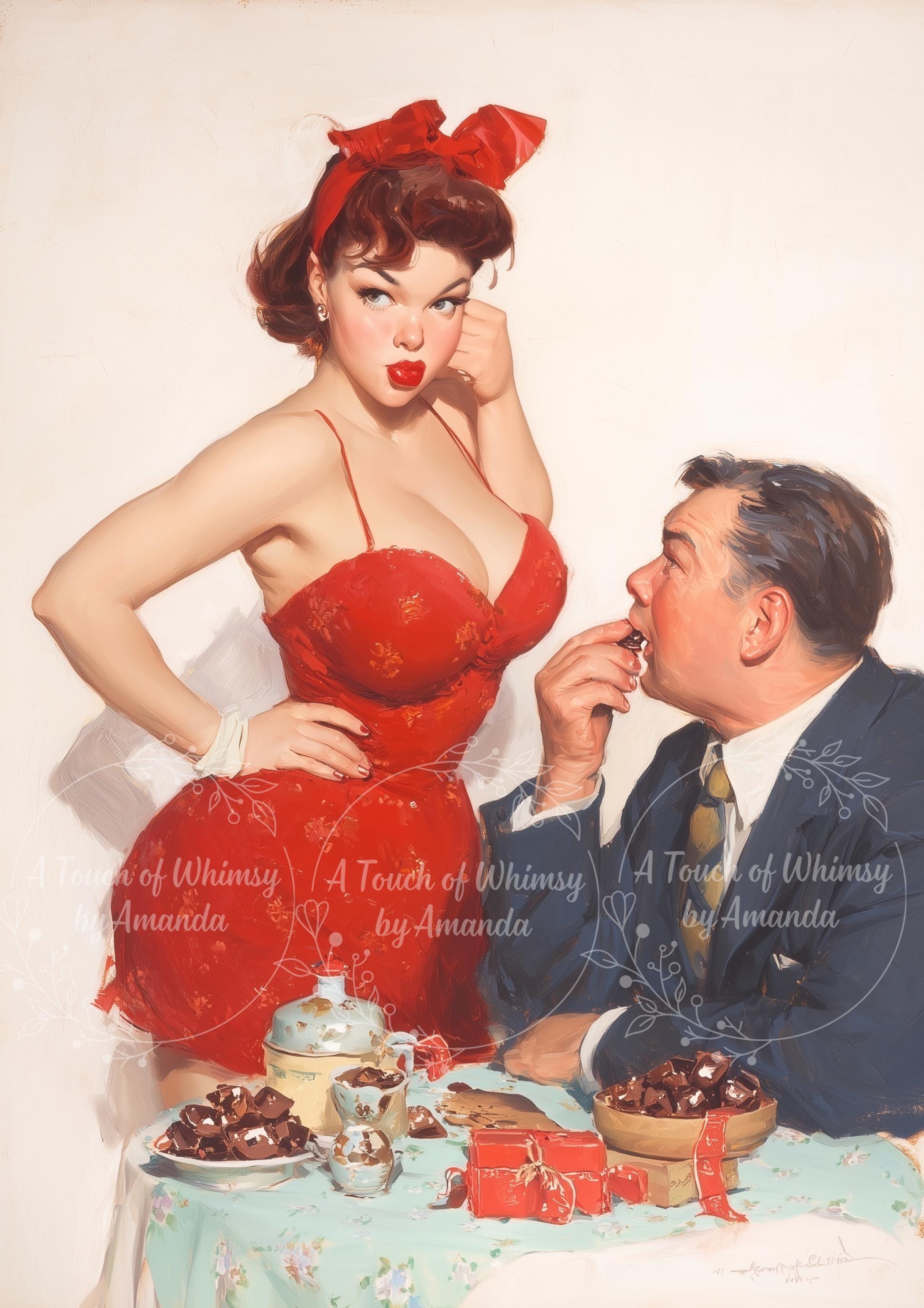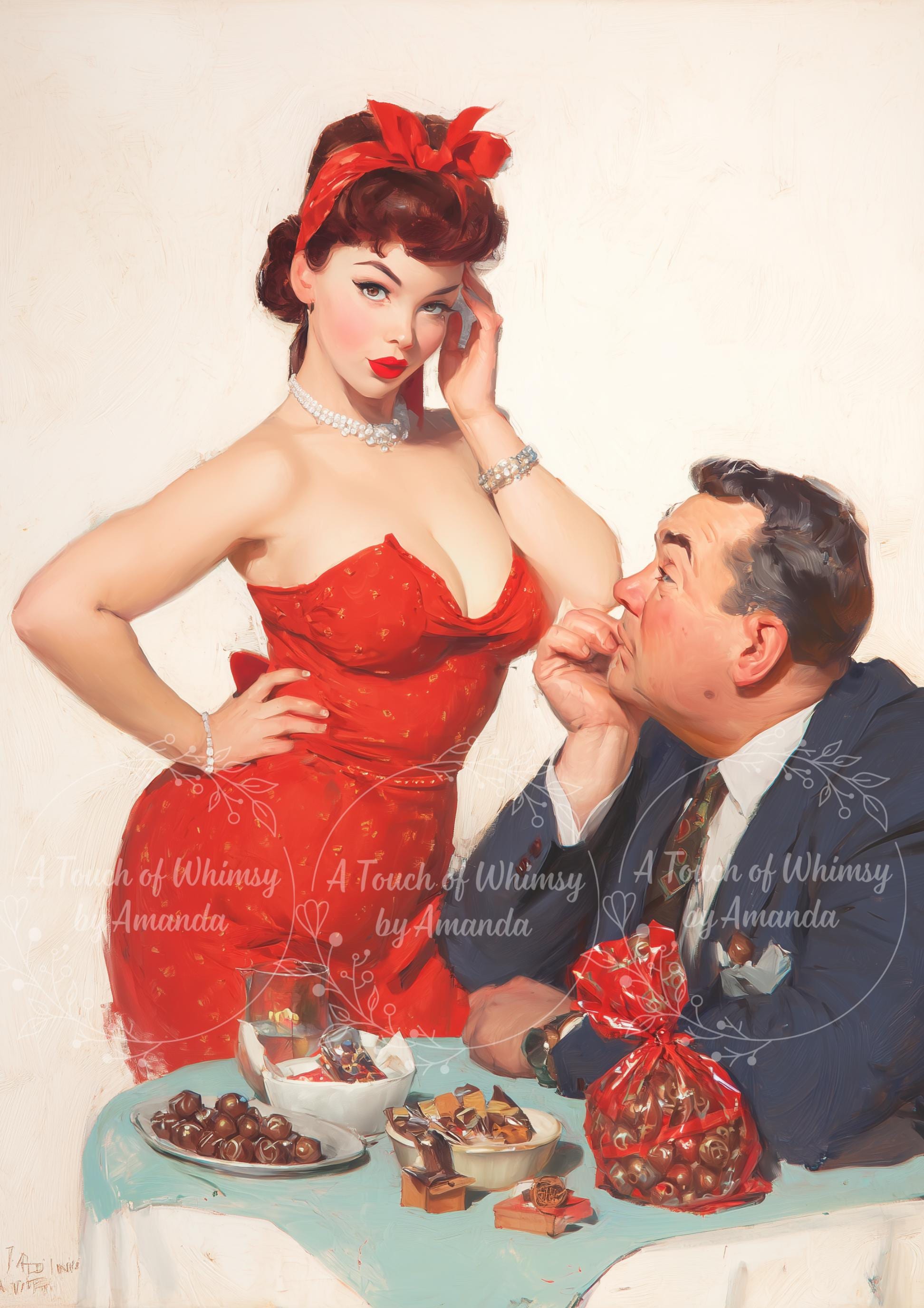 A sassy pin-up girl with a bold red vintage dress with a guy eating chocolates.Styled with retro glamour and perfect for valentines day this design is perfect for adding a feminine yet rebellious flair to decoupage, junk journals, and mixed media projects