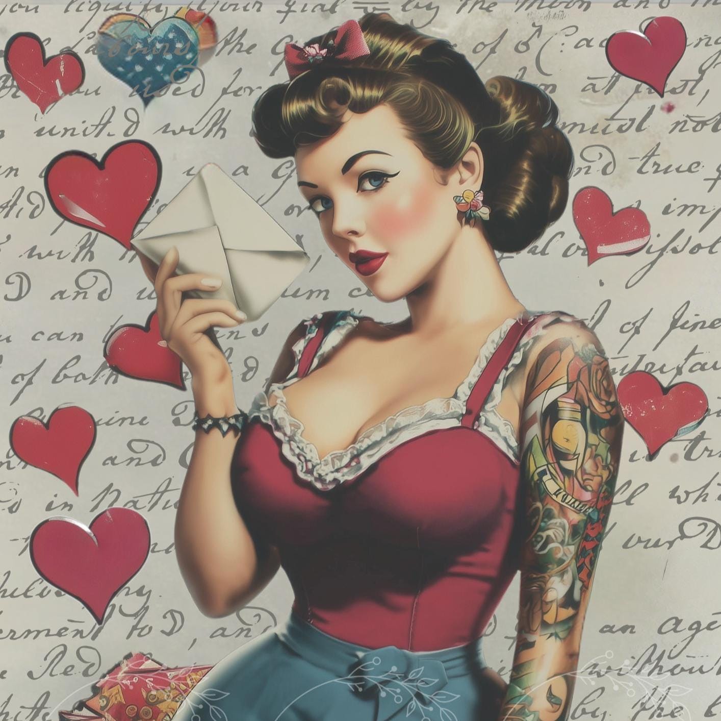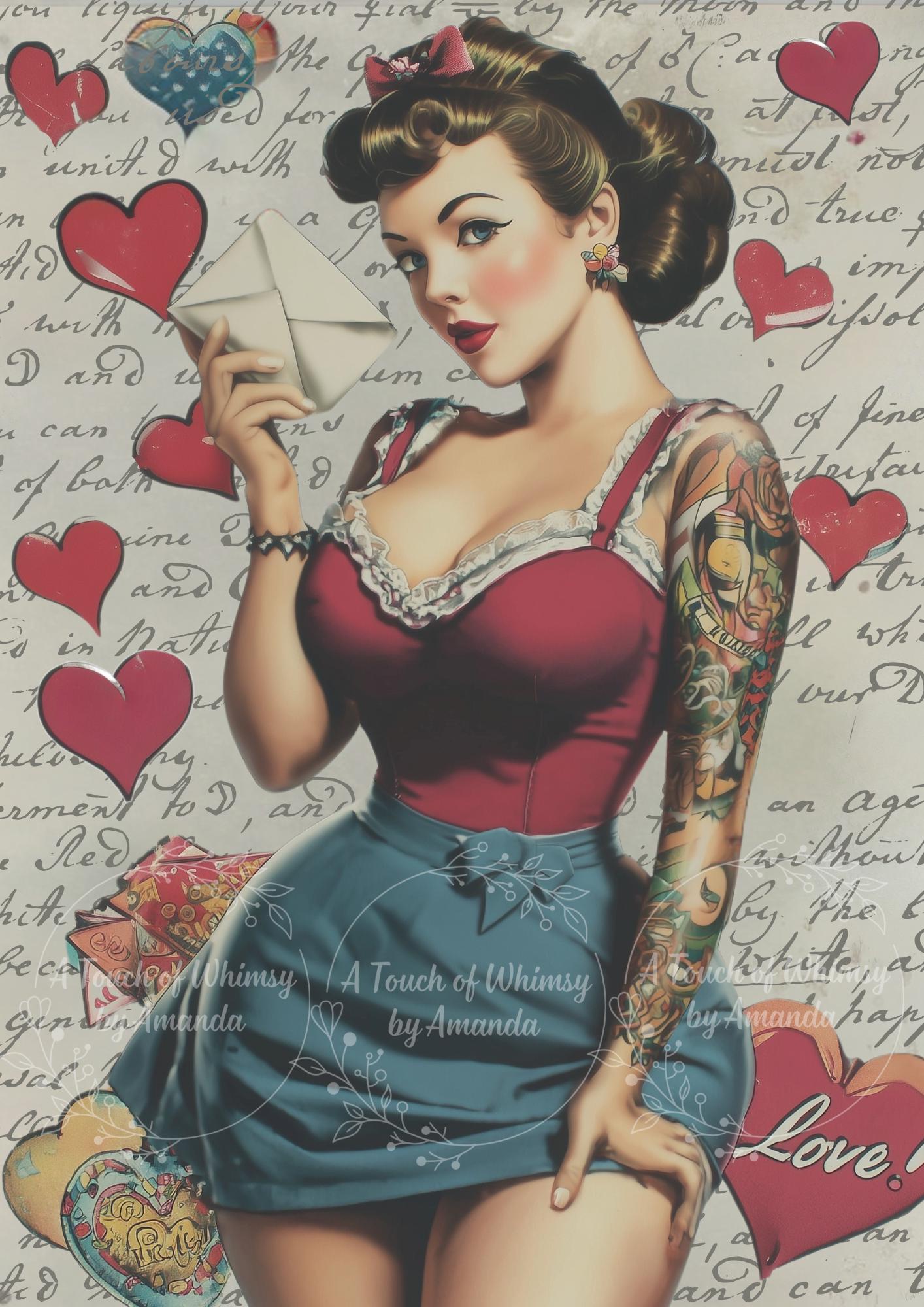 Pin-up girl with a classic 1950s vintage vibe, love letter and hearts. Styled with retro glamour and playful charm, she’s perfect for vintage-inspired crafts, decor, junk journals, and mixed media projects.