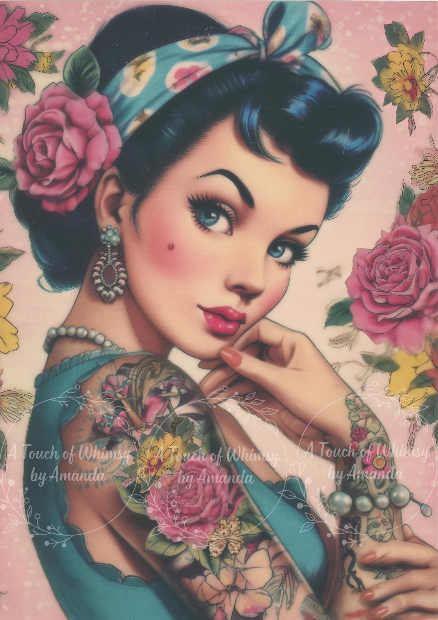 A pin-up girl with vintage vibe. Styled with retro glamour this design is perfect for adding a feminine yet rebellious flair to decoupage, junk journals, and mixed media projects