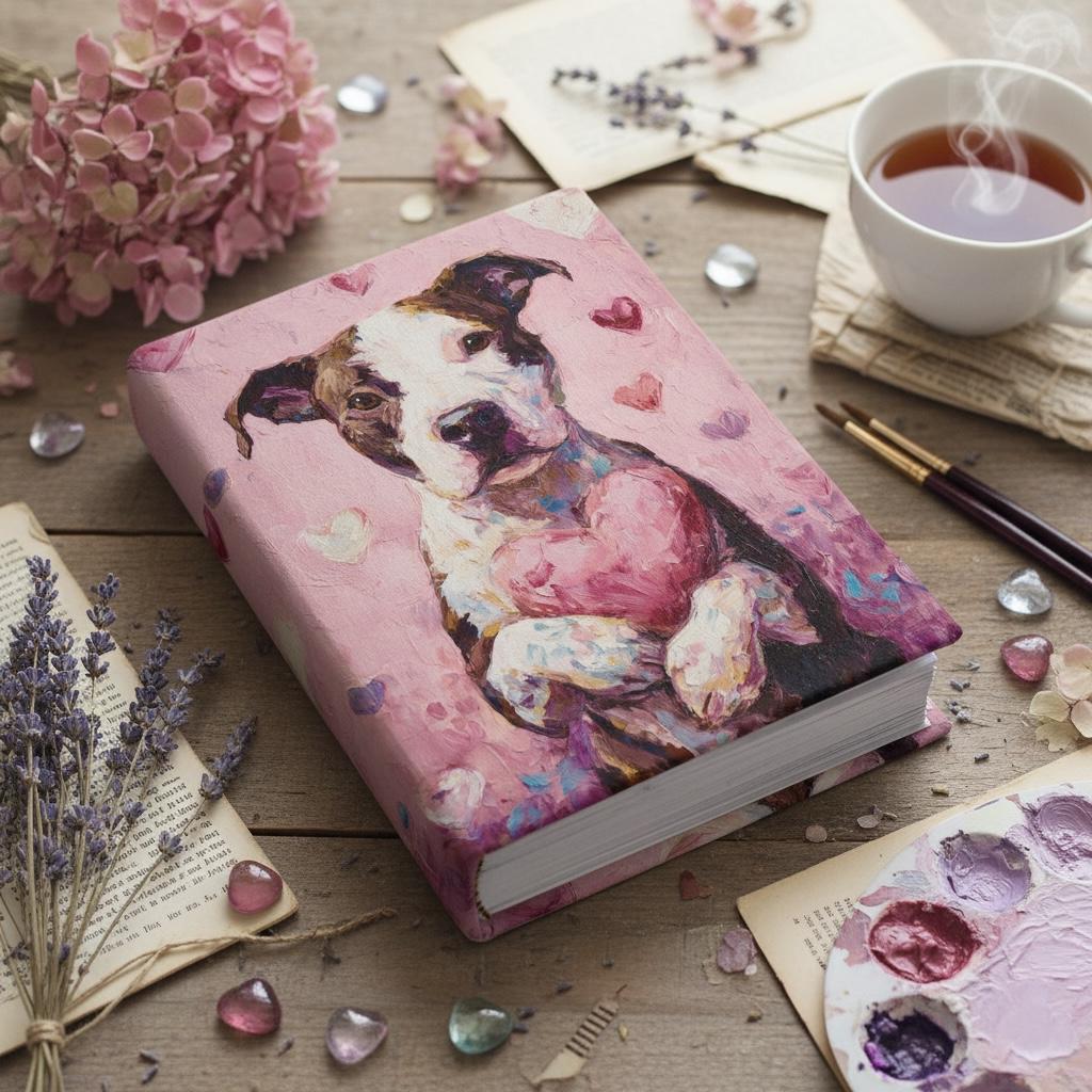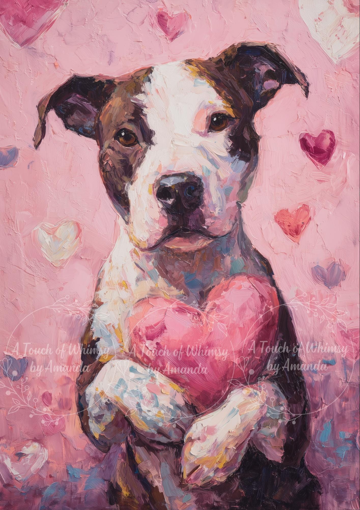 Adorable textured decoupage paper featuring a pitbull holding a pink heart on a soft pink background. The painterly style and sweet pup design are perfect for Valentine’s crafts, dog-lover projects, junk journals, cards, and DIY décor that needs a bold yet heartwarming touch.