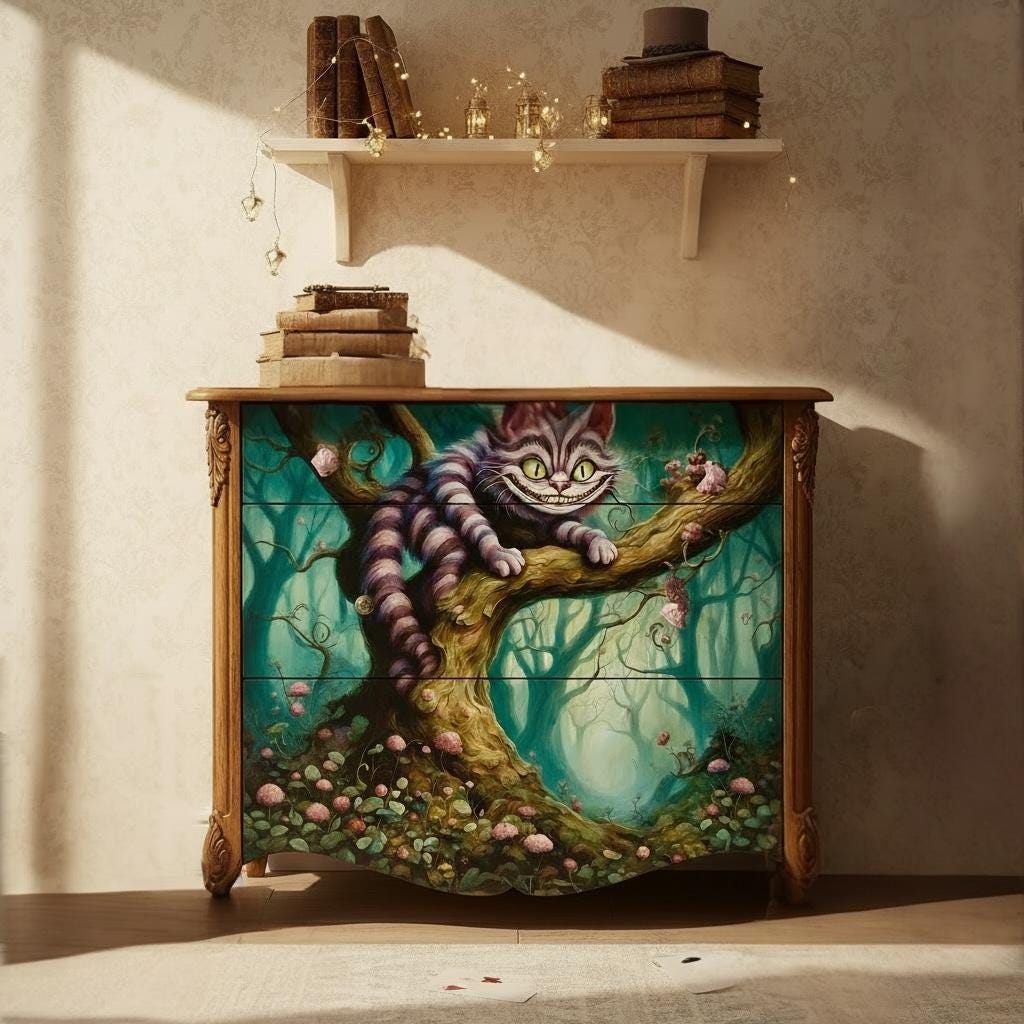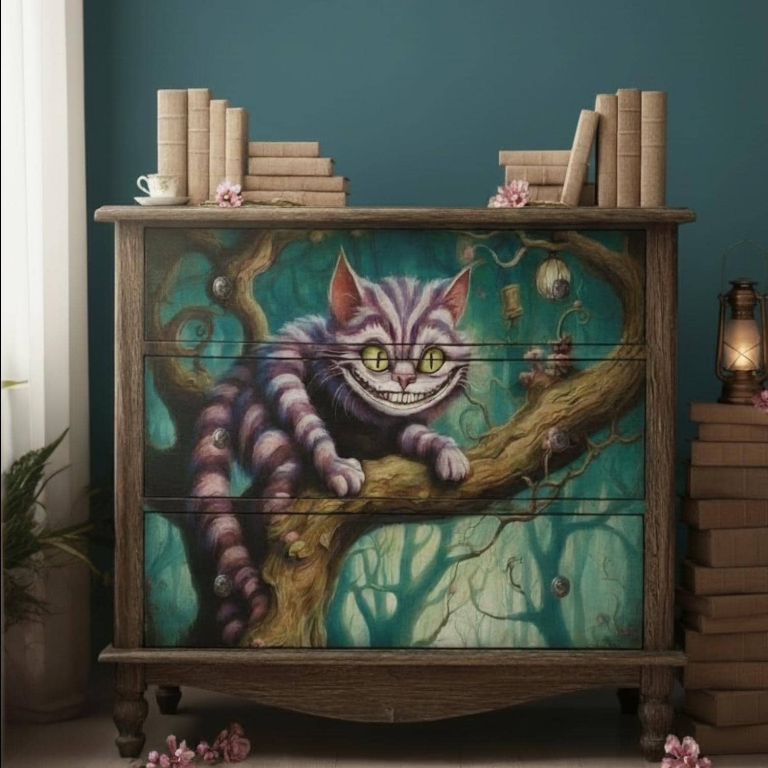 Dive into the enchanting world of Wonderland with this delightful decoupage paper featuring the iconic Cheshire Cat lounging in a tree. Perfect for scrapbooking, card making, or adding a touch of whimsy to your home decor, this high-quality paper captures the charm and mystery of Lewis Carroll's beloved tale. Suitable for crafters of all ages, this captivating design will inspire your creativity and bring a piece of Wonderland into your artistic projects.