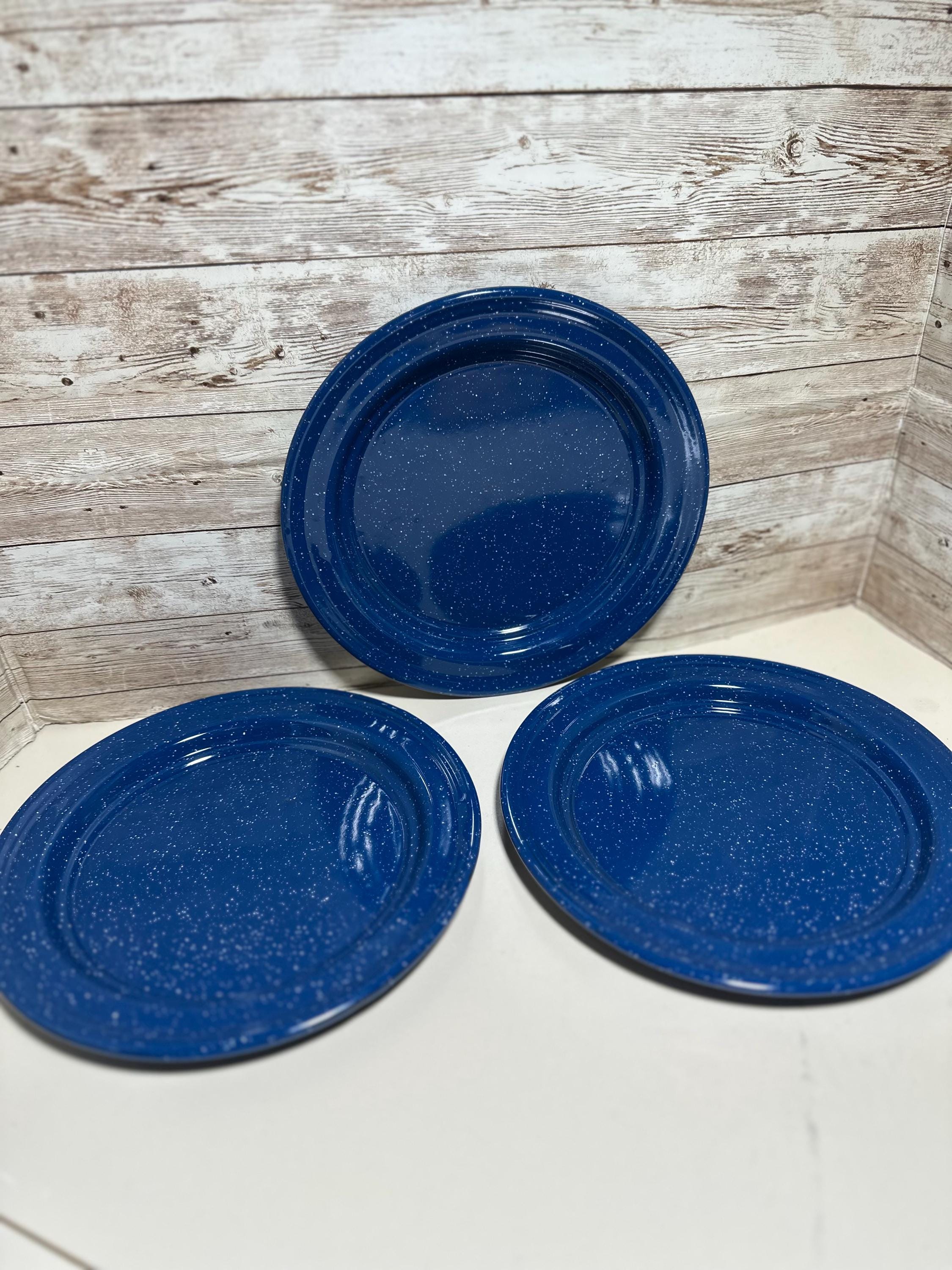 This set includes 3 finely blue speckled 8.5. W enamel granite ware dinner plates. These round plates are heat-resistant and easy to clean, making them perfect for camping and outdoor activities. The blue color adds a stylish touch to your tableware collection. Manufactured in the United States, Perfect for serving meals during camping trips or BBQs. **No Return Policy**