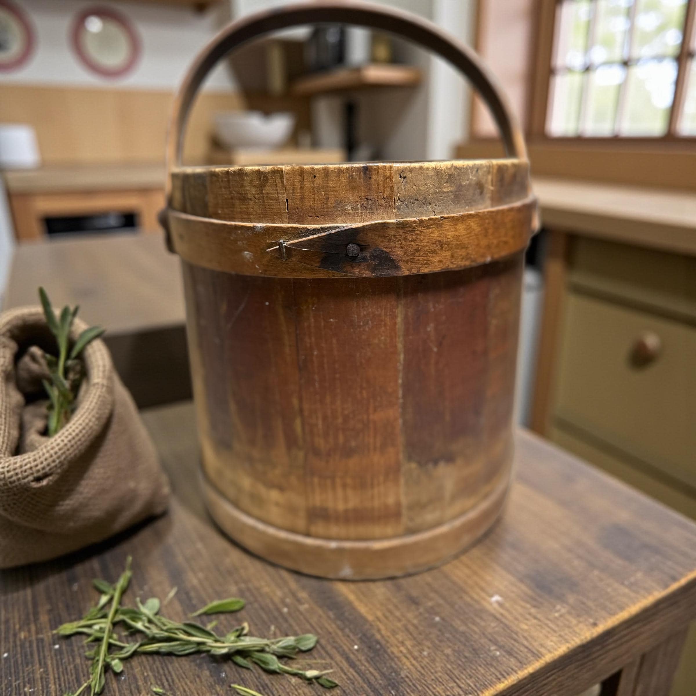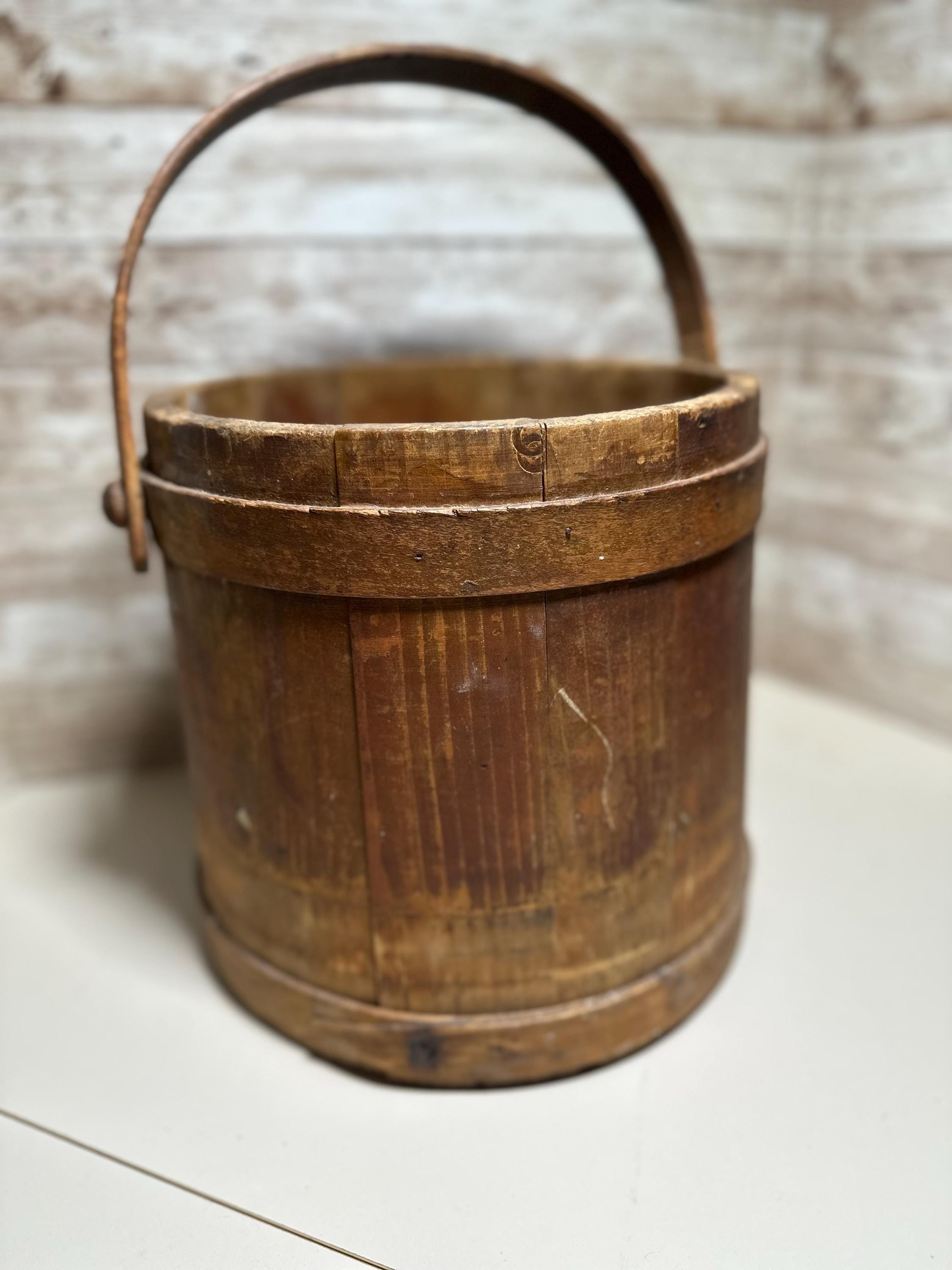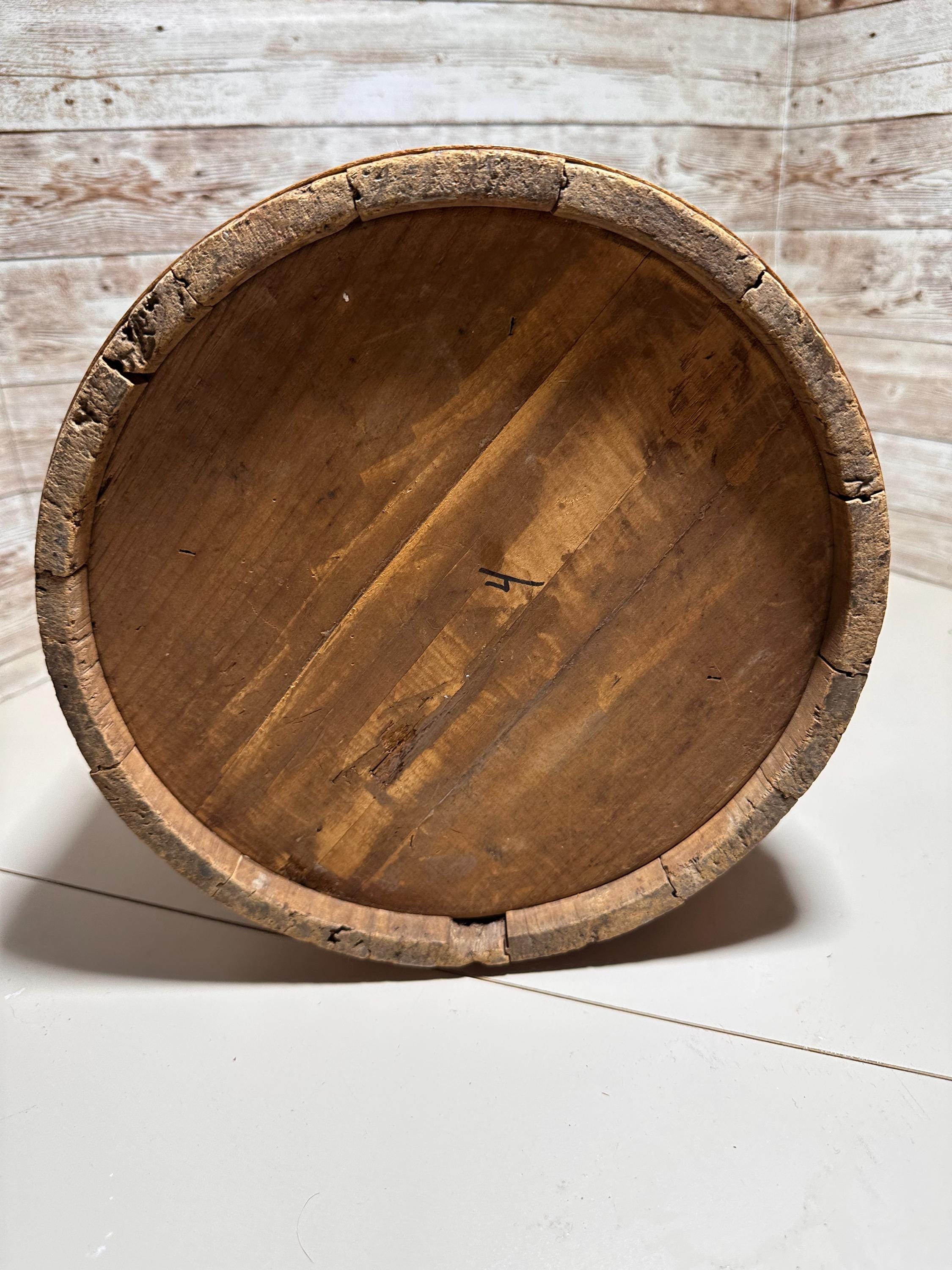 This Vintage Firkin Wood Bucket is a large, rustic wooden bucket with a medium wood tone color, perfect for farmhouse or primitive decor. The Americana style and original design make it a unique and charming addition to any antique or primitive collection. Handcrafted from wood, this unsigned bucket is not only functional but also adds a touch of historical elegance to any space. The intricate design and quality craftsmanship of this bucket make it a standout piece for any antique or primitive enthusiast. **No Return Policy**