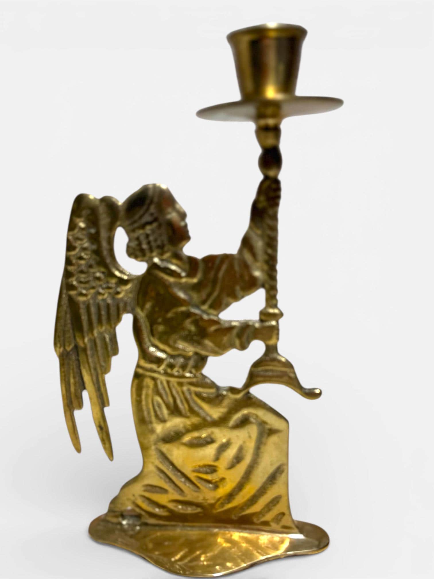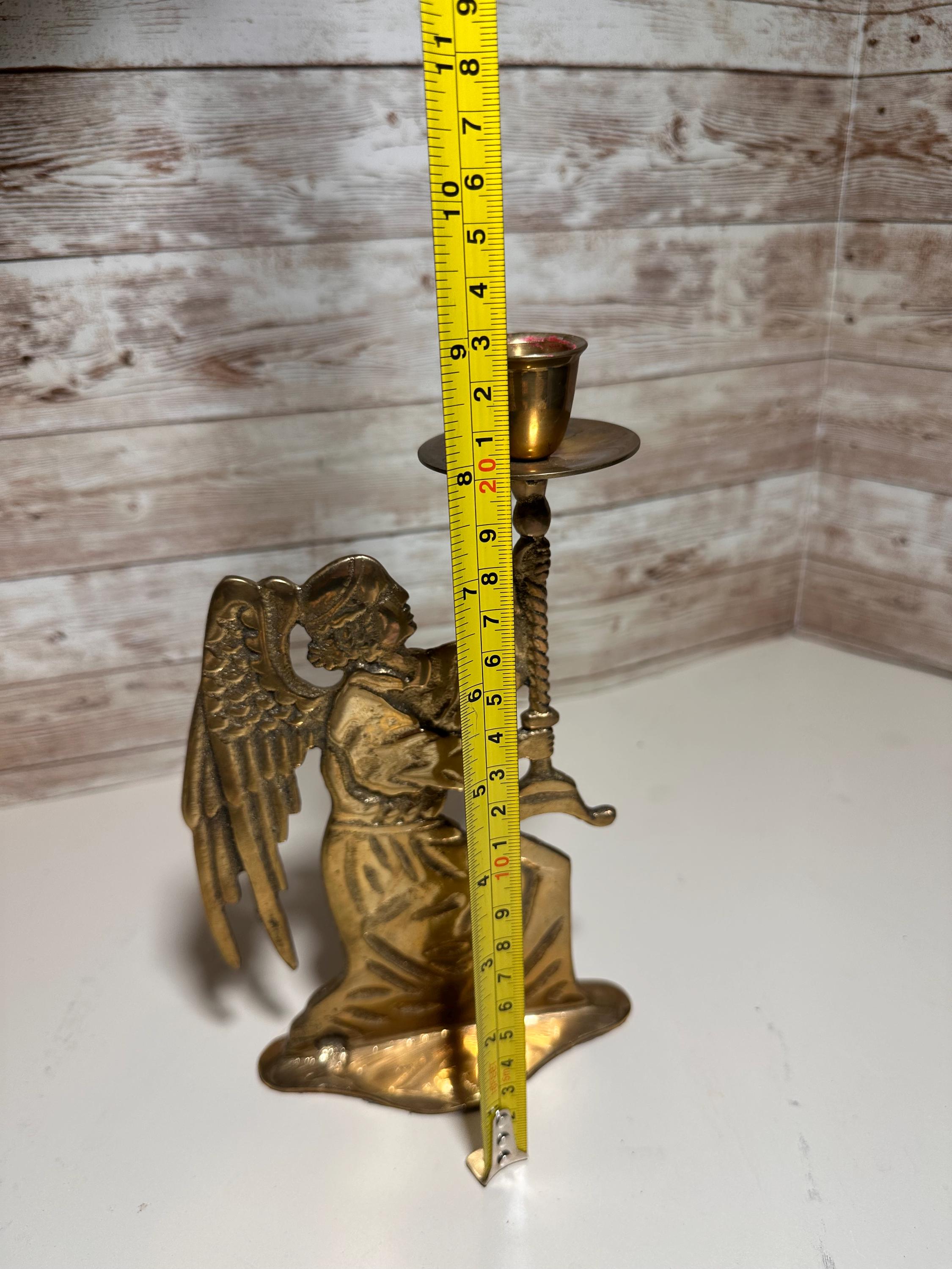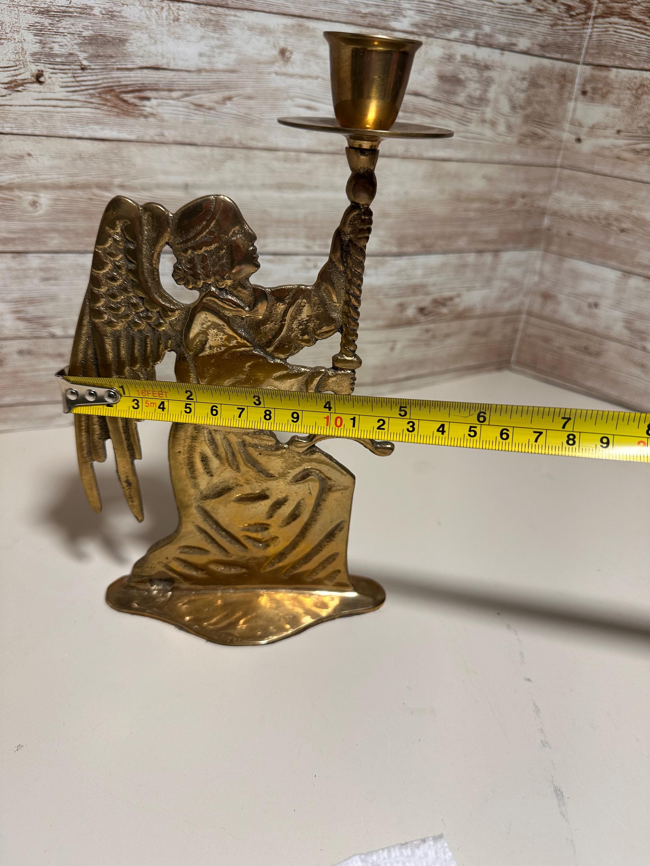 This Vintage Classic Brass Angel Candle Holder is a beautiful decorative piece perfect for the holiday season. Standing at 10 inches tall, this figurural candle holder features a traditional religious theme, making it suitable for any room in your home. Crafted from brass with an unpolished finish, this candle holder adds a touch of elegance to your furniture with its medium size and brass gold color. Made in India, this original piece is a unique addition to your Christmas decor collection. **No Return Policy**