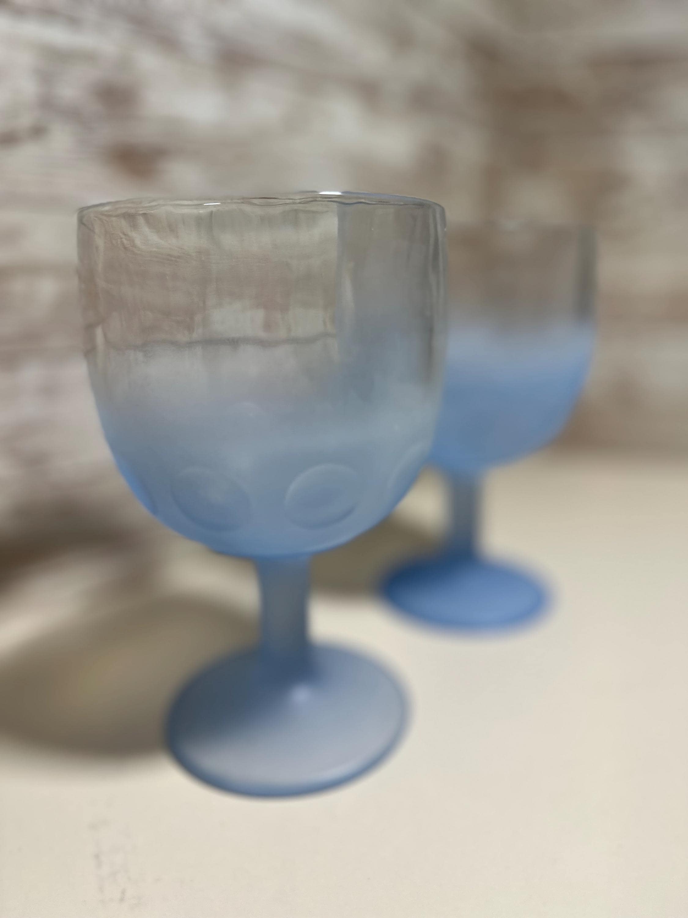 The product is a rare set of four vintage Frosted Blue and Clear Bartlett Collins Thumbprint Goblets from the 1960s. These round, mid-century modern style goblets feature a thumbprint pattern, clear stem pedestal, and frosted finish. Made of pressed glass in the United States, these goblets are perfect for all occasions and can hold up to 14 oz of liquid. The matte finish and unique design make them a standout addition to any drinkware collection. **No Return Policy**