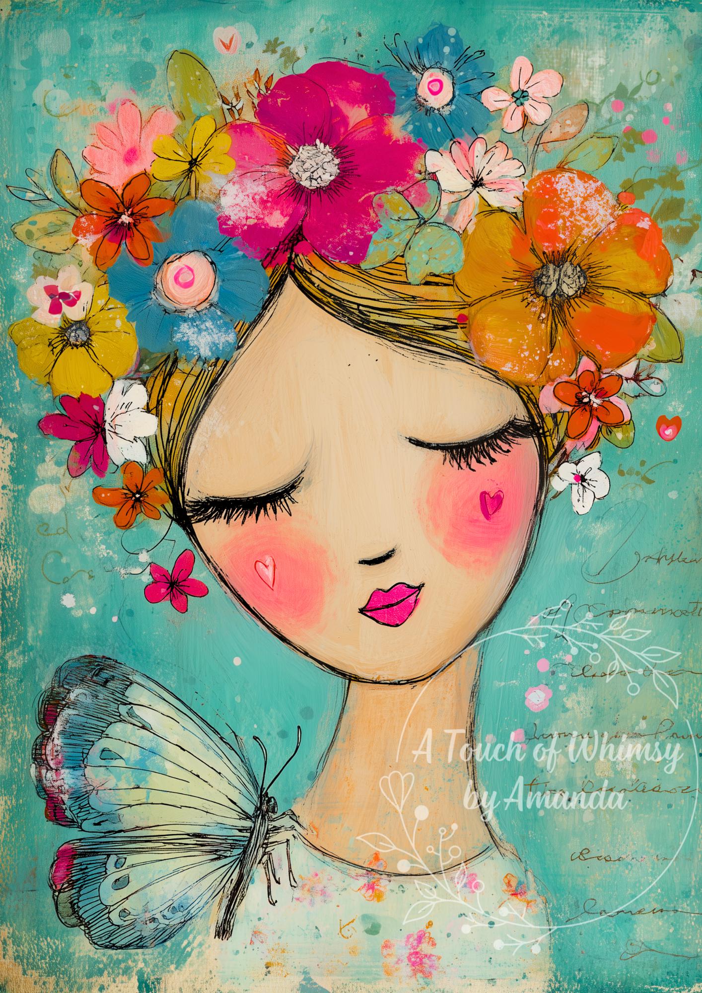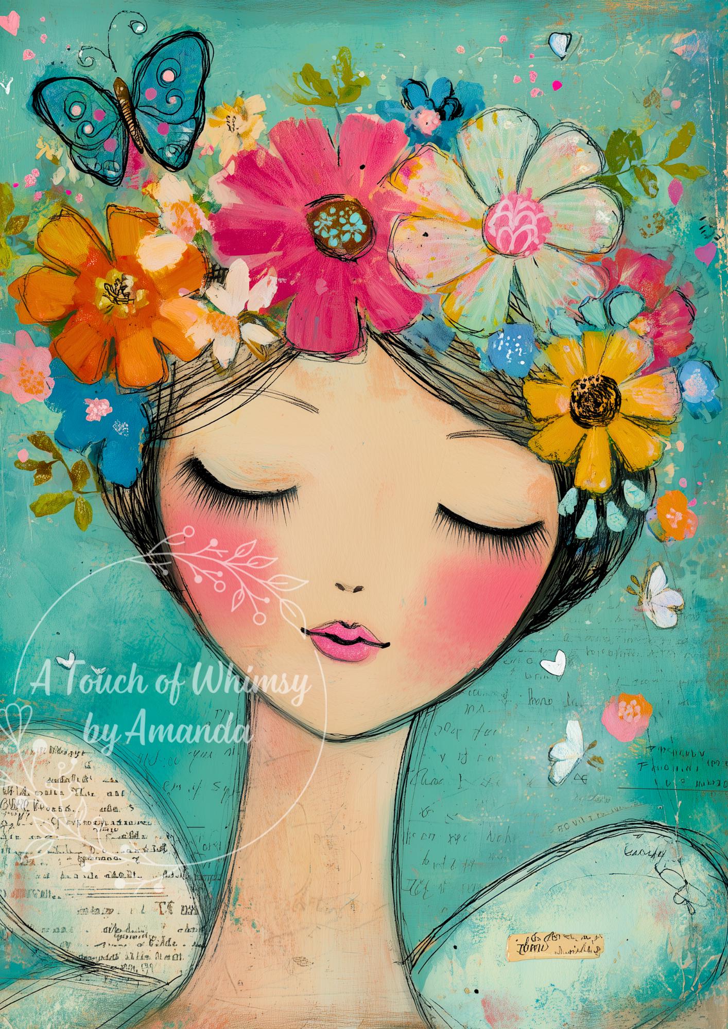 Immerse your space in whimsy with this vibrant mixed-media portrait. This artwork features a serene woman with closed eyes and exaggerated lashes, crowned by an explosion of bold pink, orange, and yellow flowers. Set against a textured teal background layered with vintage script and playful paint splatters, this design radiates a dreamy, bohemian energy.