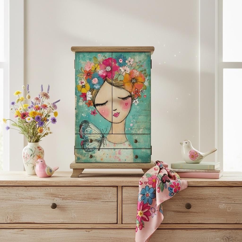 Theme: Whimsical folk art, bohemian floral, serene beauty.