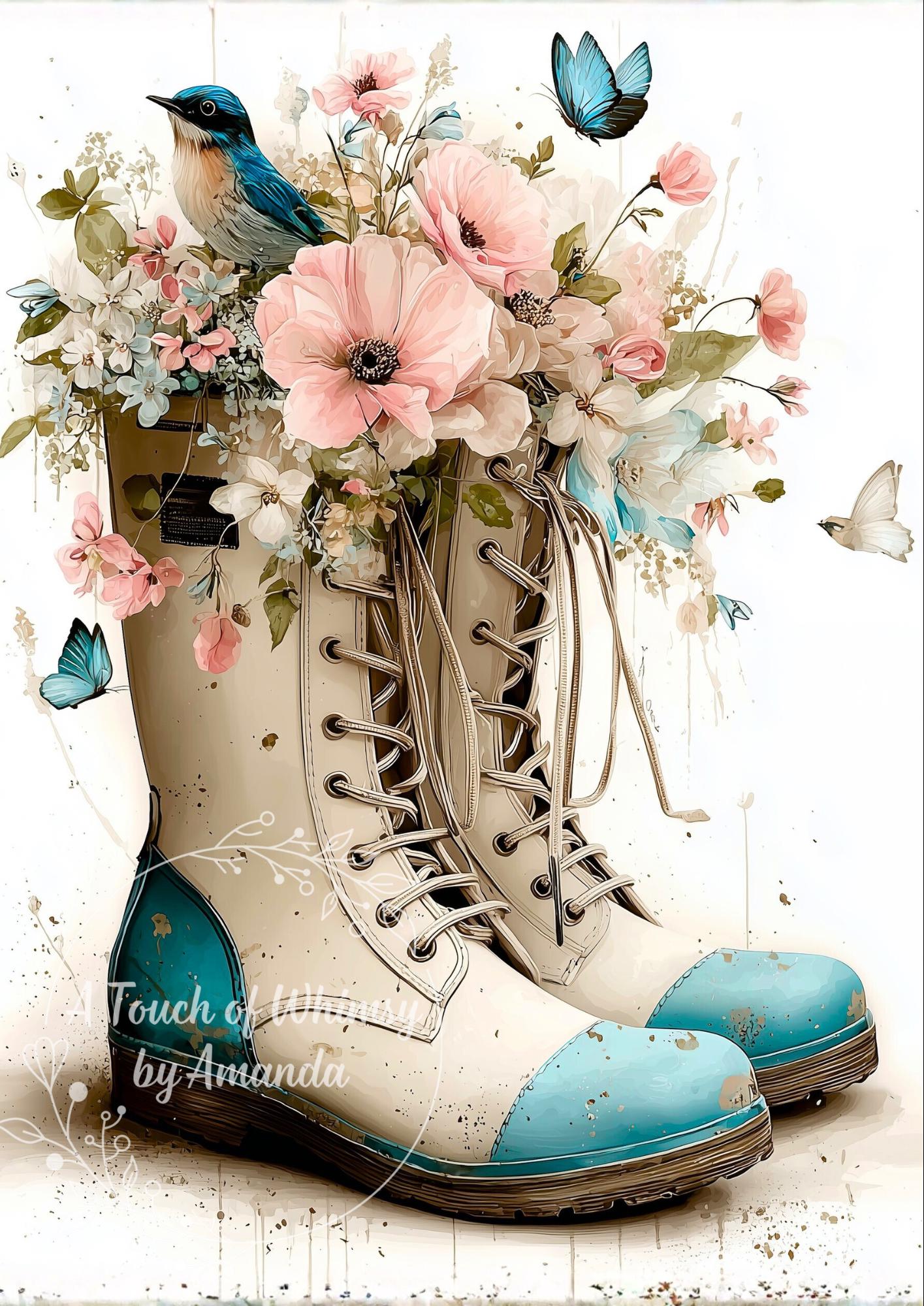 Combat Boots with Spring Flower Bouquet and Birds Butterflies Decoupage Tissue and A4 Rice Paper