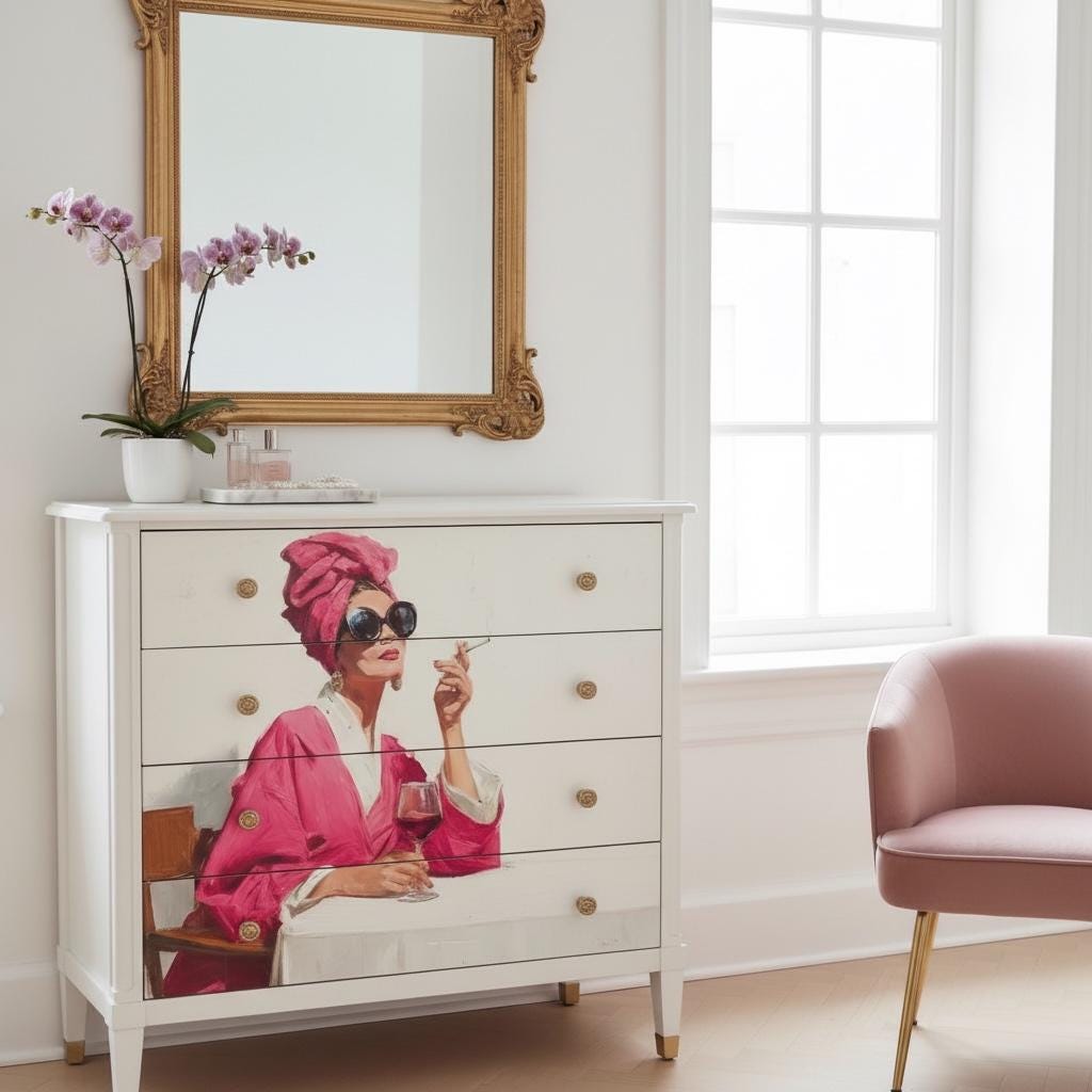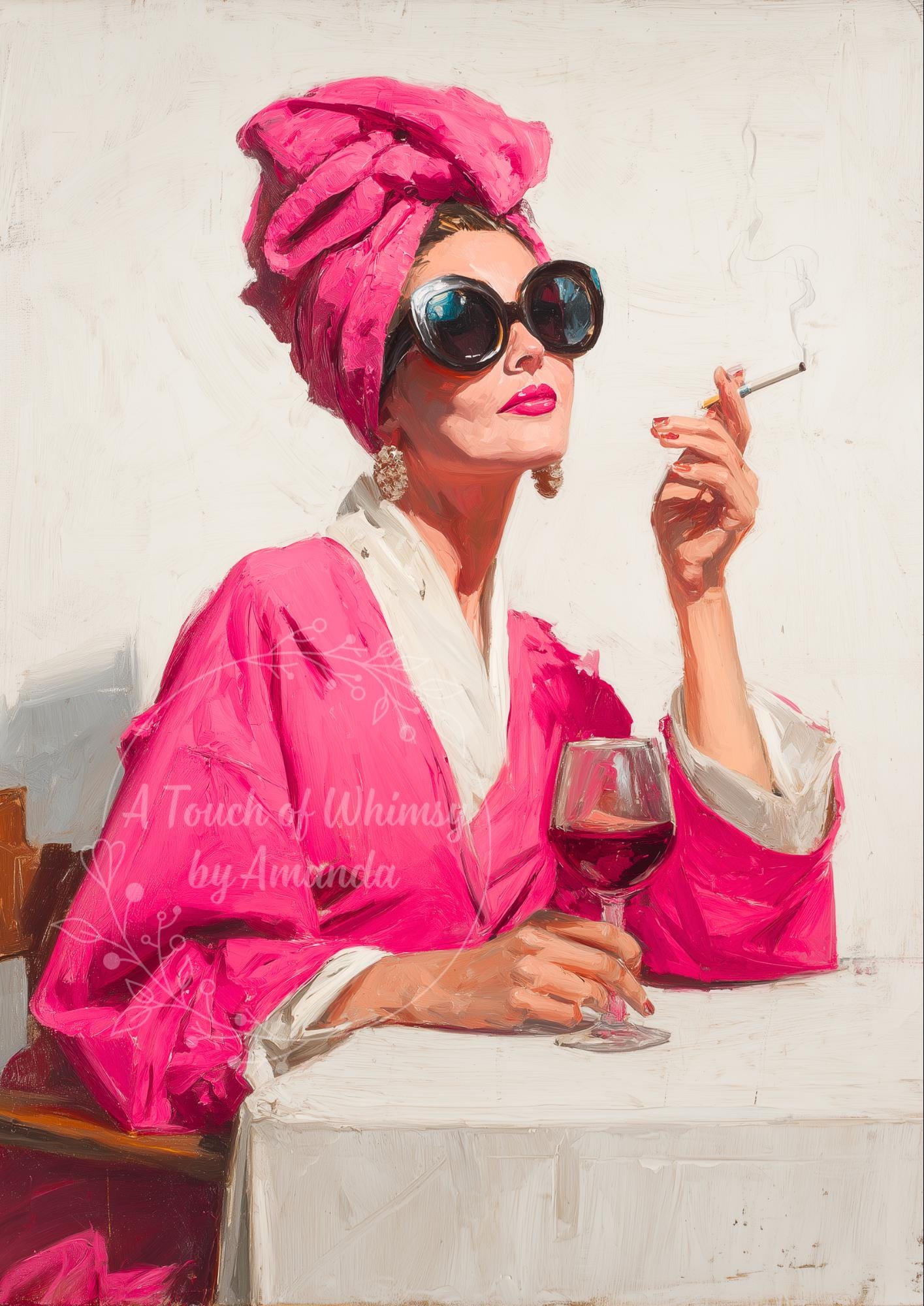 Glamorous Lady with Hair Towel Decoupage Rice Paper A4 - Wine & Sunglasses Art for Furniture Upcycling, Mixed Media Diva DIY Home Decor