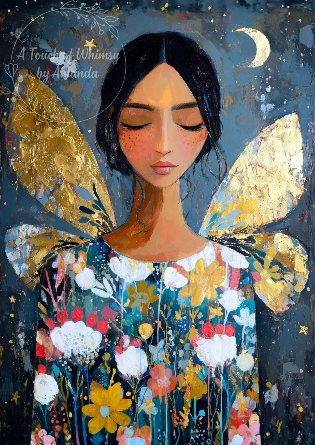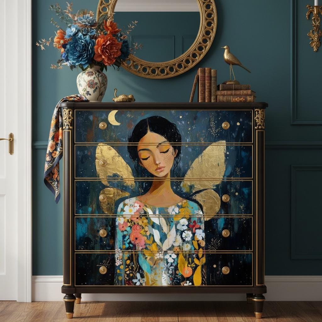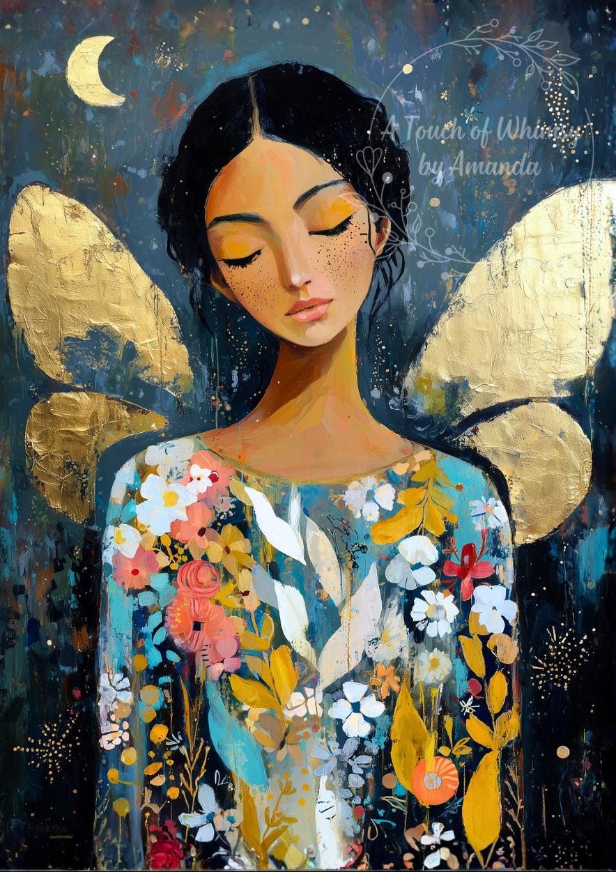 The design features a beautifully rendered fairy, her serene expression capturing a moment of pure fantasy. The true showstopper is her magnificent wings, detailed with a stunning metallic gold finish that shimmers and catches the light , adding a layer of luxury and dimension to your work. Printed on high-quality, durable rice paper, it is both delicate to the eye and resilient enough for a variety of applications.=