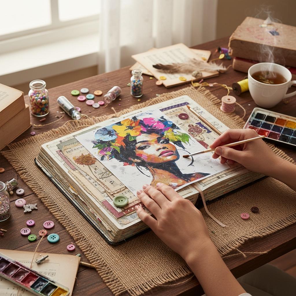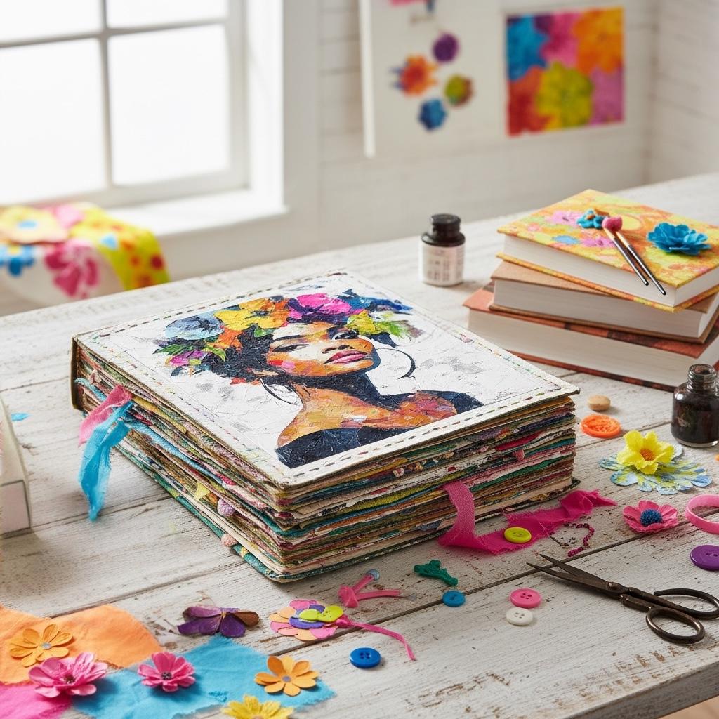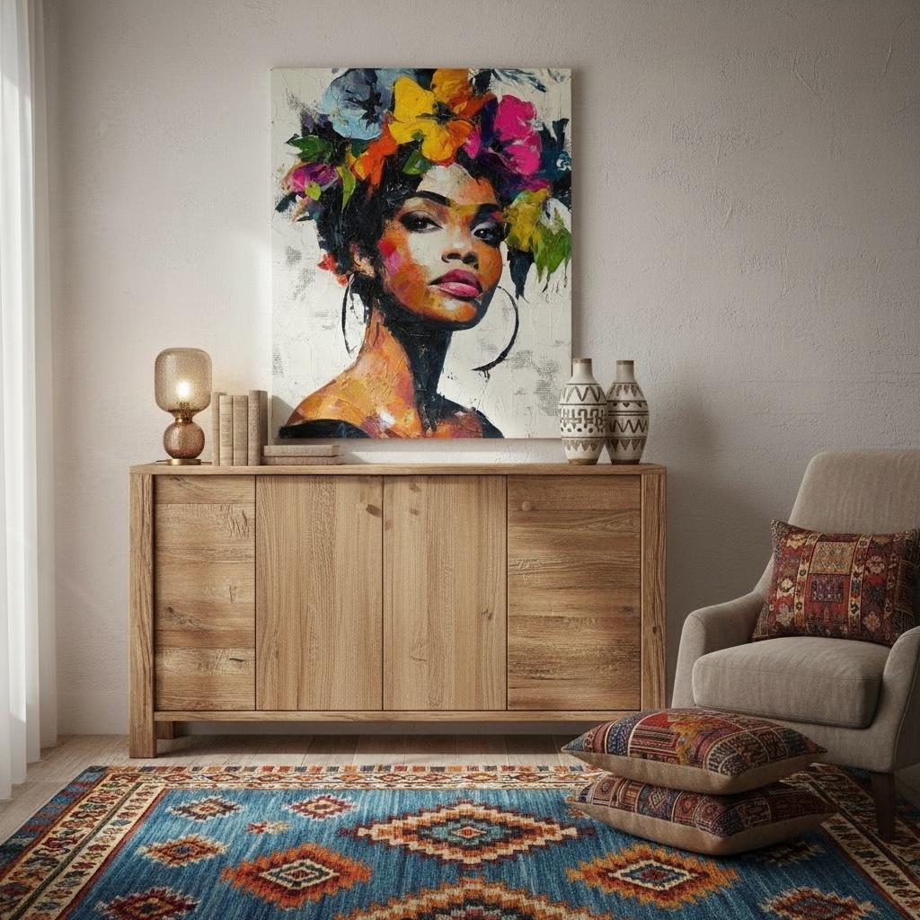 Breathe vibrant life into your DIY projects with this stunning abstract art paper. This design features a beautifully textured painting of a Black woman adorned with a magnificent crown of bright, colorful florals. The visual texture gives the piece a depth that looks like hand-painted canvas when applied.