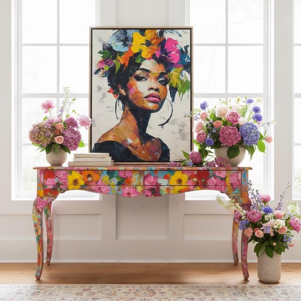 Theme: Vibrant florals, textured portrait, celebration of beauty.