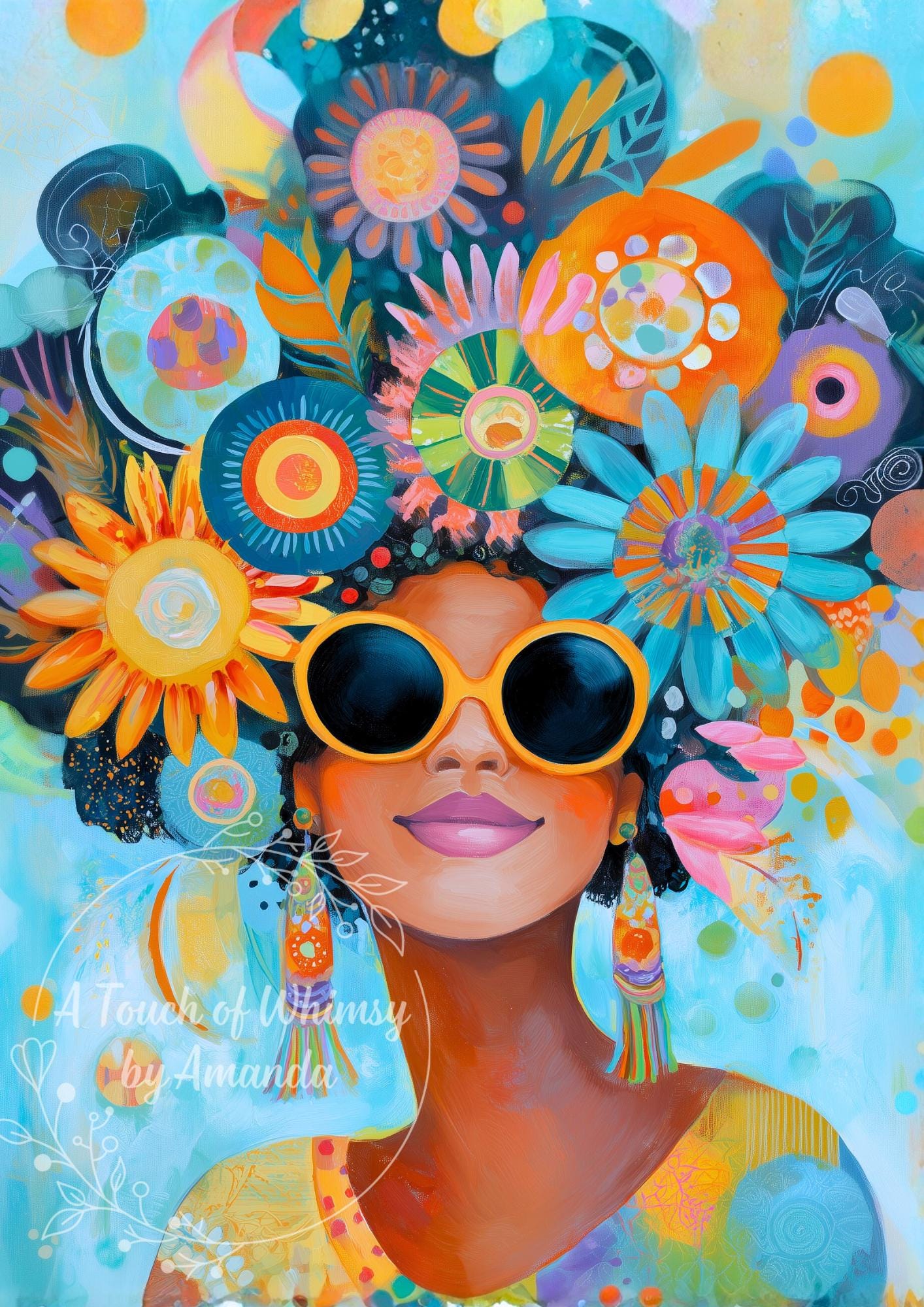 Add a pop of personality and color to your crafts with this bold, mixed-media style art paper. Featuring a stylish woman of color wearing oversized sunglasses and a "funky" hair arrangement of vibrant blue and orange florals, this design screams confidence and joy.