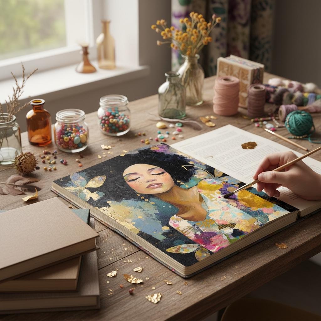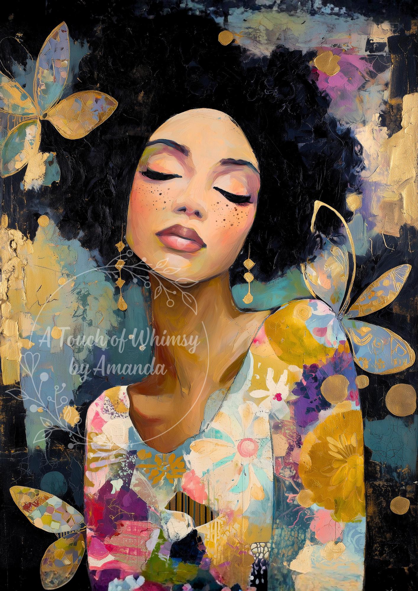 Transform your next DIY project with this stunning mixed-media style decoupage paper. Featuring a captivating abstract portrait of a Black woman, this design blends rich textures with elegant touches of gold and whimsical butterflies.